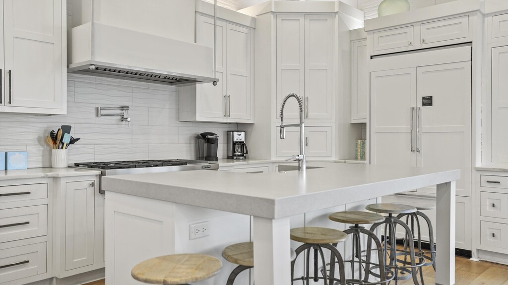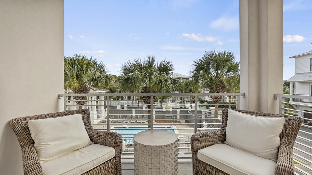 Inside, the open-concept living area features designer furnishings, a cozy fireplace, and a 75" Smart TV—perfect for gathering after a day in the sun. The gourmet kitchen boasts high-end appliances, quartz countertops, a large island, and ample seating for family meals or morning coffee. Multiple balconies throughout the home invite guests to take in the salty breeze and Gulf views, while two laundry rooms offer added convenience for longer stays.