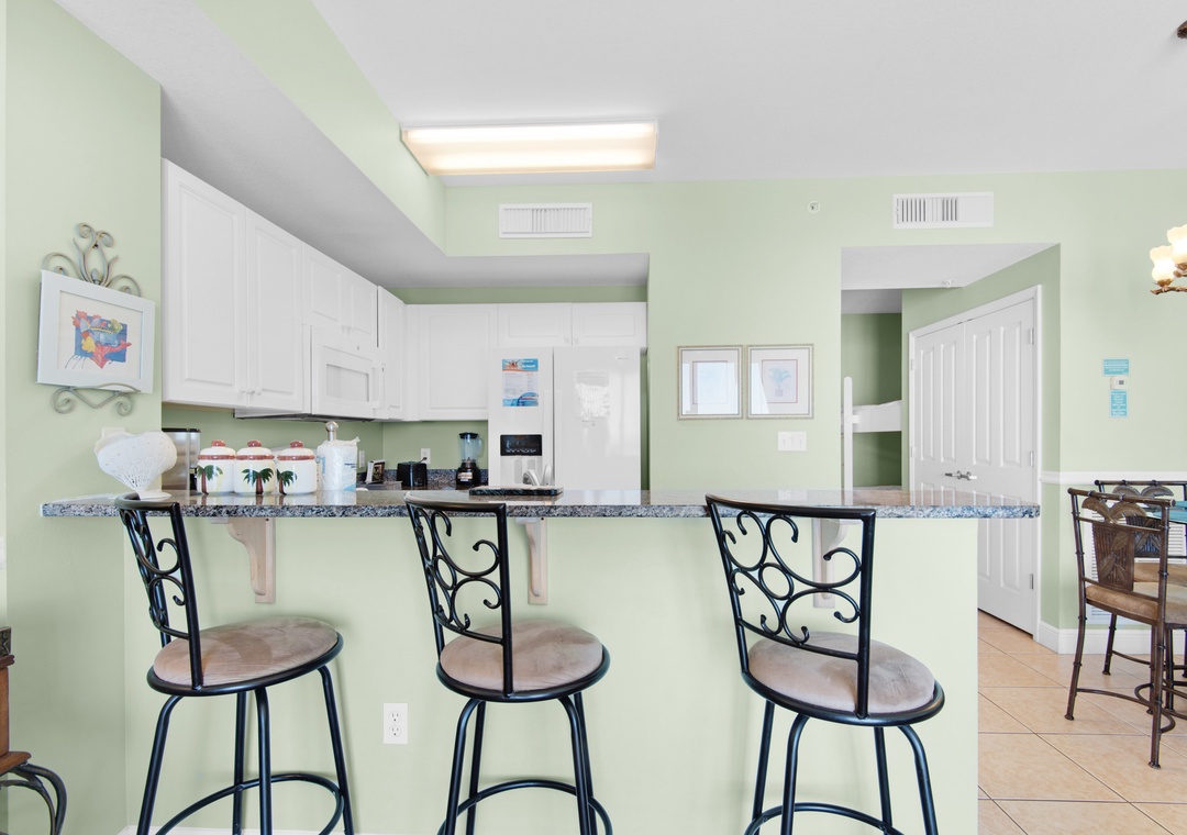 Loved the condo on the 7th floor. Amazing views from balcony. Spent a lot of time out there and the beach is right outside the condo. No street to cross to get to the beach was nice. Beach is beautiful and very clean. Quiet part of the beach on the West end. Full size kitchen so we were able to make any meal we wanted. Bed was comfortable. Perfect size condo for 2. If you had kids, the bunk beds tucked in the hallway would be good for them. Never tried the sleeper sofa. Can’t think of anything except no hot pads but that is minor. Stayed 2 weeks so had to get additional dishwasher detergent, garbage bags and toilet paper which we knew about ahead of time. Check in was without problems. Used the heated pool and hot tub across the street. Nice there is a walkway over the road to the parking garage. $40 parking fee for the parking garage. 3 elevators and usually only 2 worked but there wasn’t any wait. Might have a longer wait if it is busy season. Thomas donuts is a 15 minute walk from the condo so you can walk the beach there and back! I will definitely come back. Didn’t want to go home!!!- Reviewed On: 3/4/2023