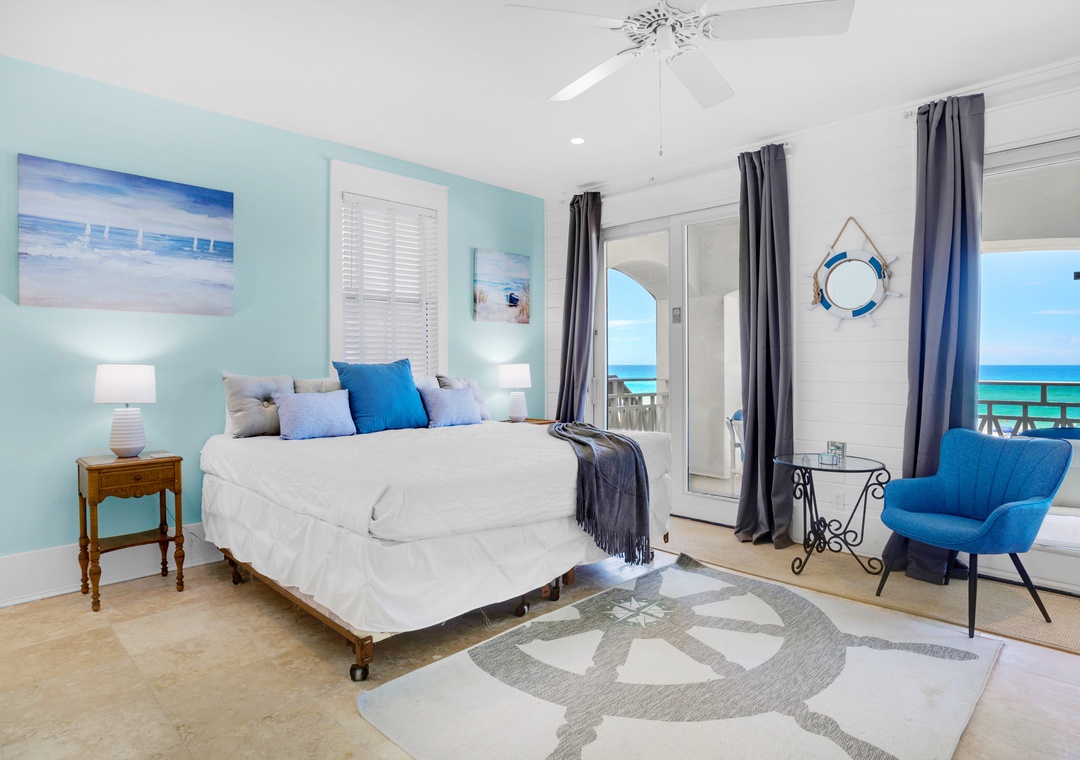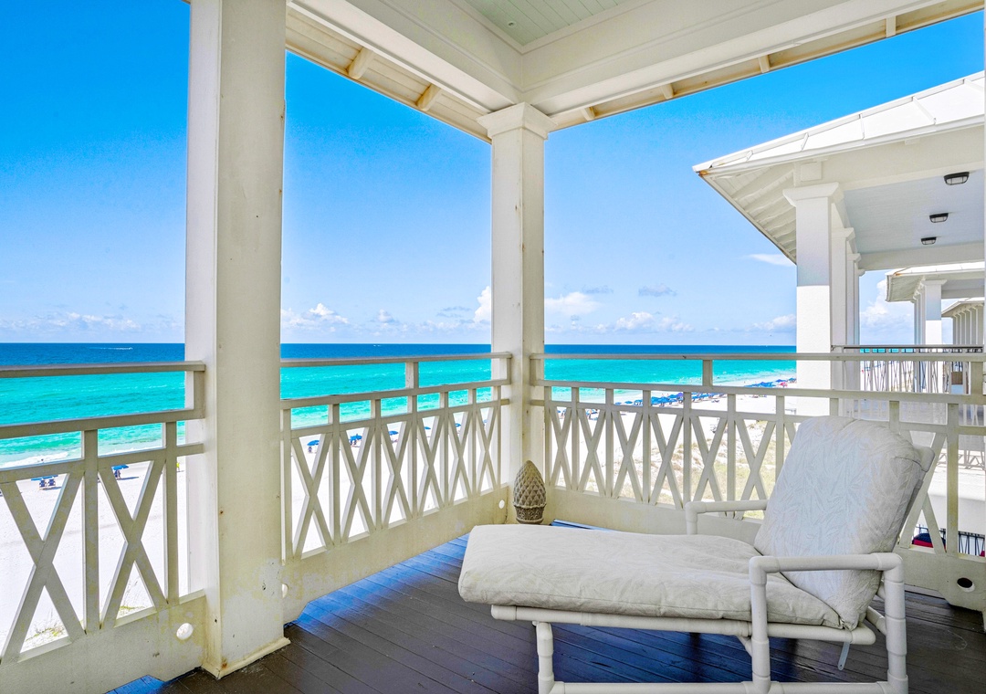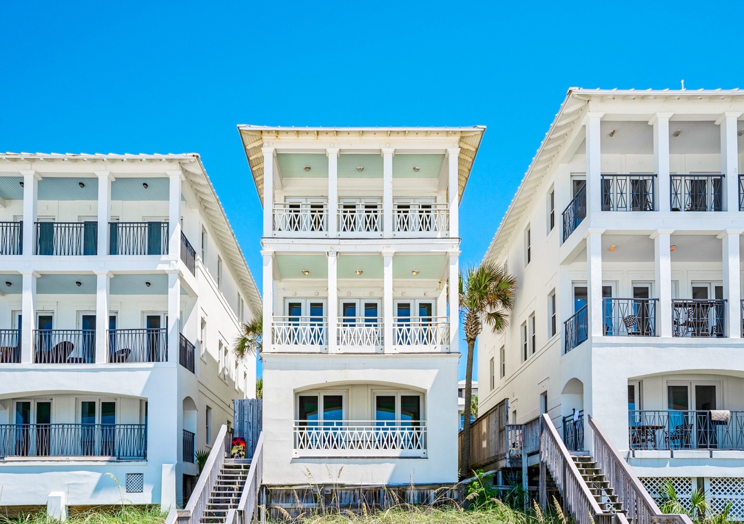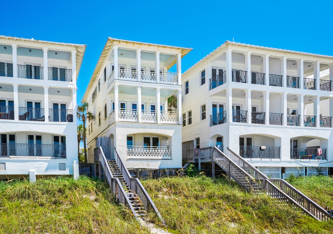 With 3 king bedrooms, a full bed, and a twin daybed with trundle, Charlie Boy sleeps up to 10 guests. Enjoy a fully equipped kitchen, private balconies overlooking the water, and your own staircase leading straight to the beach. After a day in the waves, rinse off in the solar-heated outdoor shower and unwind as the sun sets over the Gulf.