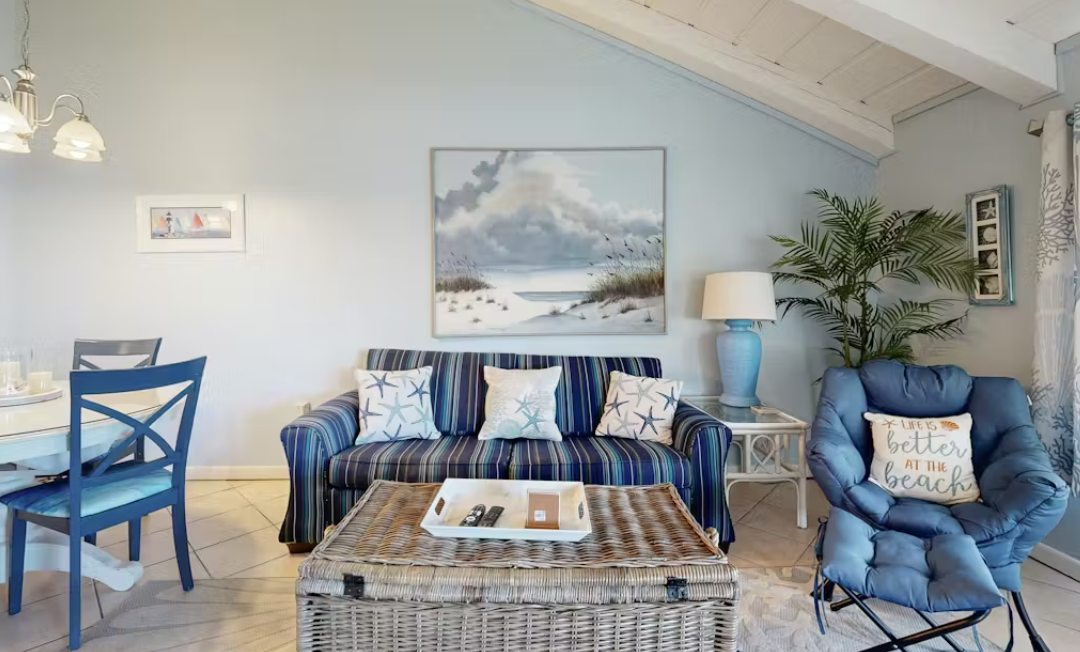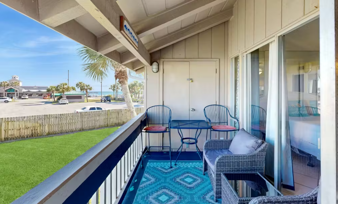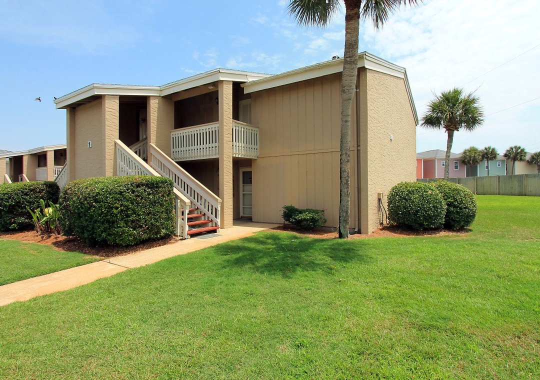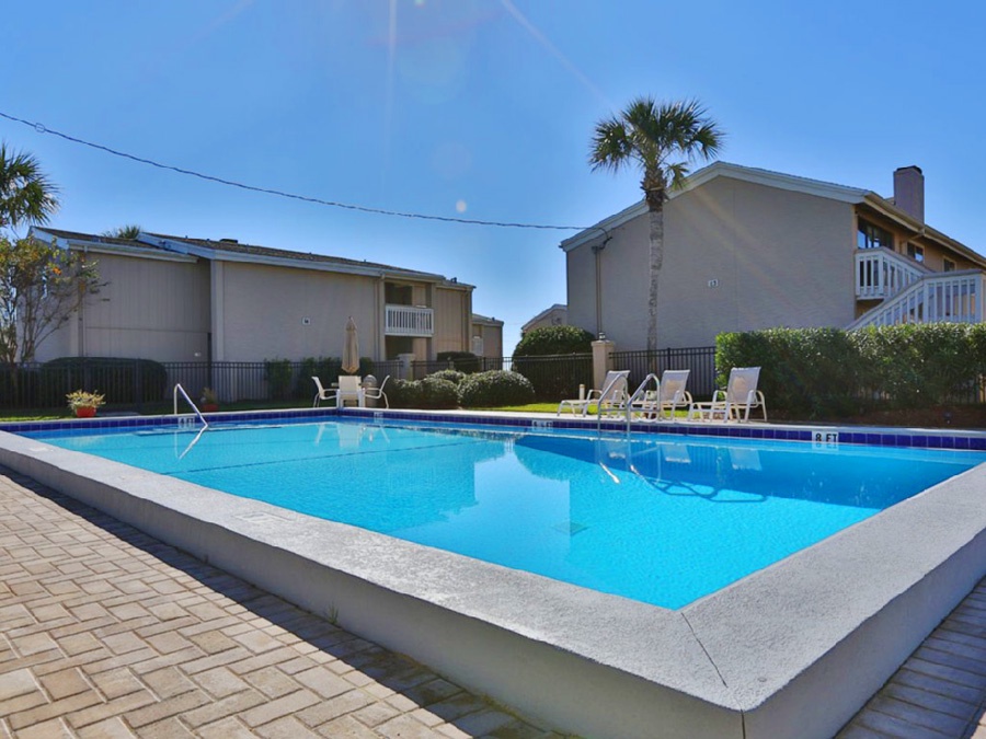 Welcome to Chateau La Mer #1D - A must see! This beachy condo is just 100 steps to a private beach on the beautiful Emerald Coast and within walking distance to several restaurants (Captain Dave’s across the street, Kenny D’s around the corner and less than a mile to Crab Trap and Pompano Joes). This nicely appointed condo offers a “peek a boo” view of the Gulf of Mexico right from the couch and sleeps 4 comfortably. This condo also offers a washer/dryer in the unit, a private patio, a shared pool, heated in the cooler months as well as tennis and pickle ball courts. Everything you need for your vacation adventures!