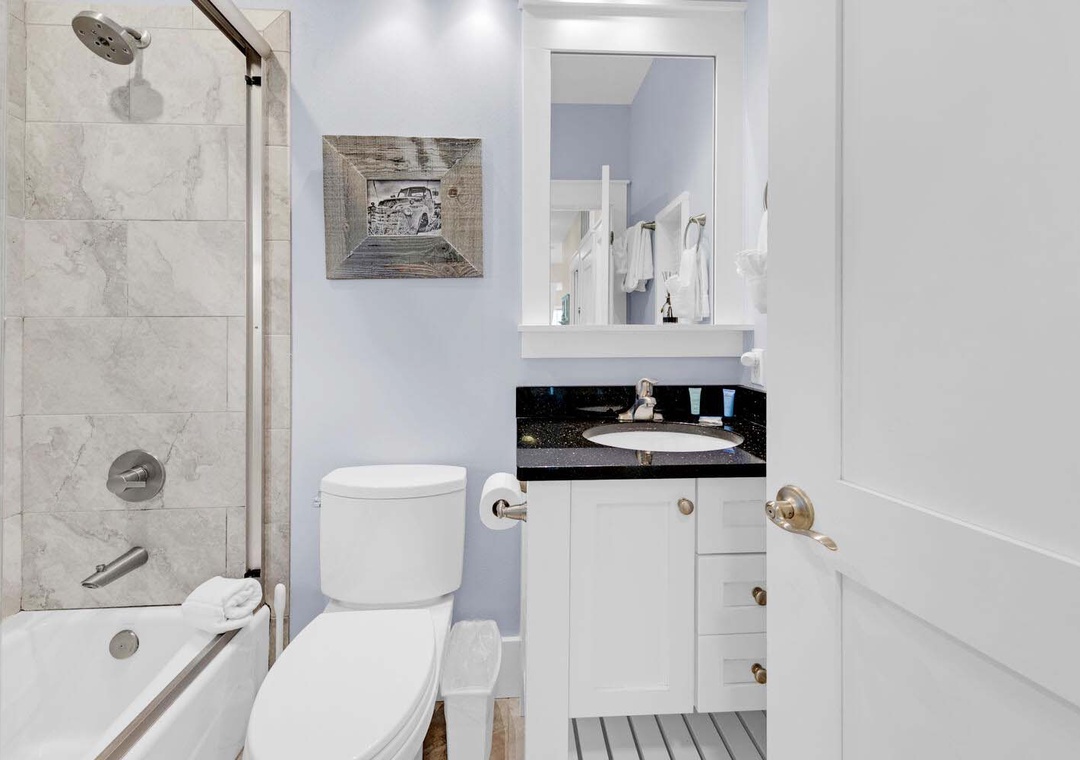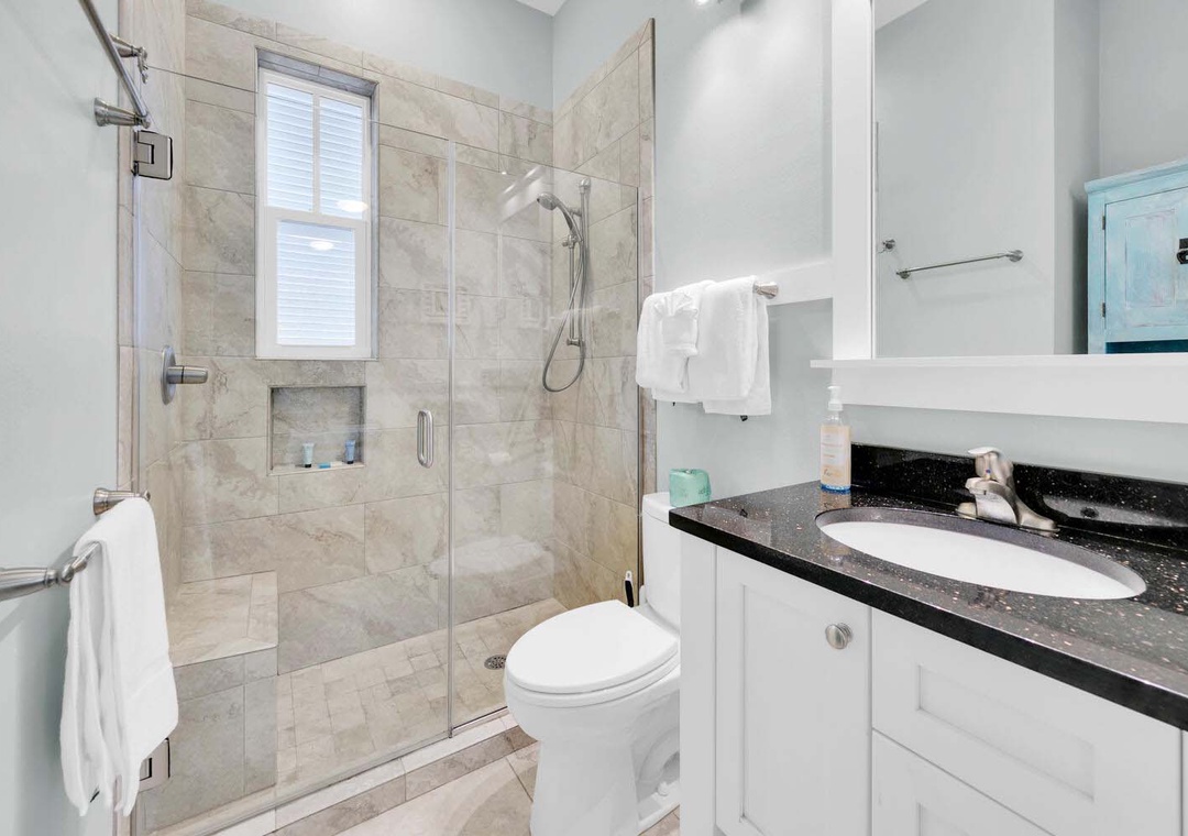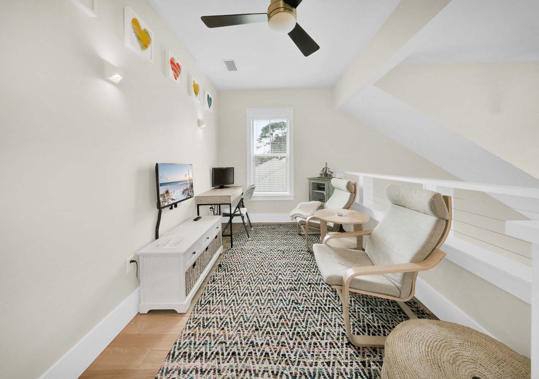 On the first floor, you’ll find the master suite with a king bed, private bathroom featuring a walk-in shower, and a serene screened-in porch overlooking a nature reserve. The second floor includes another king bedroom and a guest room with two sets of bunk beds, plus a full bathroom with a bathtub and an additional sink alcove for convenience. A cozy loft area overlooks the spacious two-story living room, creating the perfect space for quiet reflection, reading, or a refreshing afternoon nap.