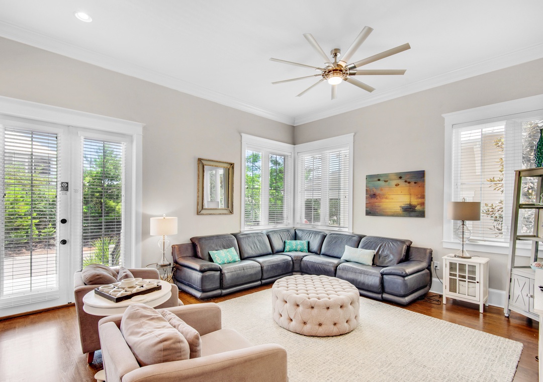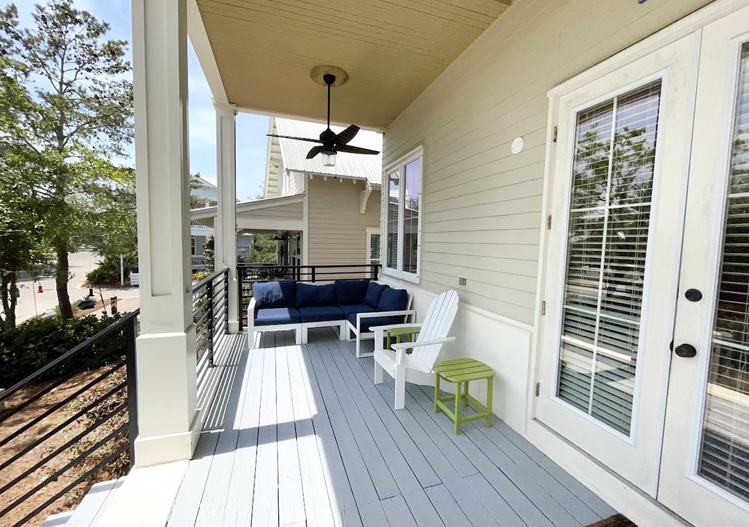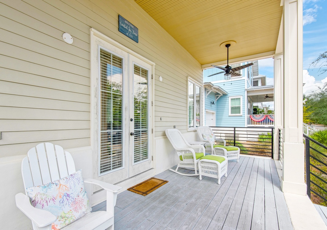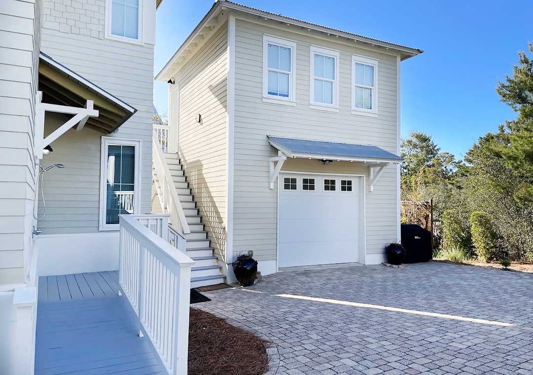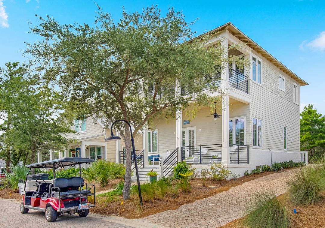 Coastal Joy on 30A is a gorgeous 5BR/4.5BA home in the Highland Parks community of Blue Mountain Beach, just off Hwy 30A. Under 1 mile to the beach, this stunning home features a bright, airy feel with gorgeous hardwood flooring, spacious patio and balcony, 12ft ceilings and custom millwork and cabinetry. When not enjoying the fabulous local restaurants nearby, fire up a home-cooked meal on the Viking gas stove! The main house offers 4 spacious bedrooms and 3.5 baths. Each bedroom features a flat screen TV, and the 2nd floor has new wood floors throughout. Additionally, there is a carriage house studio above the garage with a private entrance, a queen bed, full bathroom, and kitchenette. The spacious driveway and turnaround space allows ample room for everyone. Relax on the shaded porch and balcony in Adirondack chairs or take a short walk over to the pool pavilion for the world-class pool, viewing tower, grilling and entertainment. The new, burgundy 6-Seater Golf Cart is street legal and a huge convenience for this neighborhood. You can head to the beach or grab a treat at the Blue Mountain Beach Creamery!