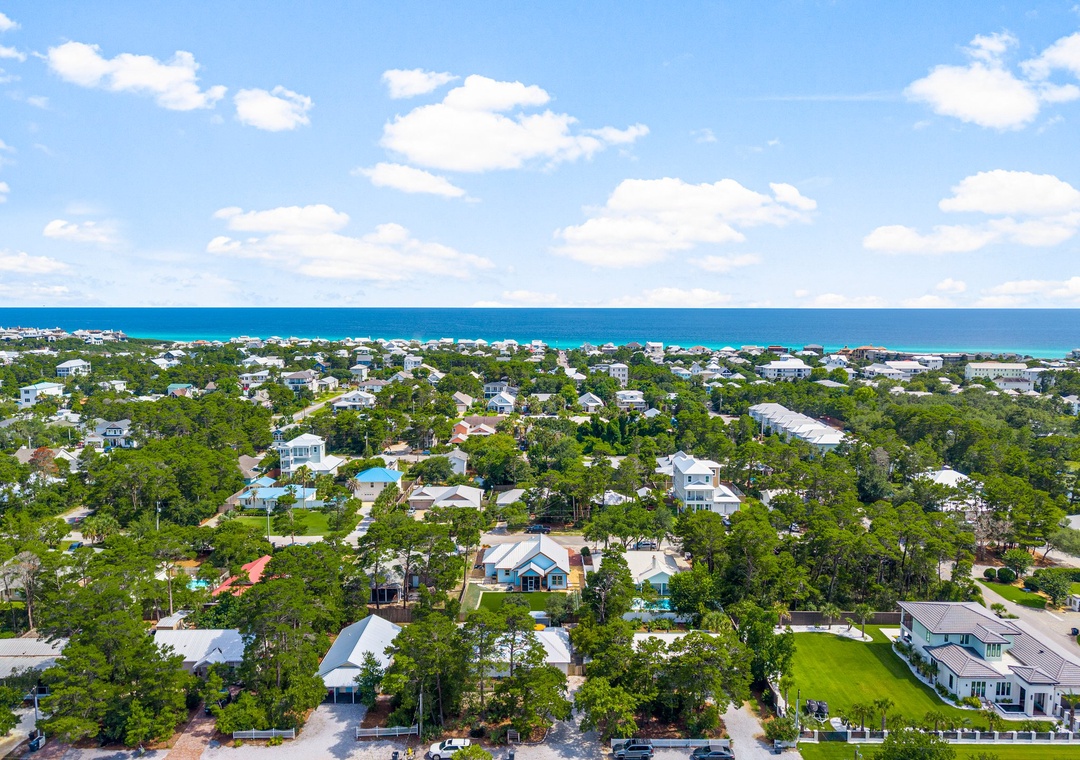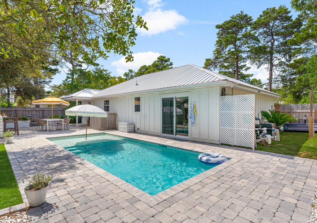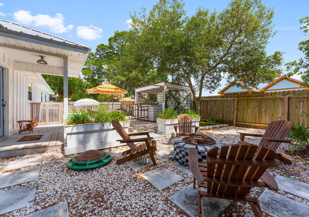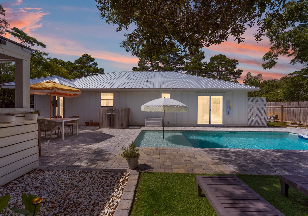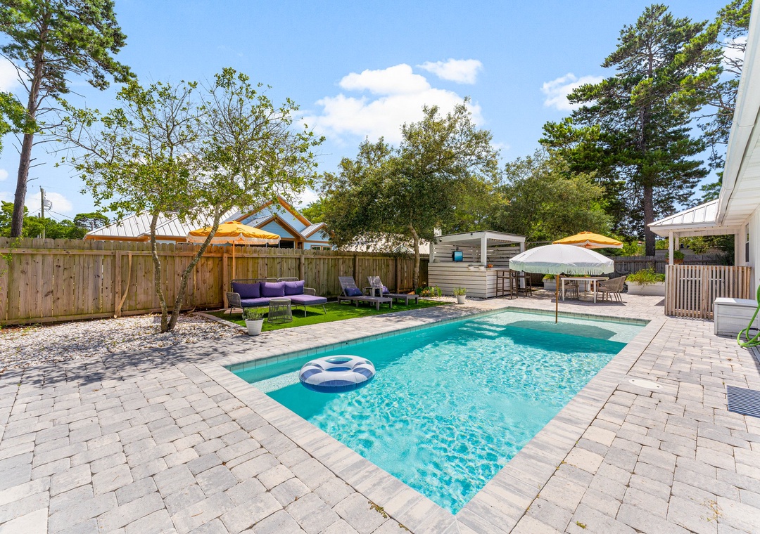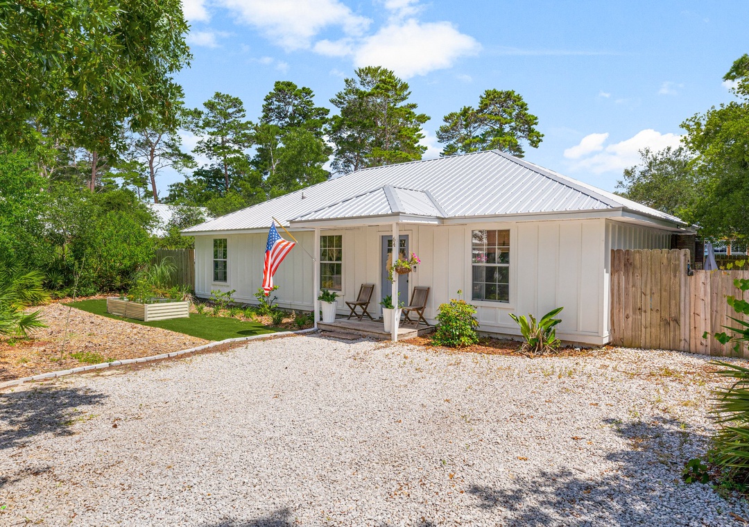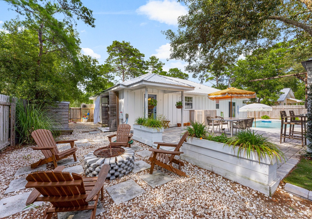 Welcome to Cottage Haven — a charming 3-bedroom, 2-bathroom retreat just a few blocks from the sought after 30A corridor. Surrounded by mature trees and a laid-back atmosphere, this open-concept home offers comfort, style, and convenience. The fully equipped kitchen has everything you need to prepare delicious meals for family and friends. The sleeping arrangements include a spacious king master suite, a cozy queen guest room, and a twin daybed in the third bedroom comfortably accommodating up to 5 guests. Step outside to your private oasis: a beautifully fenced backyard featuring a sparkling pool, firepit with cozy seating, and an outdoor bar perfect for enjoying lunch or evening cocktails. Whether you're cooling off after the beach or winding down under the stars, this space is made for relaxation. Take a leisurely bike ride or walk to the nearby beach and experience the best of 30A living. Discover why Cottage Haven is the vacation home you’ll want to return to again and again.