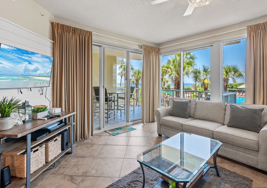 Escape to Crescent 109, a beautifully appointed 2-bedroom, 2-bathroom beachfront condo in Miramar Beach that comfortably sleeps up to 9 guests. This spacious first-floor retreat features a king bed in the master suite, a queen bed plus a twin-over-full bunk in the guest room, and a sleeper sofa in the living room. Both the living area and master bedroom open onto a large private terrace with views of the lush tropical gardens, resort pools, and the sparkling Gulf of Mexico just beyond. Enjoy easy access to the beach. Crescent 109 is the perfect setting for a relaxing and memorable beach getaway.