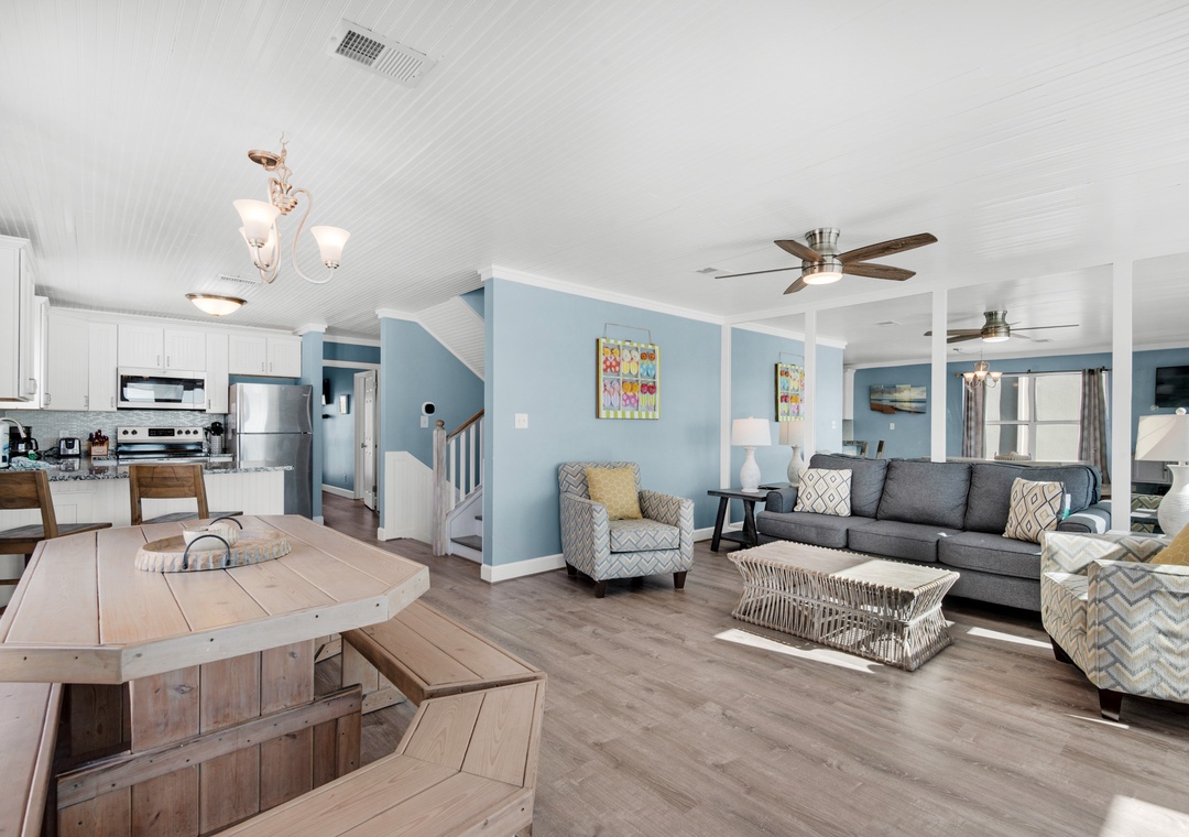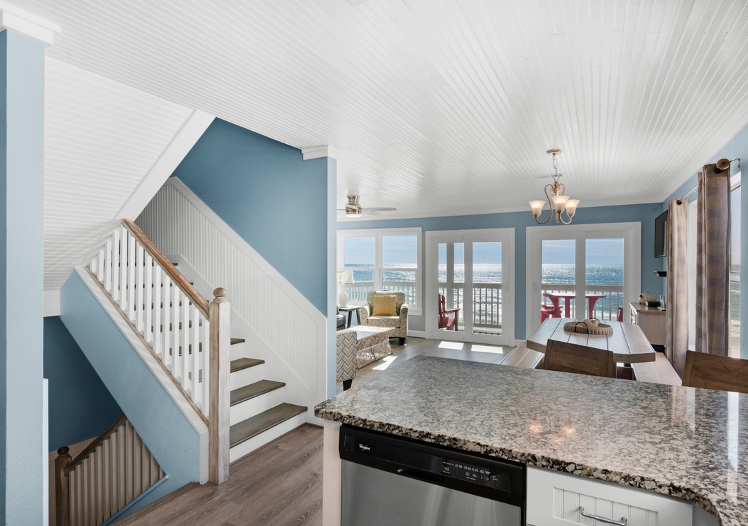 This spacious home sleeps 14 comfortably with 4 bedrooms with King beds, a bunk room with 8 twins, as well as a queen Sleeper Sofa. Enjoy plenty of living space, with the living room and kitchen on the second floor, a second mini kitchen in the first-floor master suite, and a second living room on the third floor. All bedrooms have TVs. The living area has a large flat screen and DVD player. There's a grill and washer/dryer. Come and make lasting family vacation memories at Crystal Breeze!