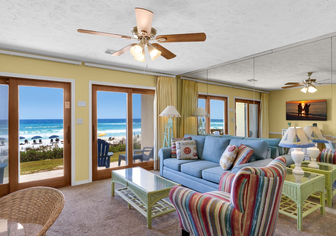 Crystal Villas A-2 is a wonderfully decorated 1 bedroom, 1 1/2 bath beach front, first floor condo in the Crystal Beach area of Destin. This unit is beautifully decorated in a cheery, beachy style with a king bed in the master, twin bunks in the hallway, and a queen sized pullout sofa. You have an extra half bath for the extra guests, and your own washer/dryer right in the condo. Enjoy sunset gulf views while cooking or enjoying a meal from the large open kitchen and dining area at Crystal Villas A-2!