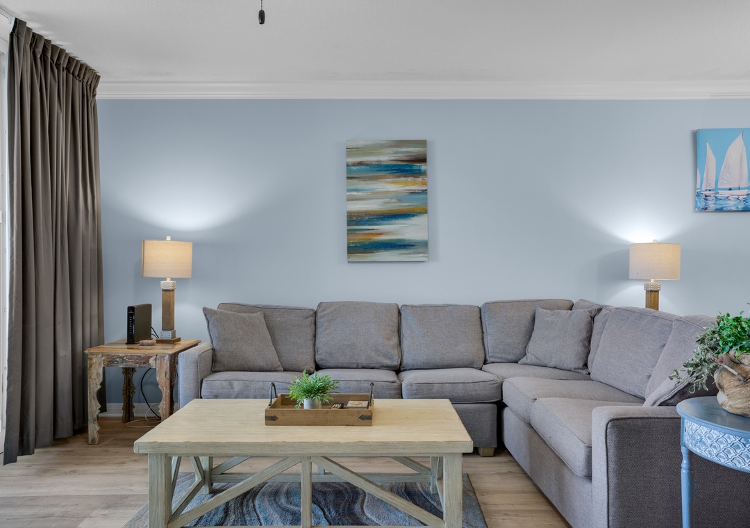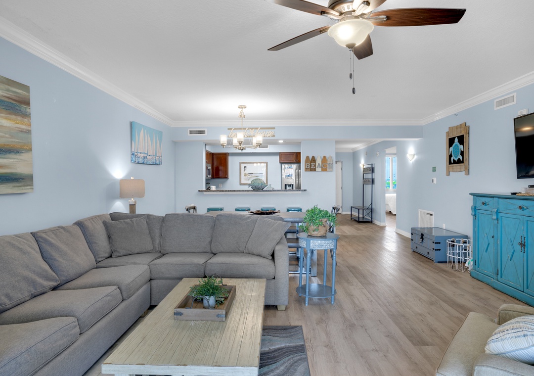 This place was great. It was in a perfect spot and was bigger than we expected. Full kitchen with everything you need for an extended stay. Plenty of towels, washer/dryer, multiple TVs for kids and guests to watch different things and plenty of space in the shared areas (kitchen, dining room and living room). Balcony overlooked the lazy river and bay side. You can see the beach from the front side.