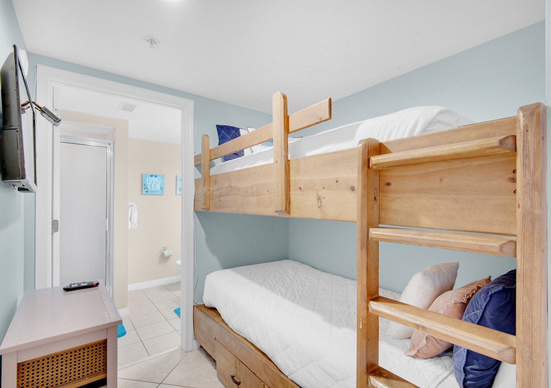 Nice condo, good floorplan for a family with two kids. Great pool!! We booked it primarily for the pool and the bunk room with its own bathroom. The master bed is a king and was comfortable to us. The employees at Destin West were friendly. The place was clean. The walk to the beach took about 10 minutes across the sky bridge. Could use some basic upgrades like a working hairdryer, better internet (was slow for us) new throw pillows on the sofa, towel rod fell off when we hung up a towel, but we fixed it. Some k-cups and beach toys/ chairs would be a nice touch. It was a good place, but no extras to make it feel welcoming. Adding those things would make it 5 stars.- Reviewed On: 7/7/2024