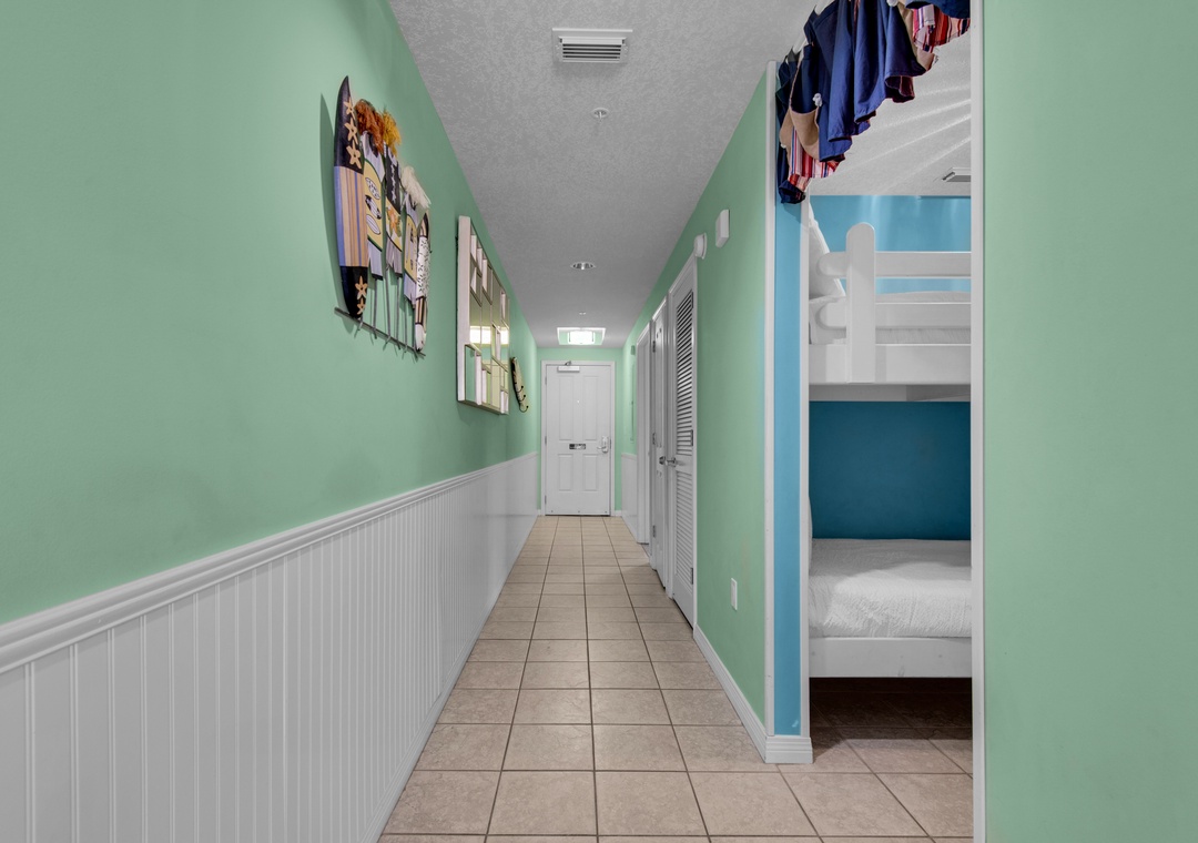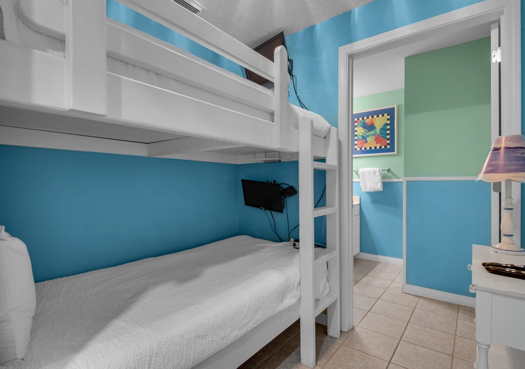 We were very pleased with our stay. We had 3 adults and 2 children. There was room for the pack n’ play in the master bedroom. The bed was extremely comfortable and large. Both bathrooms are great size. The master bedroom has a bathtub/shower. The second room with the bunk beds has a smaller bathroom with a shower. The bunk beds are comfy and spacious enough for an adult to fit. My husband is 6ft and fit. The living room has a pull out couch (queen size) which was reasonably comfortable. The kitchen has all utensils and dishwasher. We made pizza in the oven one night and were delighted to see a pizza cutter was in the drawer. Plus a pan. The room has a washer and dryer which was awesome! The balcony overlooks the pool on the second floor and you can see some of the gulf! Beautiful view! The only con which I can say is understandable given you’re coming from the beach is the floors were filthy. Our feet were black from the floor. They could use a really good clean. The sliding door needs to be fixed. Very hard to open and close but we managed. Those cons wouldn’t keep me from coming again, i definitely would stay here again. It would be nice to see those be corrected. We enjoyed the pools so much! The condo was in walking distance to the island next door which has amazing breakfast buffet. Then the resort next to them has lots of restaurants. Walking distance to beach bars, gift shops and more. You can bring your own pool floats with to use in the pool.- Reviewed On: 6/28/2023