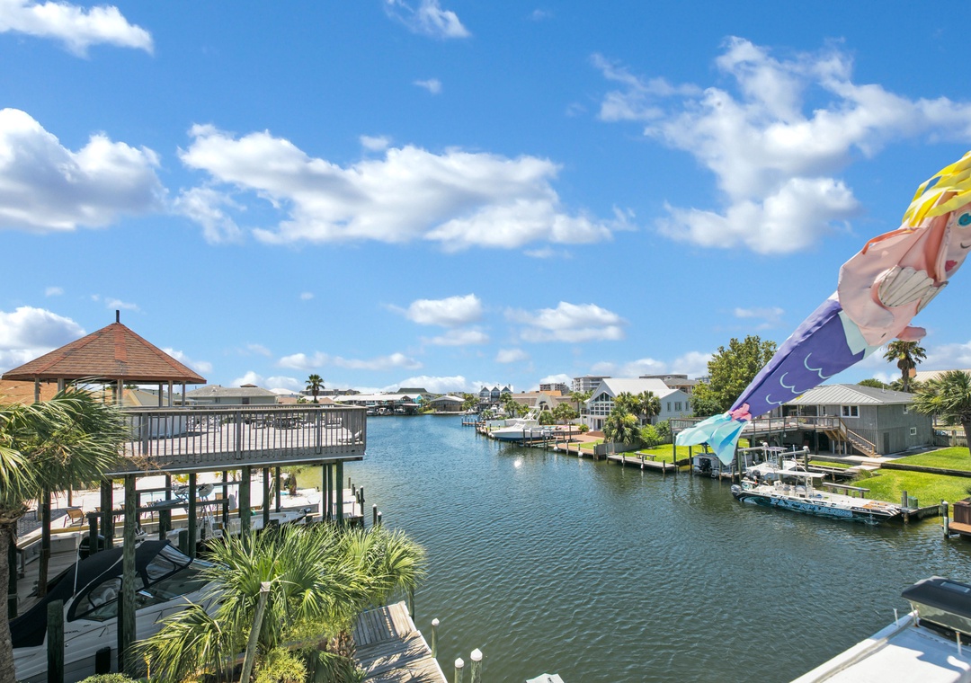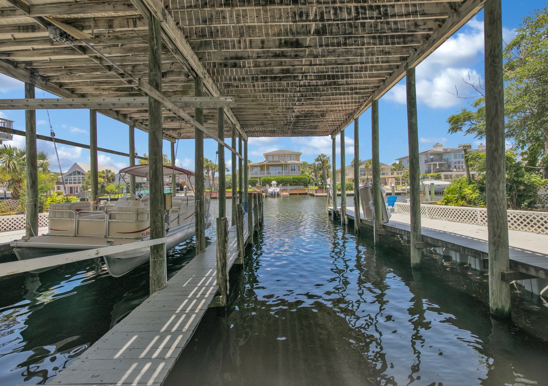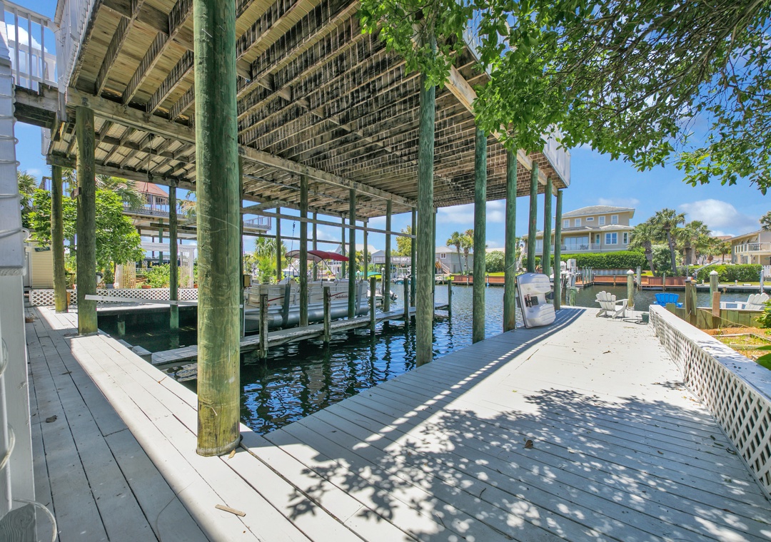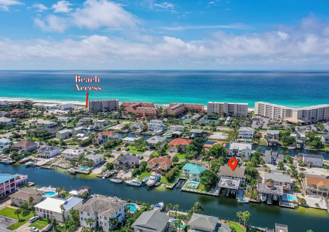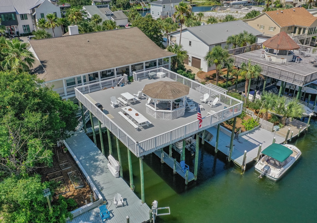 Calling all outdoor enthusiasts; have your next vacation be a Destin-A-tion on the Water. This spacious 5 bedroom, 4.5 bath waterfront home accommodates up to 10 guests and is located on Holiday Isle with plenty of outdoor living space. Relax on one of two wraparound porches while enjoying views of the Destin Harbor and the Gulf of Mexico. The first floor offers a spacious kitchen, living room, guest room with a king bed and en suite bathroom, and an open queen bedroom with privacy screen (no door for this bedroom). The balcony on the first floor includes a wet bar and plenty of seating. Stroll upstairs to the second floor to find a beautiful kitchen, living room with a decorative fireplace, half bath and remaining bedrooms. The master bedroom offers amazing views, king bed, en suite bathroom with dual vanities, balcony access, and office space. The two additional guest rooms offer full beds, en suite bathrooms, and balcony accesses. The second-floor balcony includes plenty of space to soak up the sunshine. Guests can bring personal paddle boards or kayaks and launch directly from the dock or enjoy cruising Holiday Isle with 2 available bikes at the home. Guests can also rent the empty boat slip for an additional fee. Visit Destin-A-tion on the Water, where the water is always calling your name.