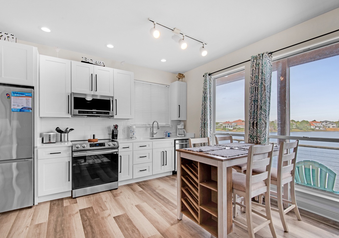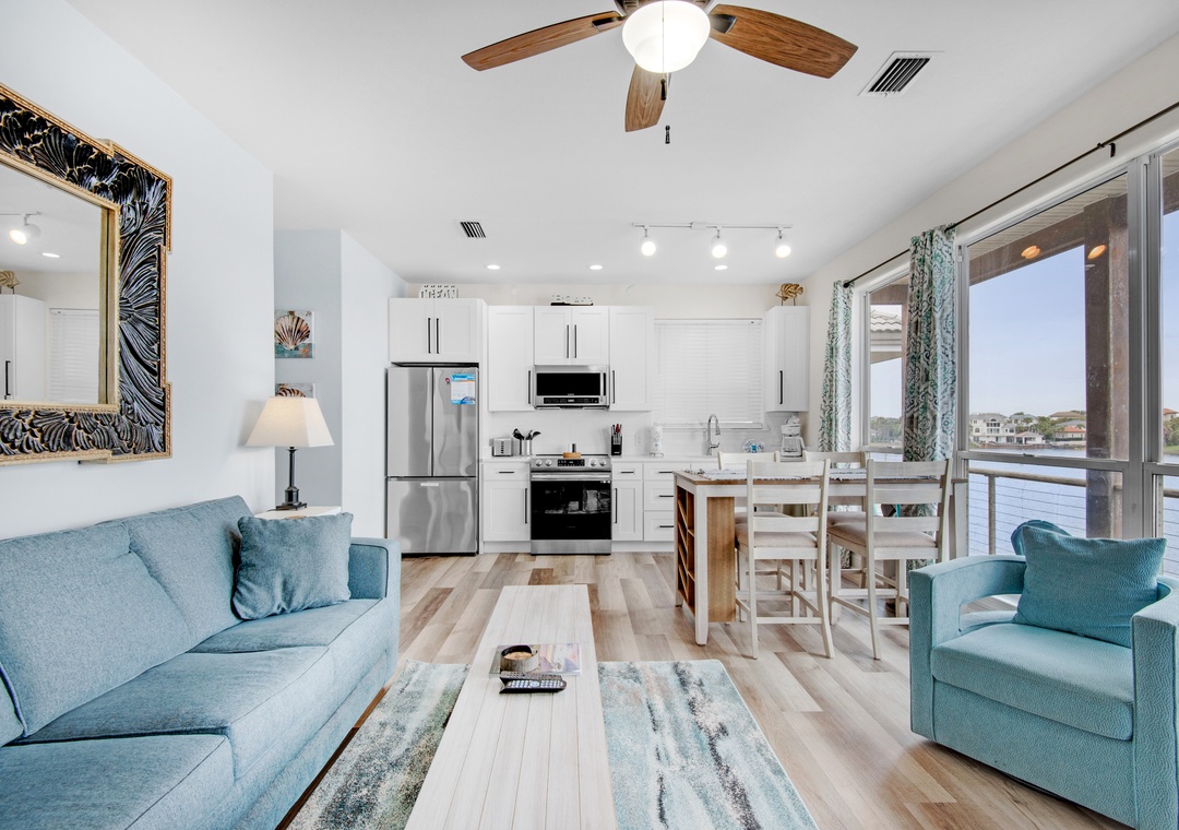 Destiny Beach Villas #15A is a 2BR/1BA, duplex that has both a lakeside and beachside balcony spanning the front and back of the unit with NEW vinyl flooring and NEWLY painted throughout the property! Unit #15A can be rented individually, or together with neighboring #15B. While relaxing in the living room and kitchen, enjoy the shores of Four Prong Lake or stand on the front balcony for stunning gulf views. The kitchen has all your needs with NEW Double Sink, Quartz Countertops, Shaker Cabinets, Appliances and more! Walk right across the street or through the tunnel to the public beach access. Or take a dip in the gated community pool, just a few steps away! The master bedroom has a king bed and a small twin bunk room attached, the living room has a fold down sofa bed; this condo sleeps a total of 6 guests. The bathroom is a shower/tub combo and NEW double sink with quartz countertops! This lovely home is perfect for a small gathering of close friends or family, while enjoying the best of lake views and proximity to the beach!