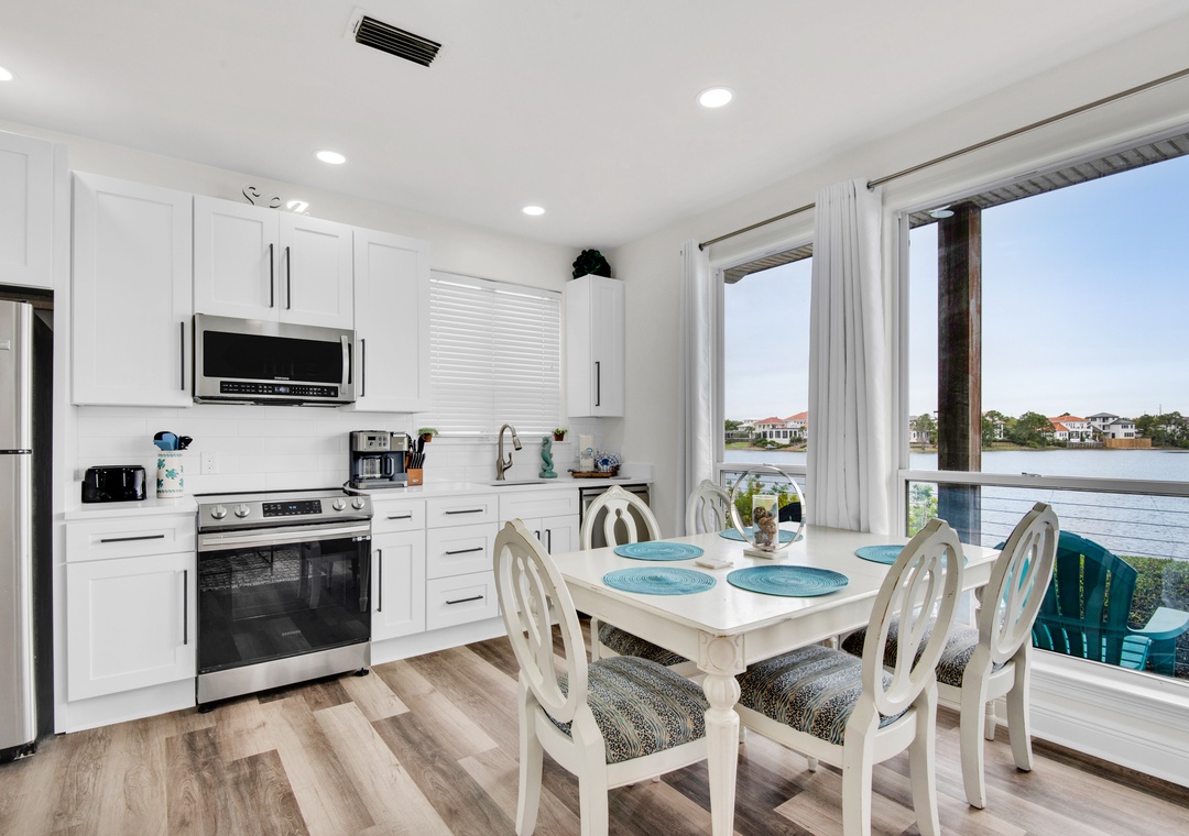 Destiny Beach Villas #15B is a 2BR/1BA duplex that has a lakeside balcony spanning the back of the house. Unit #15B can be rented individually, or together with neighboring #15A. While relaxing in the living room and kitchen of this newly renovated home, enjoy the shores of Four Prong Lake. The kitchen has all your needs complete with stainless steel appliances and more! Walk right across the street or through the tunnel to the public beach access. Or take a dip in the gated community pool, just a few steps away! The master bedroom features a king bed and includes a cozy attached bunk room with twin beds, accessible only through the master bedroom—perfect for families with young children, and the living room has a fold down sofa bed; this condo sleeps a total of 6 guests. The bathroom is a shower/tub combo and NEW double sink! This lovely home is perfect for a small gathering of close friends or family, while enjoying the best of lake views and proximity to the beach!