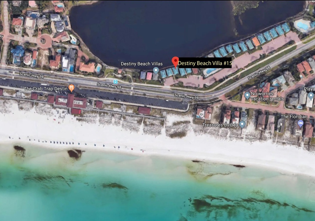 Destiny Beach Villas is a small complex of 2 story villas on Scenic Hwy 98 in Destin. Situated on Four Prong Lake and just steps away from the beach, these homes offer an ideal location for your next vacation. This prime spot is right across from the legendary Crab Trap beachside restaurant. Amenities include an immaculate community pool and outdoor grilling area.