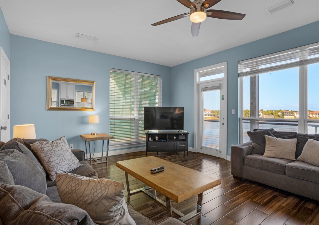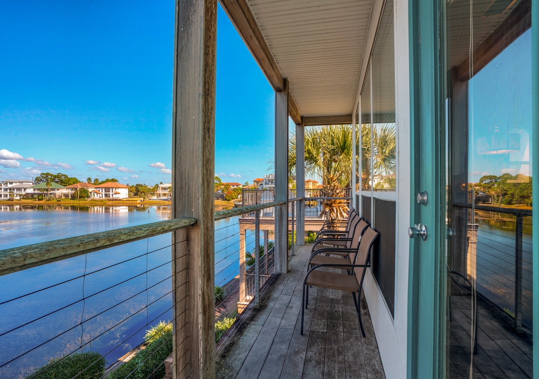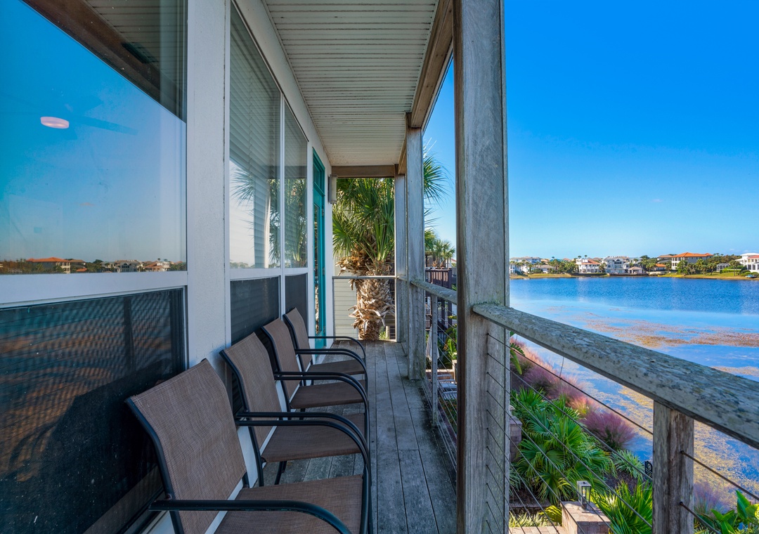 Destiny Beach Villas #20A is the top level of a two-story villa that has both Lakeside and Gulf-side balconies spanning the front and back of the home. While relaxing in the living room and kitchen, enjoy the shores of Four Prong Lake, or stand on the front balcony for stunning Gulf views. Stroll right across the street or through the tunnel to the public beach access or take a dip in the gated community pool just a few steps away! The kitchen has an updated feel with beautiful counter tops and stainless appliances. A dining space separates the living room from the kitchen and is adjacent to the living room access to the private balcony overlooking Four Front Lake. With a king bed in the master, a twin over queen bunk bed in the guest room, as well as an extra twin bed in the guest room, and a sleeper sofa in the living room, this condo sleeps a total of 8 guests. Destiny Beach Villas #20A is perfect for a small gathering of friends or family, while enjoying fabulous views and a prime location in Destin!