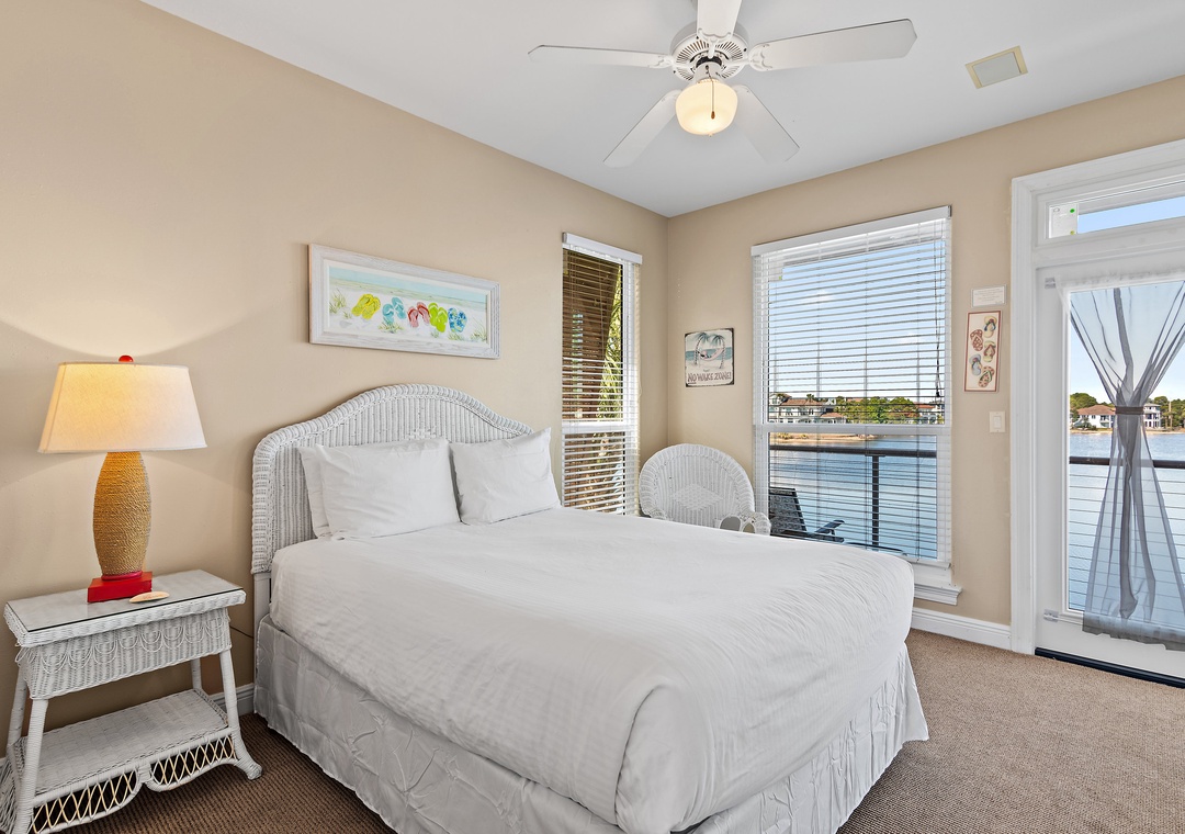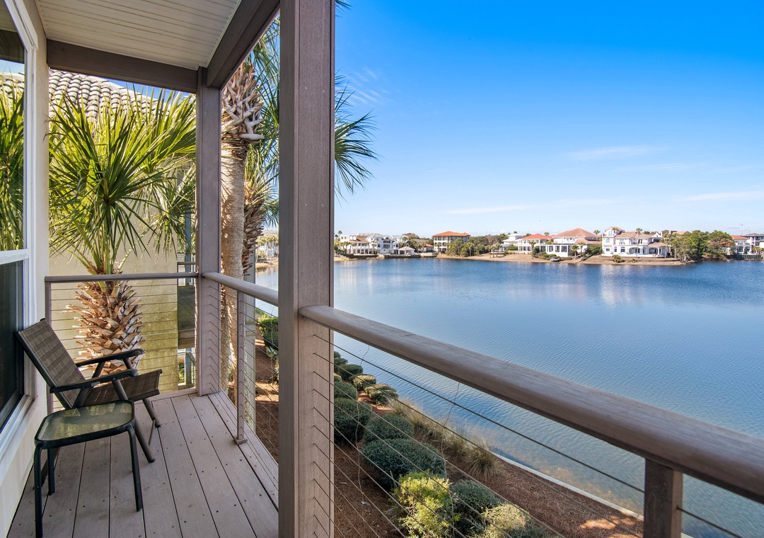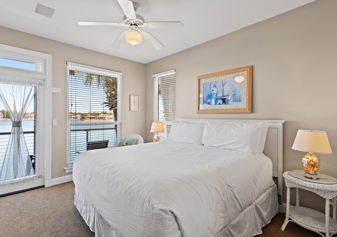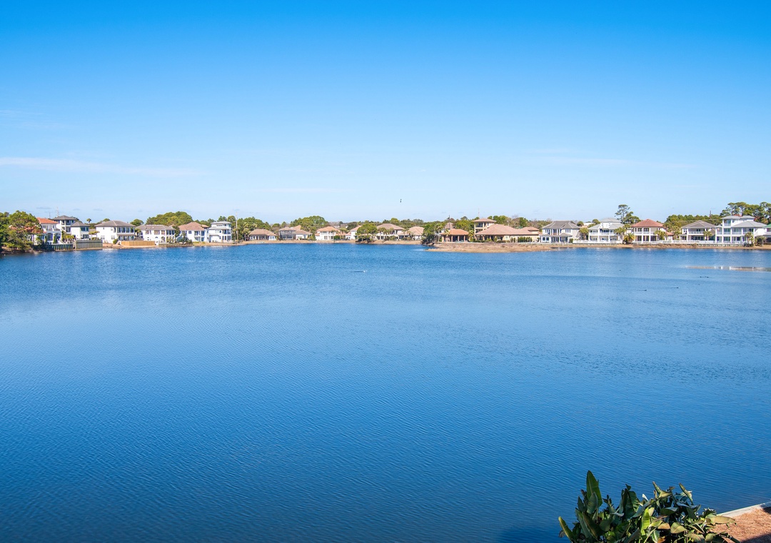 Welcome to Destiny Beach Villas #9A, a top-floor retreat in a charming two-story villa featuring both lakeside and poolside balconies that span the front and back of the home. Enjoy the best of coastal living with public beach access just across the street and a gated community pool only steps away. After a fun-filled day in the sun, unwind on your private balcony and take in stunning lake sunsets with your favorite beverage. The fully equipped kitchen offers everything you need to prepare meals the whole family will enjoy, while large windows surrounding the dining area fill the space with natural light. This inviting condo comfortably sleeps up to six guests, featuring a king bed in the master bedroom, a queen bed in the guest room, and a sleeper sofa in the living area. Both bedrooms provide direct access to the lakeside balcony, offering peaceful views and a relaxing atmosphere.