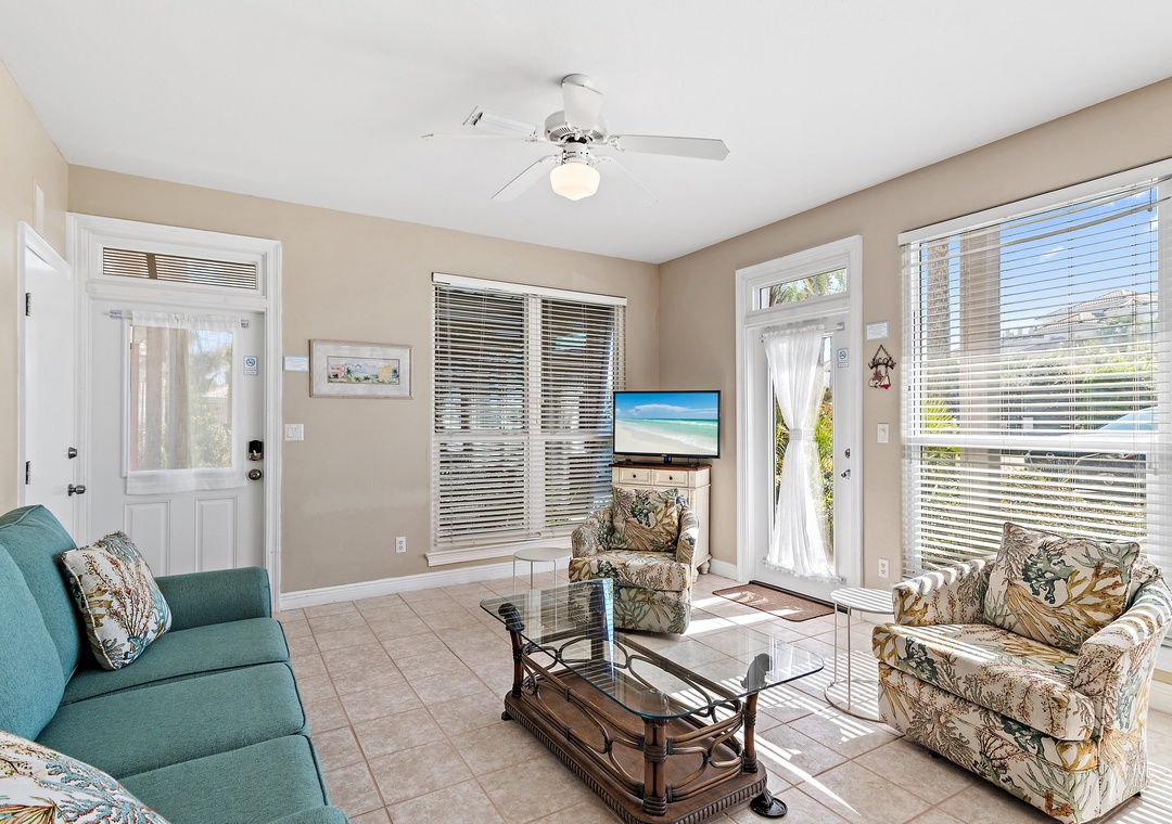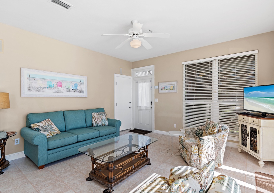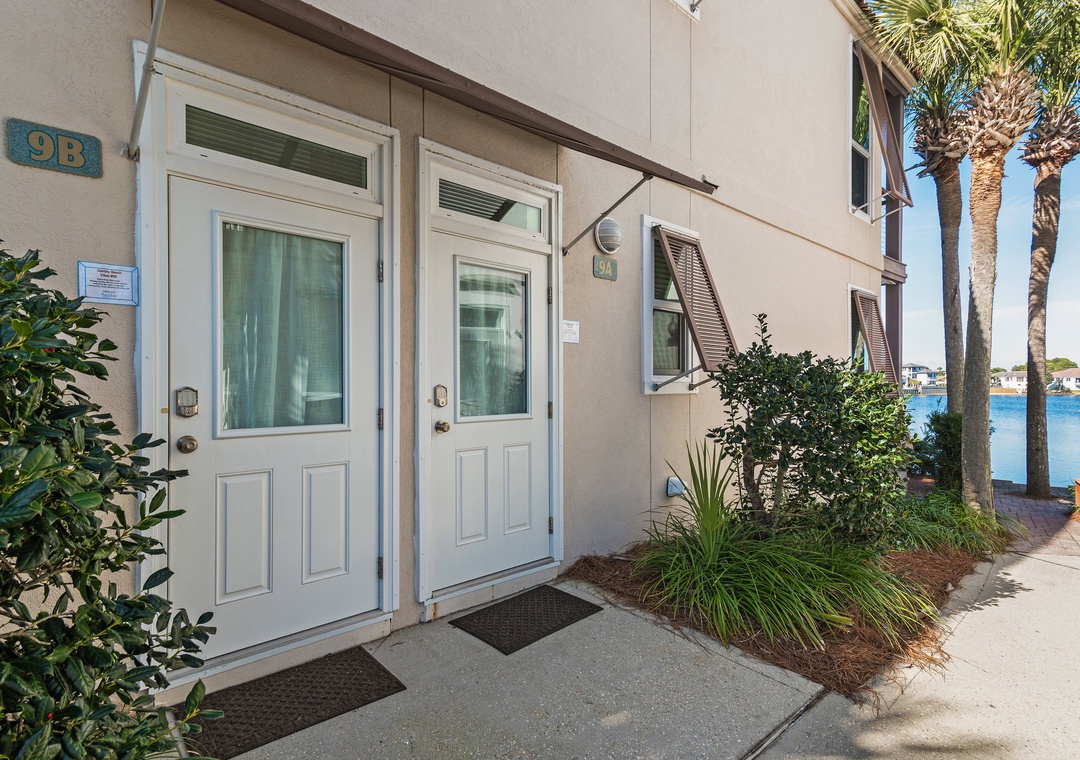 Welcome to Destiny Beach Villas #9B, a relaxing ground-floor retreat in a charming two-story villa. This inviting condo features both lakeside and poolside porches spanning the front and back of the home, offering beautiful views and peaceful outdoor spaces. Enjoy the best of coastal living with public beach access just across the street and a gated community pool only steps away. After a sun-filled day at the beach, unwind on your private porch and savor breathtaking lake sunsets with your favorite drink. The fully equipped kitchen has everything you need to prepare meals the whole family will love, while large windows surrounding the dining area flood the space with natural light. The front porch offers seating for two, making it the perfect spot to enjoy your morning coffee. Comfortably sleeping up to six guests, this condo includes a king bed in the master bedroom, a queen bed in the guest room, and a sleeper sofa in the living area. Ideal for a small family or group of friends, Destiny Beach Villas #9B offers stunning views, thoughtful amenities, and a prime Destin location—everything you need for an unforgettable getaway.