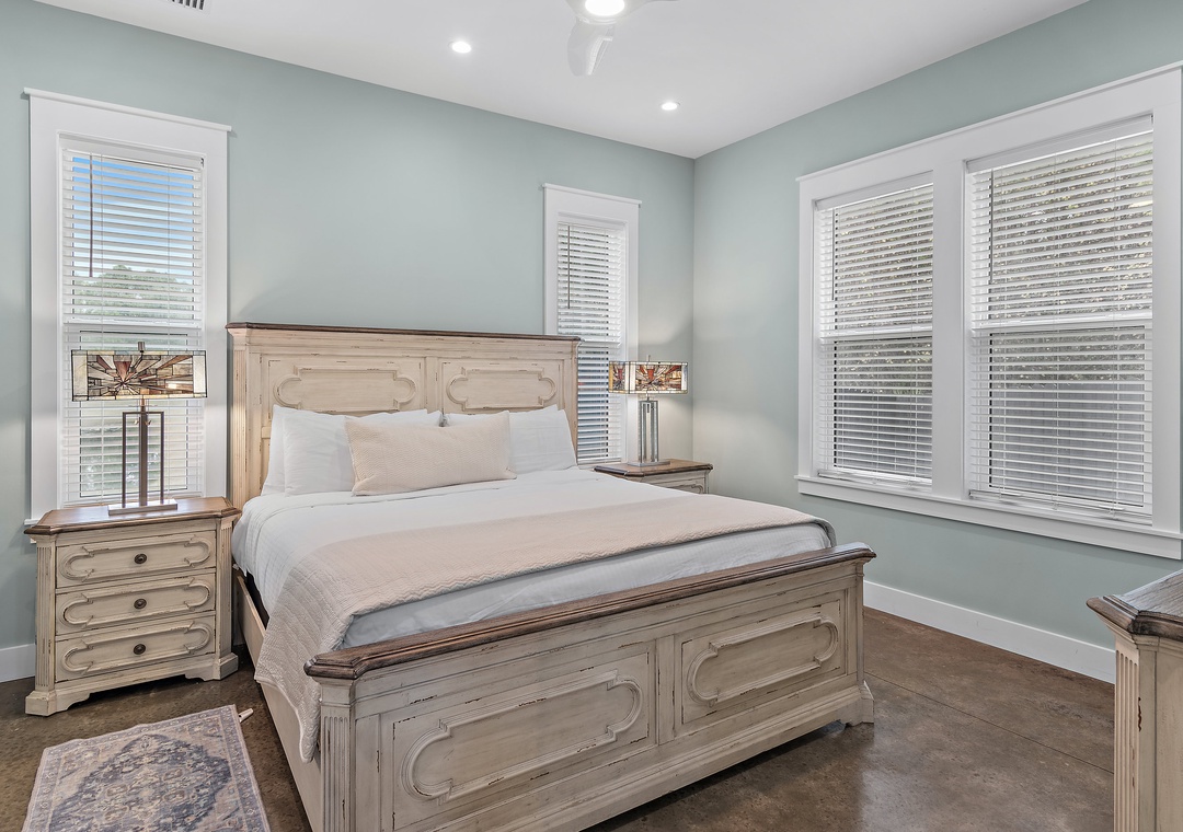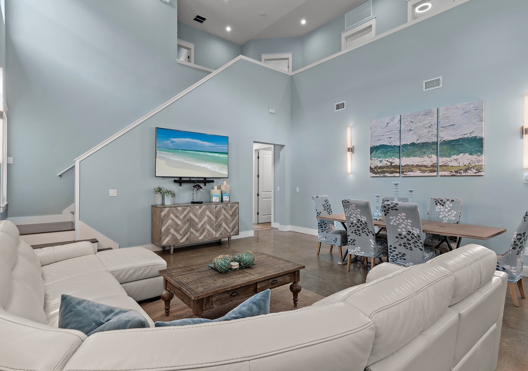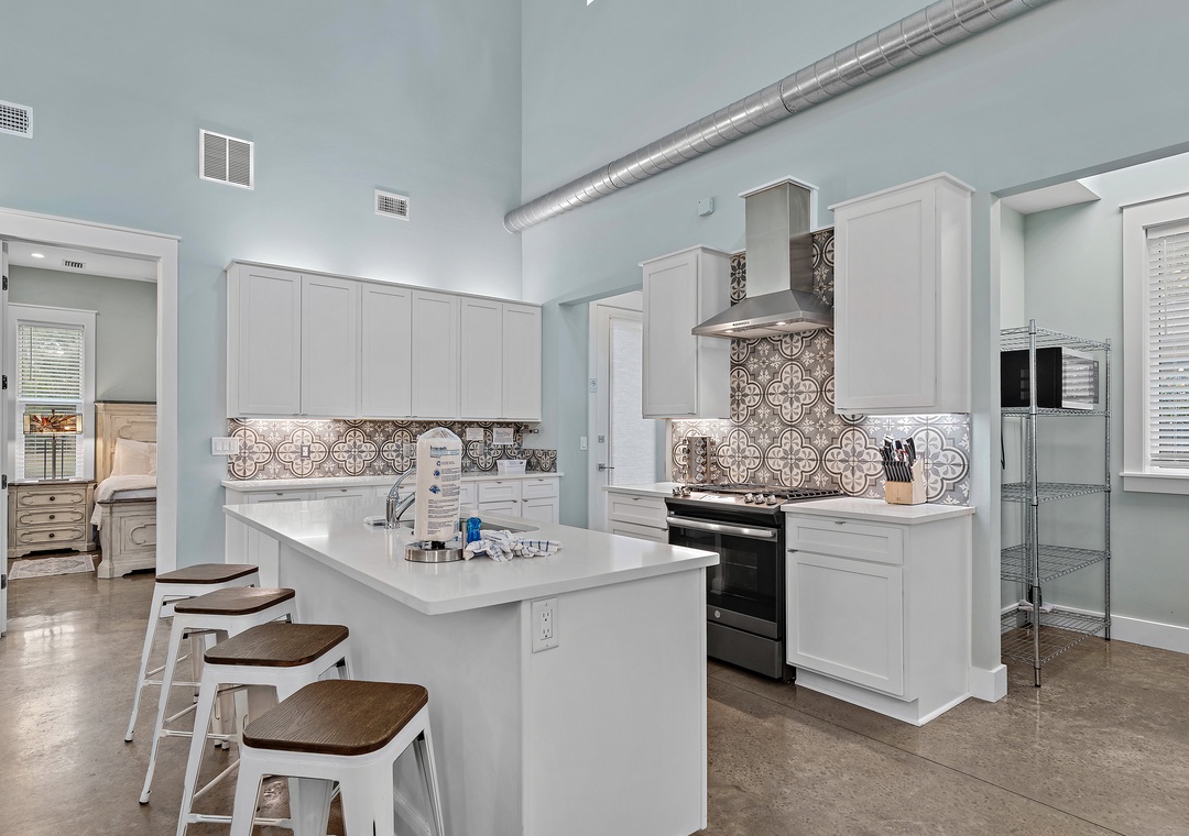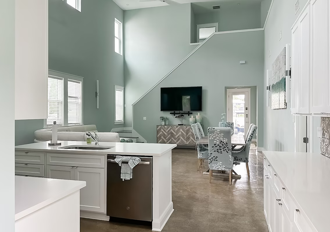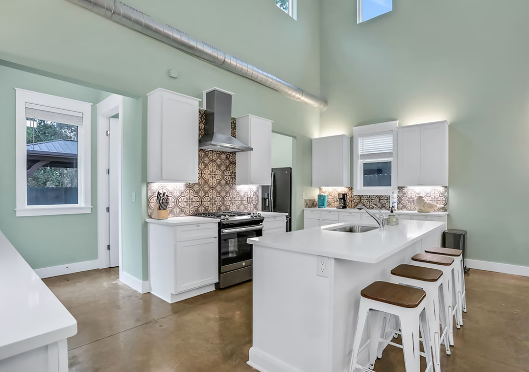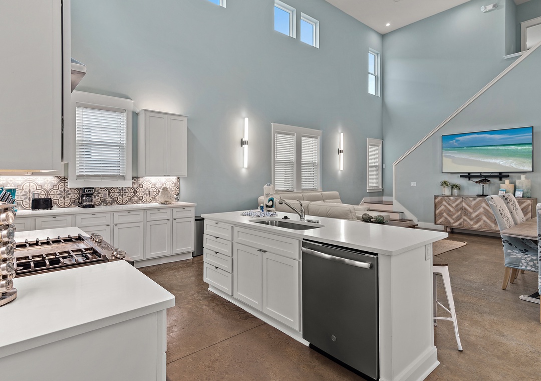 Welcome to Down da Road, a luxurious 4-bedroom, 3.5-bathroom home nestled in the Villas of Frangista. As you step through the front door, you'll be immediately greeted by soaring 20-foot ceilings and an abundance of windows that flood the space with natural light. With its high-end finishes and inviting design, you'll feel like you're on an exotic getaway. The open-concept living and kitchen areas feature stunning polished concrete floors, sleek quartz countertops, top-of-the-line stainless steel appliances, and a spacious island, ideal for entertaining, casual meals, or simply relaxing with loved ones. This spacious two-level home comfortably accommodates up to 12 guests. The first-floor master suite boasts a king-sized bed, his and hers closets, and a spa-inspired en-suite bathroom complete with double vanities and a large walk-in shower. Upstairs, you'll find two cozy guest bedrooms with queen-sized beds, along with a fun and functional room outfitted with two twin-over-full bunk beds, perfect for kids or large groups.