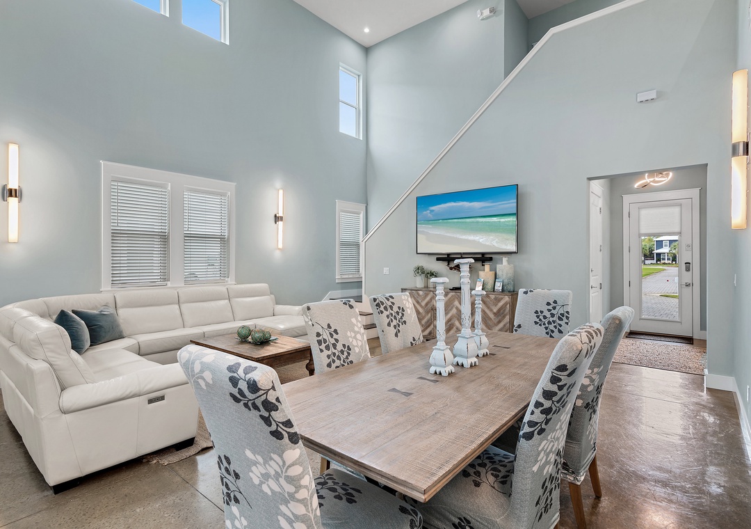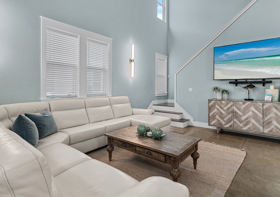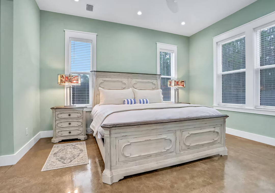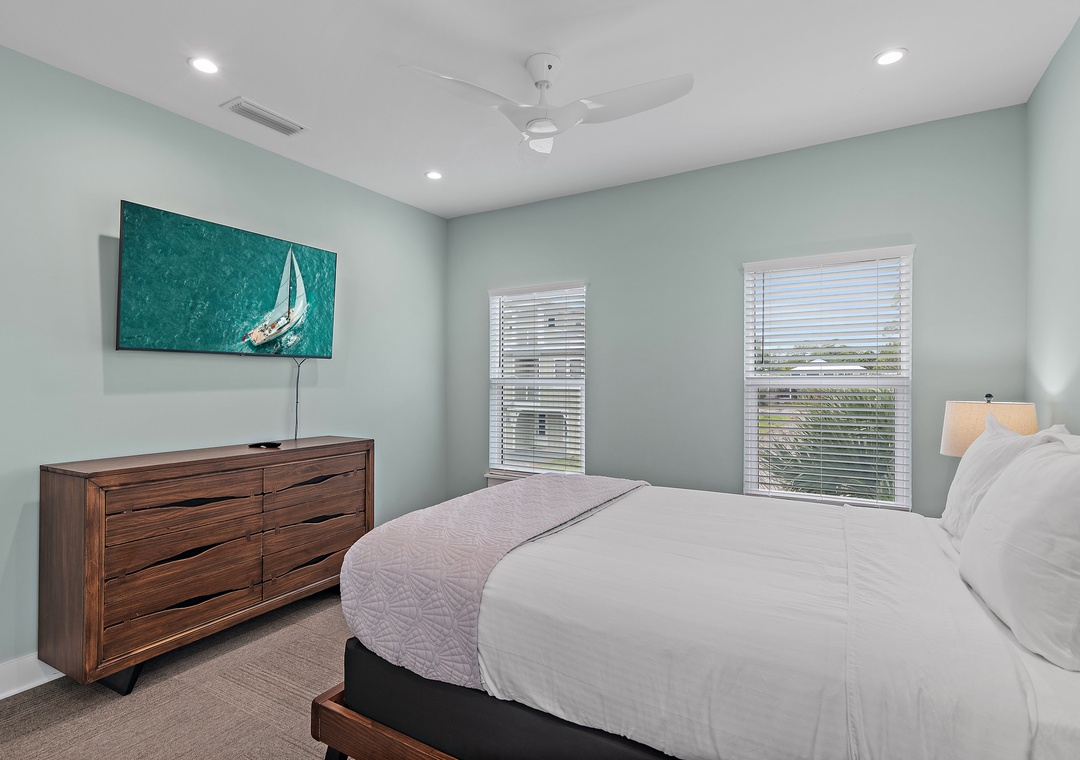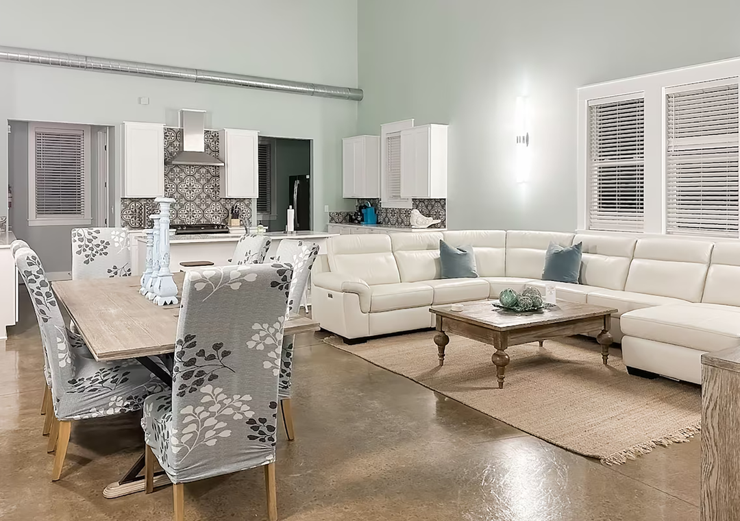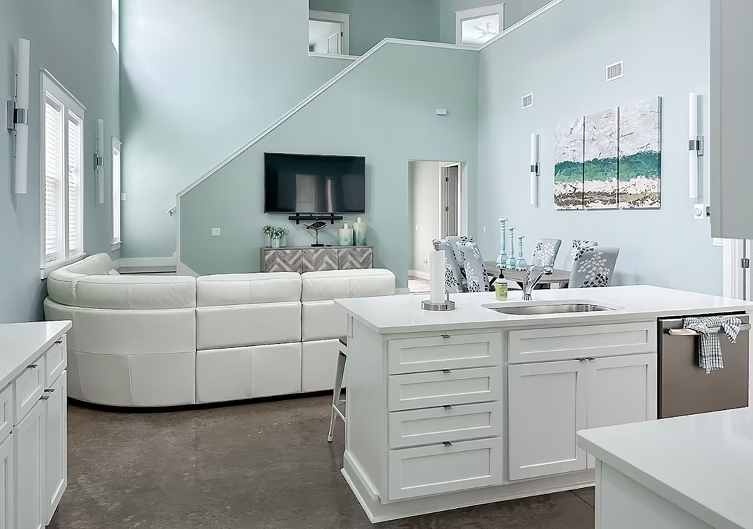 Welcome to Down da Road, a luxurious 4-bedroom, 3.5-bathroom home nestled in the Villas of Frangista. As you step through the front door, you'll be immediately greeted by soaring 20-foot ceilings and an abundance of windows that flood the space with natural light. With its high-end finishes and inviting design, you'll feel like you're on an exotic getaway. The open-concept living and kitchen areas feature stunning polished concrete floors, sleek quartz countertops, top-of-the-line stainless steel appliances, and a spacious island, ideal for entertaining, casual meals, or simply relaxing with loved ones. This spacious two-level home comfortably accommodates up to 12 guests. The first-floor master suite boasts a king-sized bed, his and hers closets, and a spa-inspired en-suite bathroom complete with double vanities and a large walk-in shower. Upstairs, you'll find two cozy guest bedrooms with queen-sized beds, along with a fun and functional room outfitted with two twin-over-full bunk beds, perfect for kids or large groups.