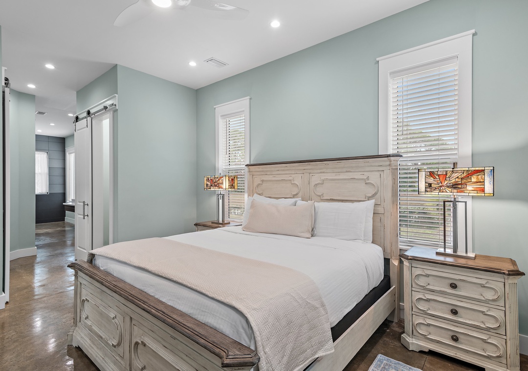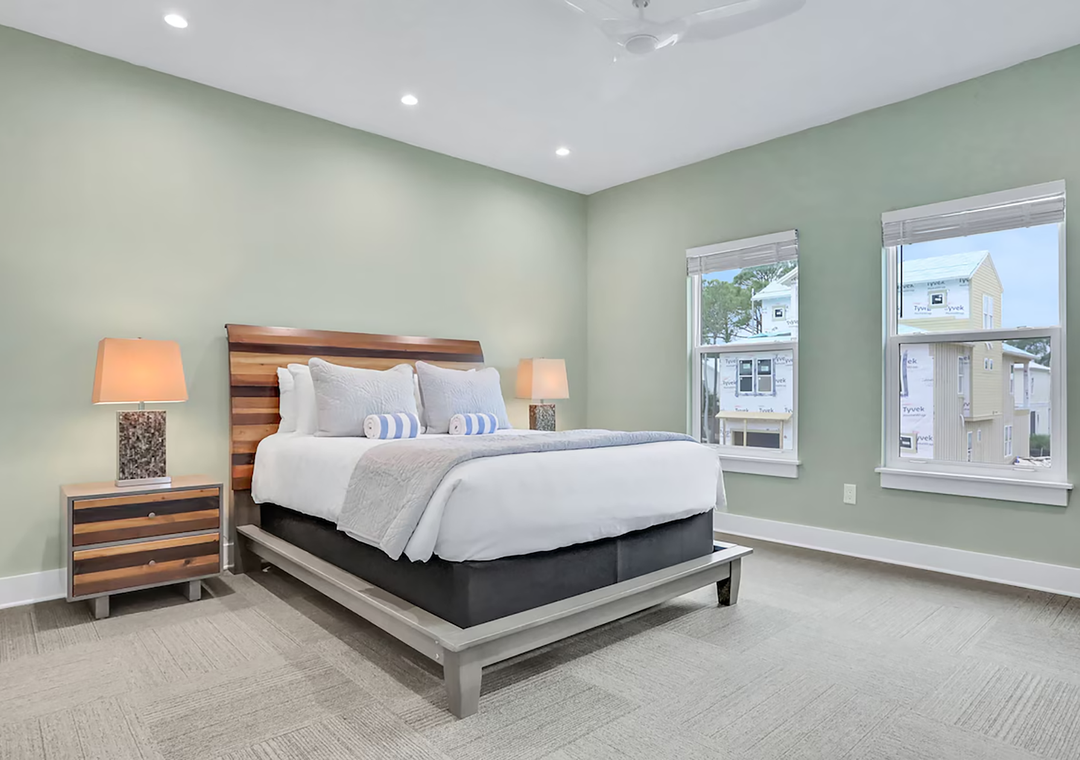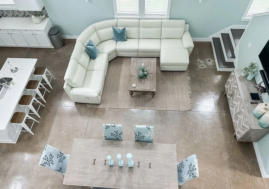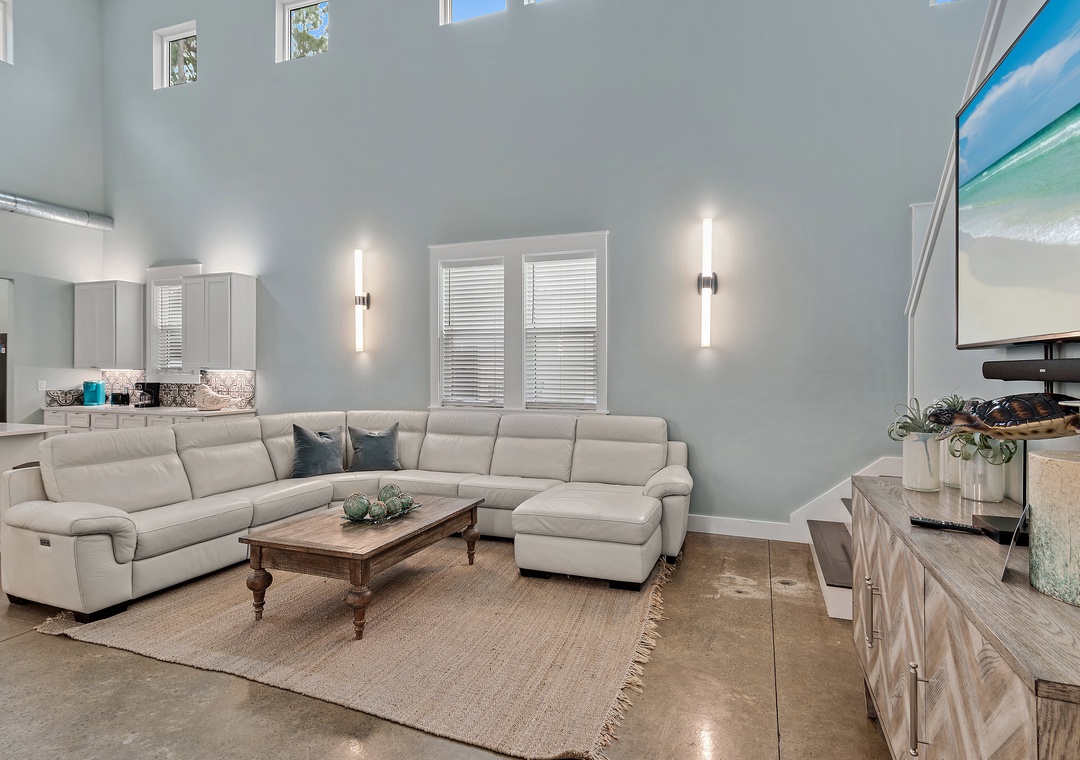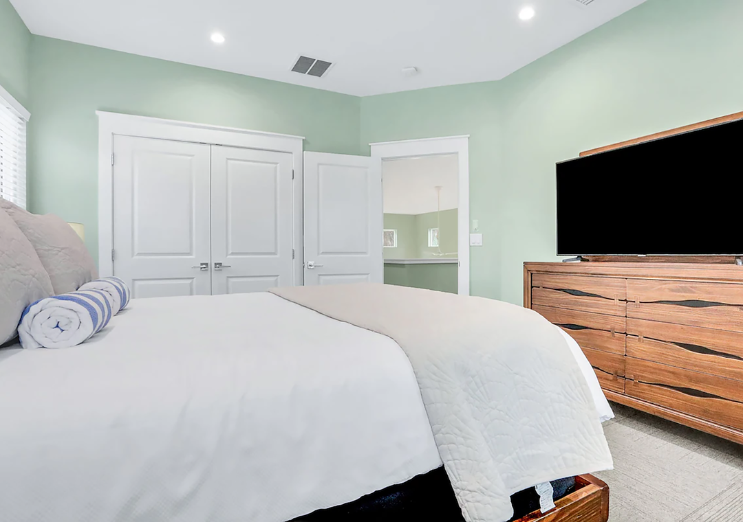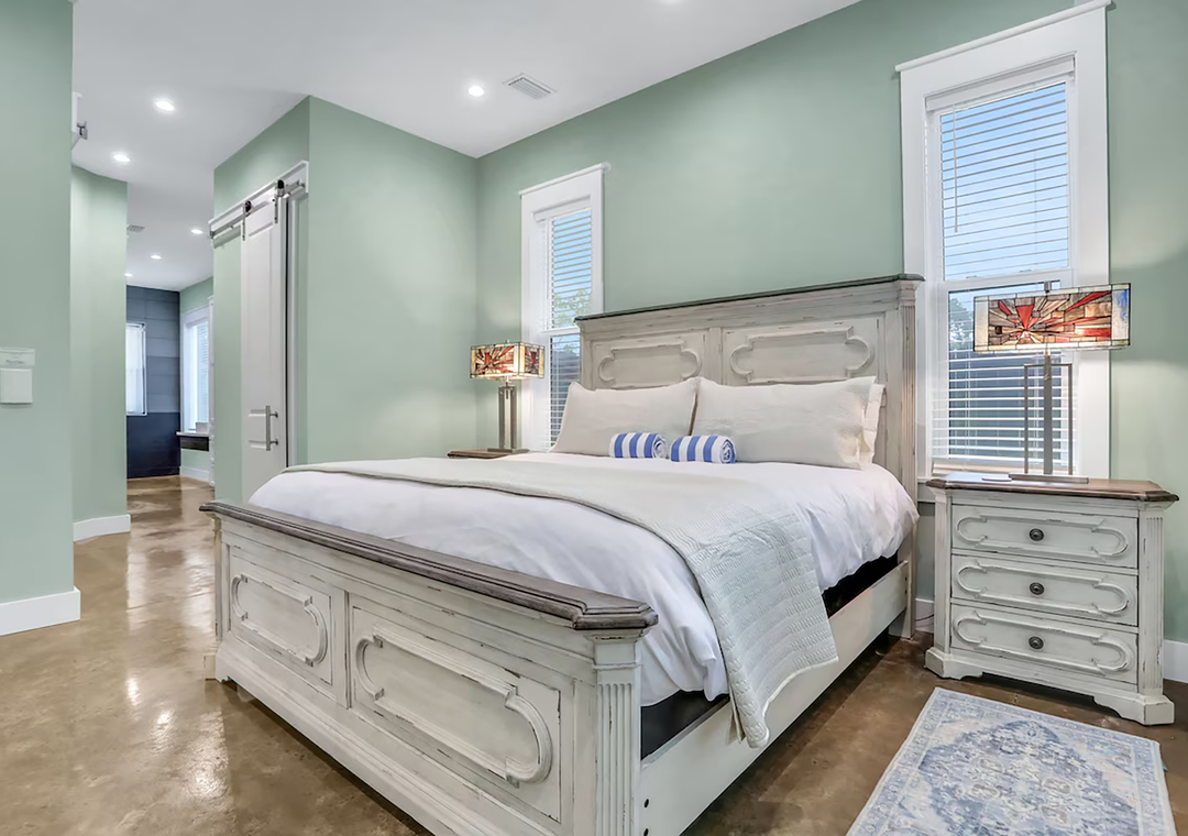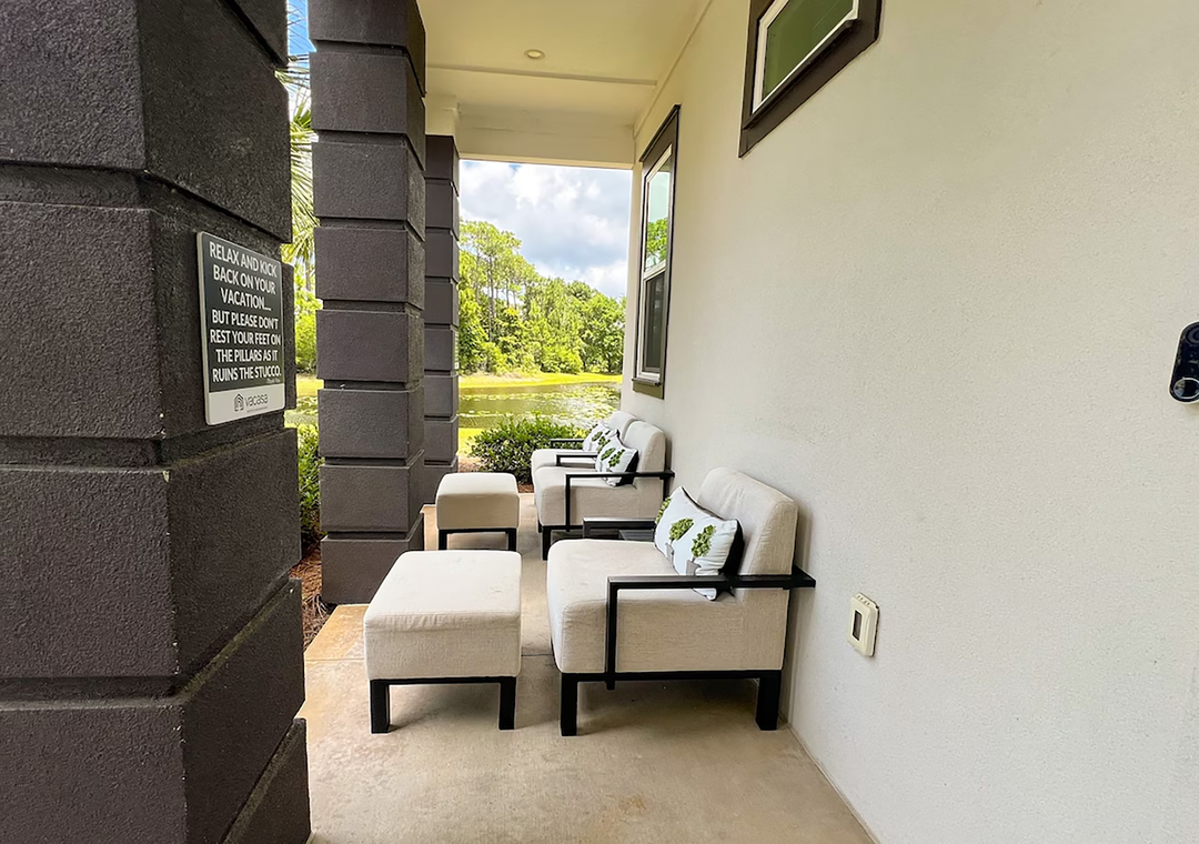 Welcome to Down da Road, a luxurious 4-bedroom, 3.5-bathroom home nestled in the Villas of Frangista. As you step through the front door, you'll be immediately greeted by soaring 20-foot ceilings and an abundance of windows that flood the space with natural light. With its high-end finishes and inviting design, you'll feel like you're on an exotic getaway. The open-concept living and kitchen areas feature stunning polished concrete floors, sleek quartz countertops, top-of-the-line stainless steel appliances, and a spacious island, ideal for entertaining, casual meals, or simply relaxing with loved ones. This spacious two-level home comfortably accommodates up to 12 guests. The first-floor master suite boasts a king-sized bed, his and hers closets, and a spa-inspired en-suite bathroom complete with double vanities and a large walk-in shower. Upstairs, you'll find two cozy guest bedrooms with queen-sized beds, along with a fun and functional room outfitted with two twin-over-full bunk beds, perfect for kids or large groups.
