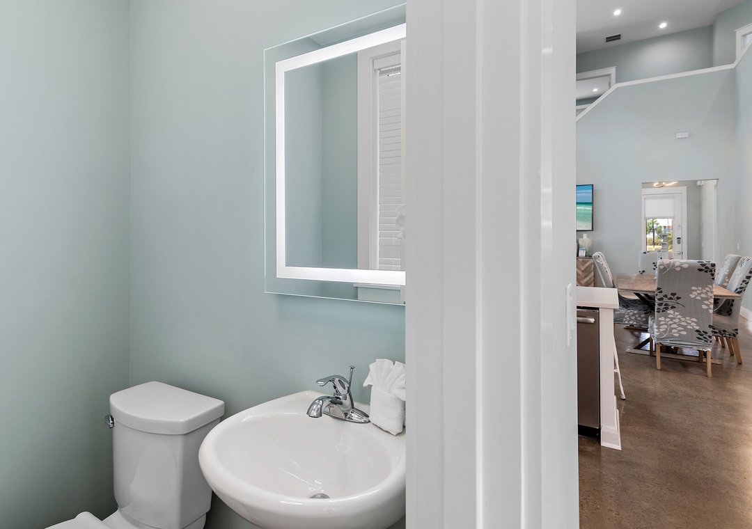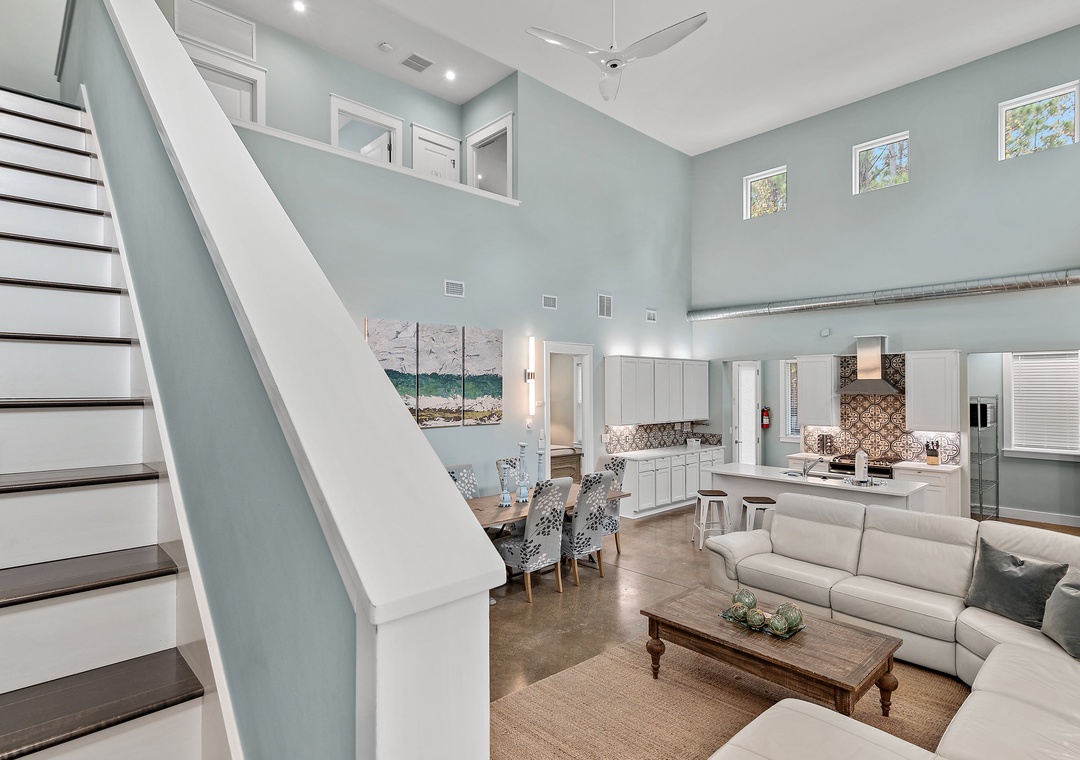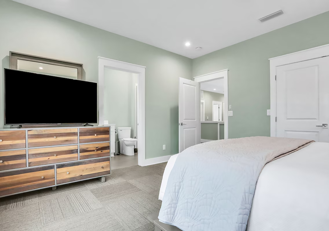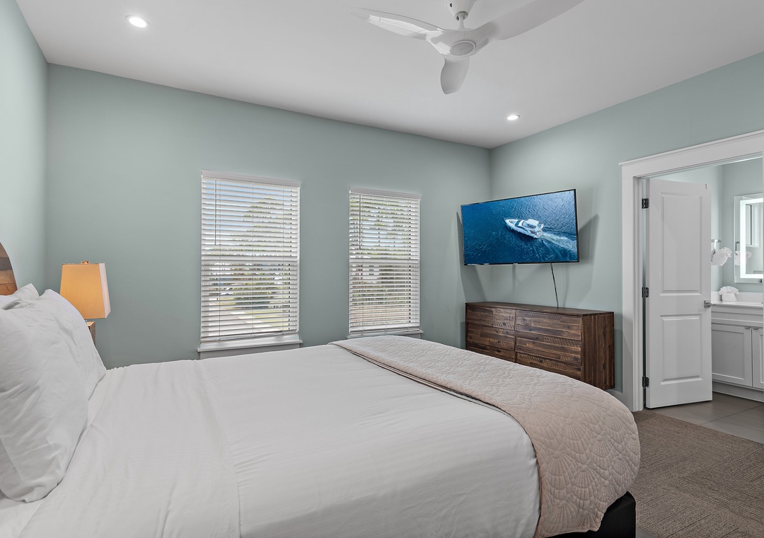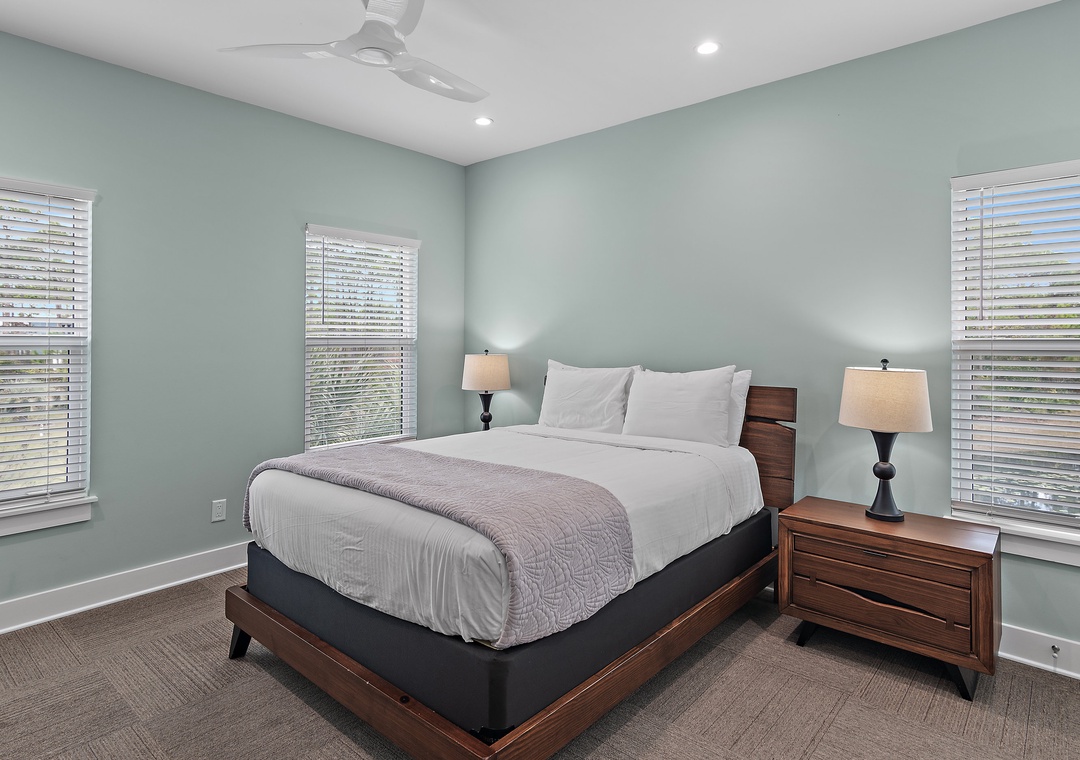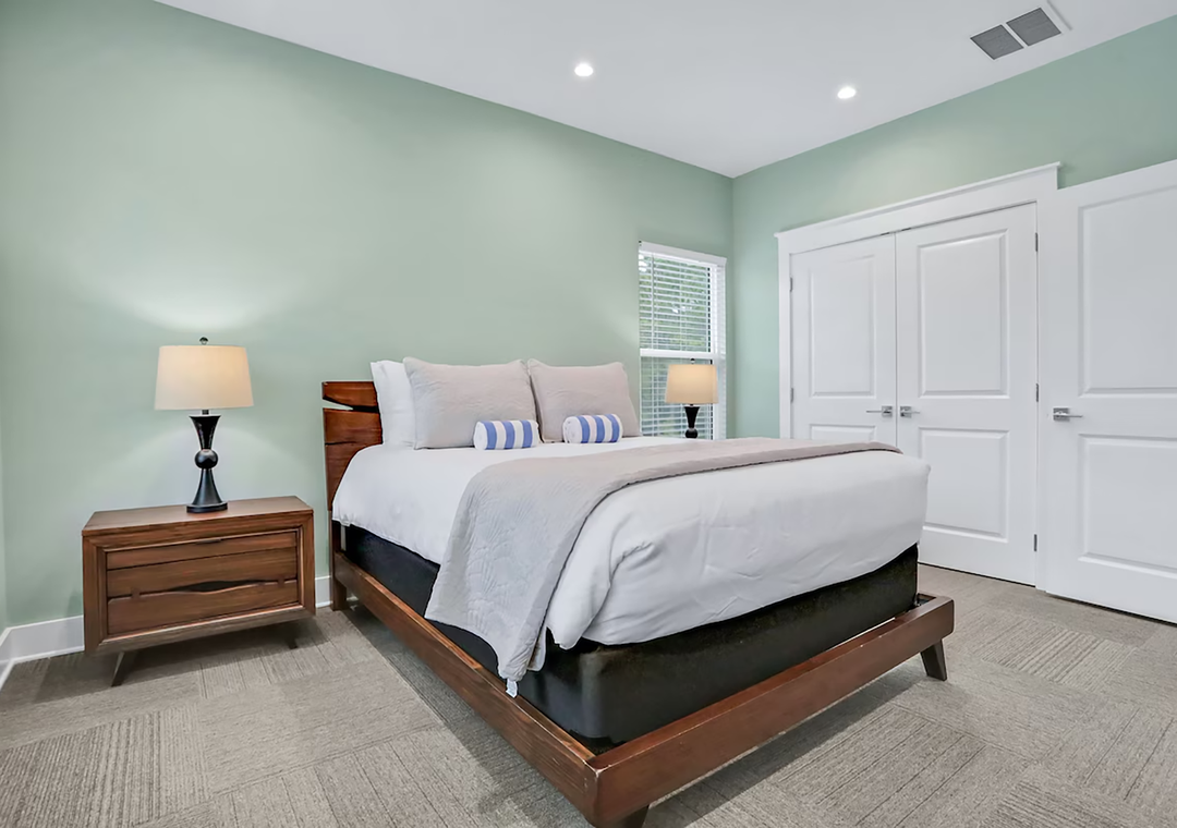 Welcome to Down da Road, a luxurious 4-bedroom, 3.5-bathroom home nestled in the Villas of Frangista. As you step through the front door, you'll be immediately greeted by soaring 20-foot ceilings and an abundance of windows that flood the space with natural light. With its high-end finishes and inviting design, you'll feel like you're on an exotic getaway. The open-concept living and kitchen areas feature stunning polished concrete floors, sleek quartz countertops, top-of-the-line stainless steel appliances, and a spacious island, ideal for entertaining, casual meals, or simply relaxing with loved ones. This spacious two-level home comfortably accommodates up to 12 guests. The first-floor master suite boasts a king-sized bed, his and hers closets, and a spa-inspired en-suite bathroom complete with double vanities and a large walk-in shower. Upstairs, you'll find two cozy guest bedrooms with queen-sized beds, along with a fun and functional room outfitted with two twin-over-full bunk beds, perfect for kids or large groups.