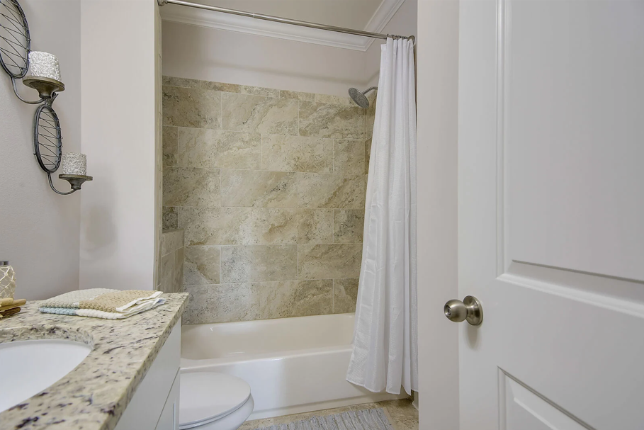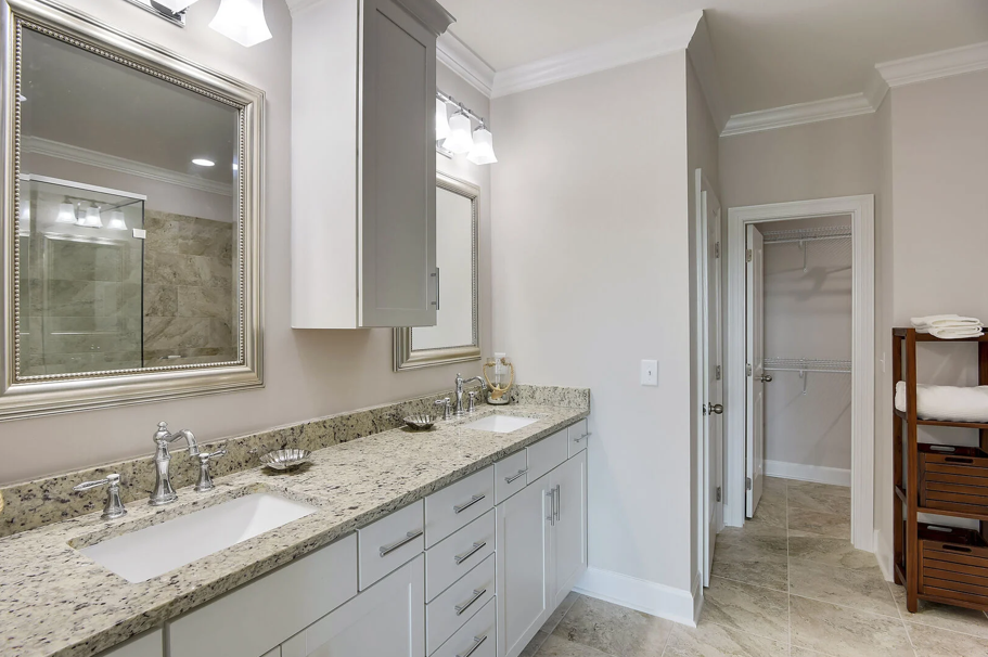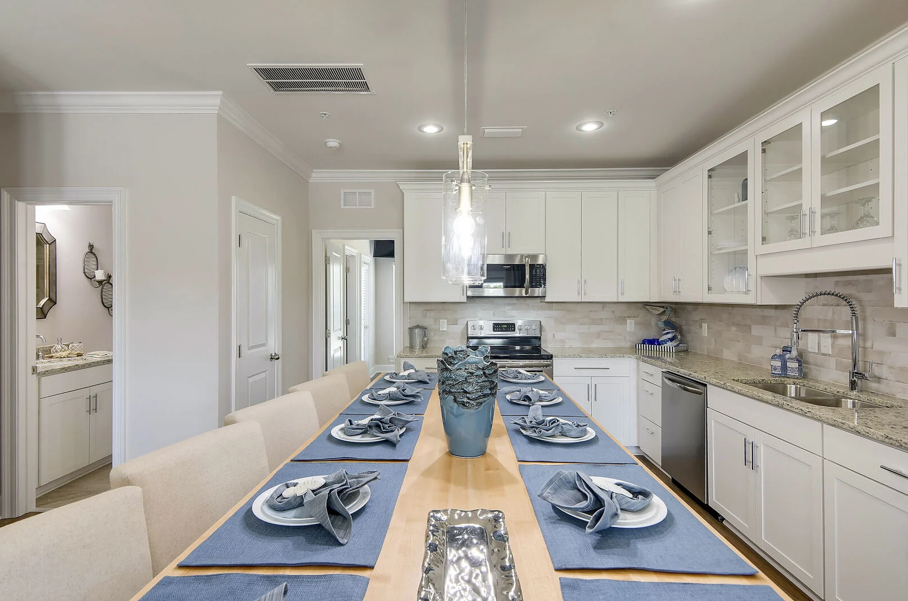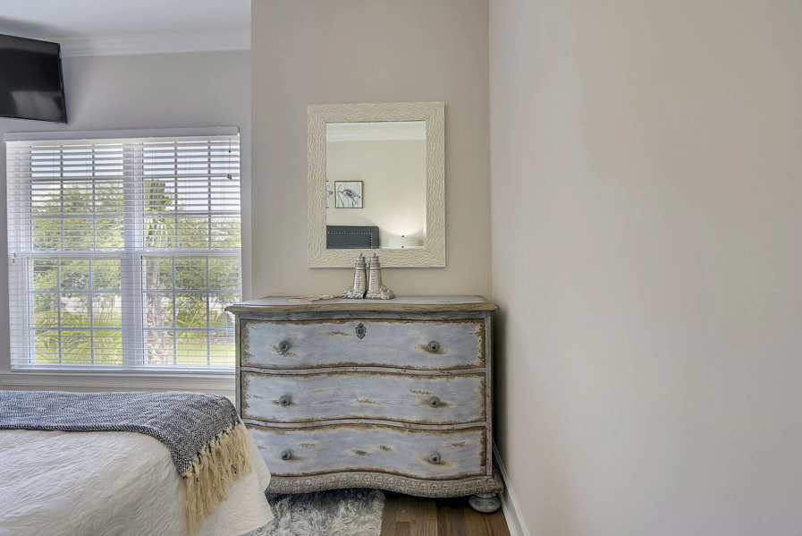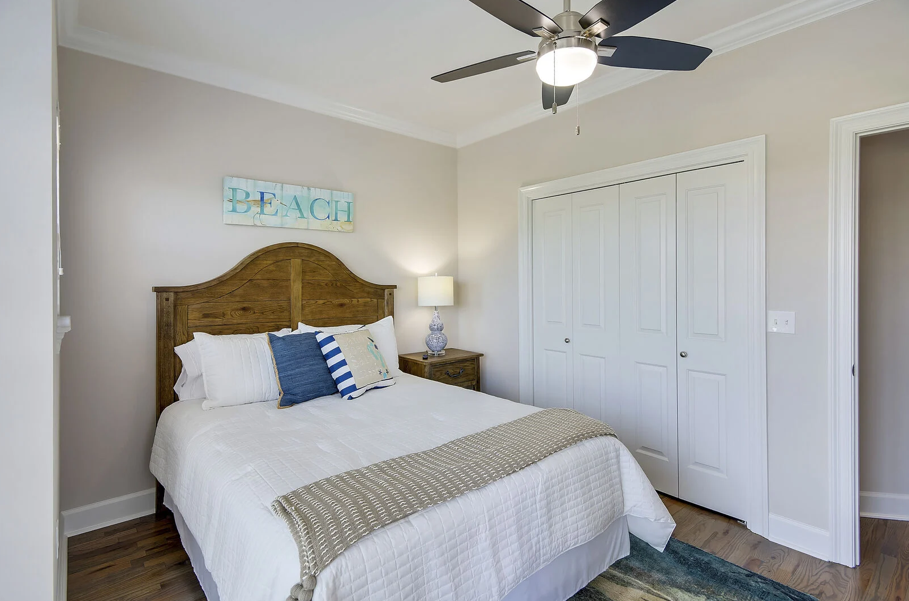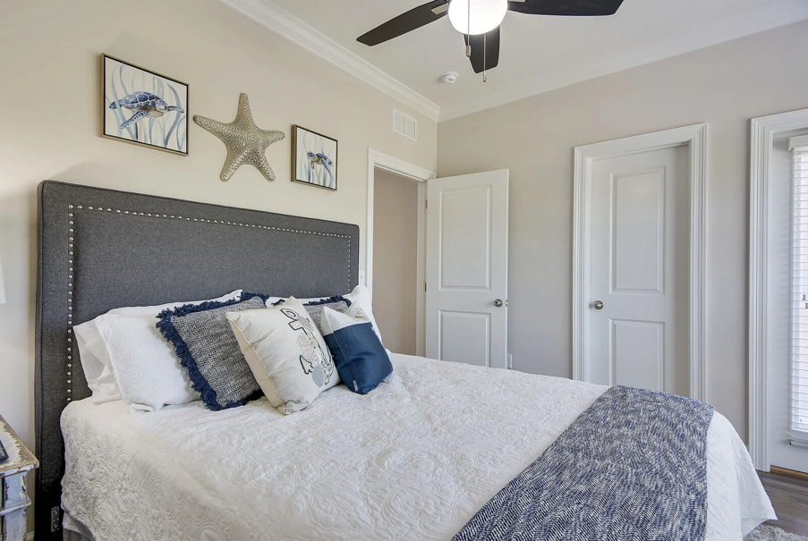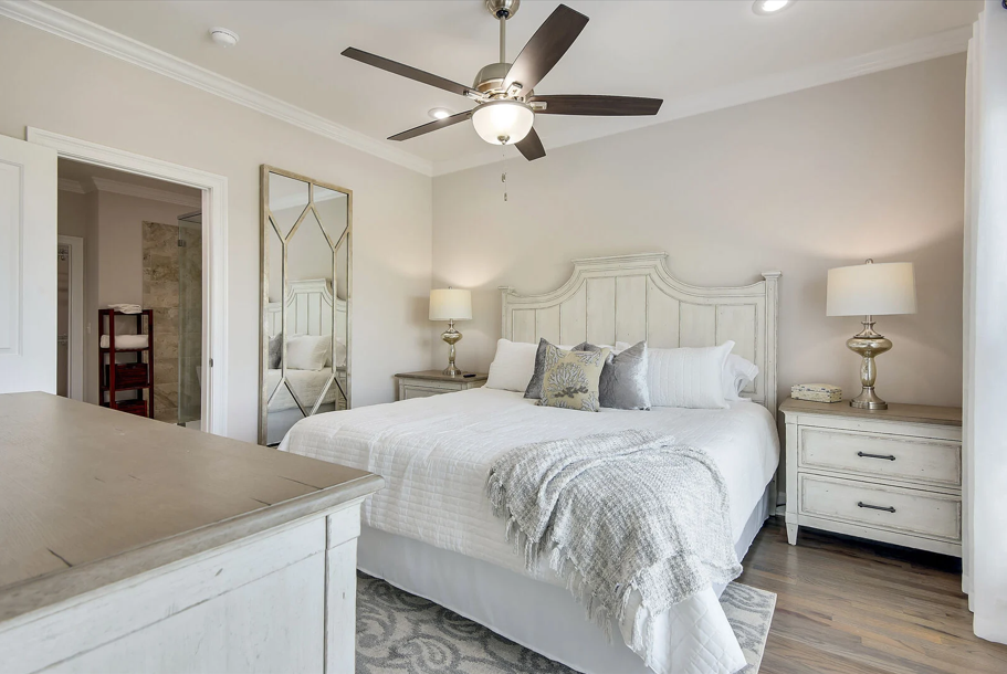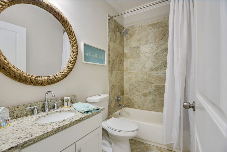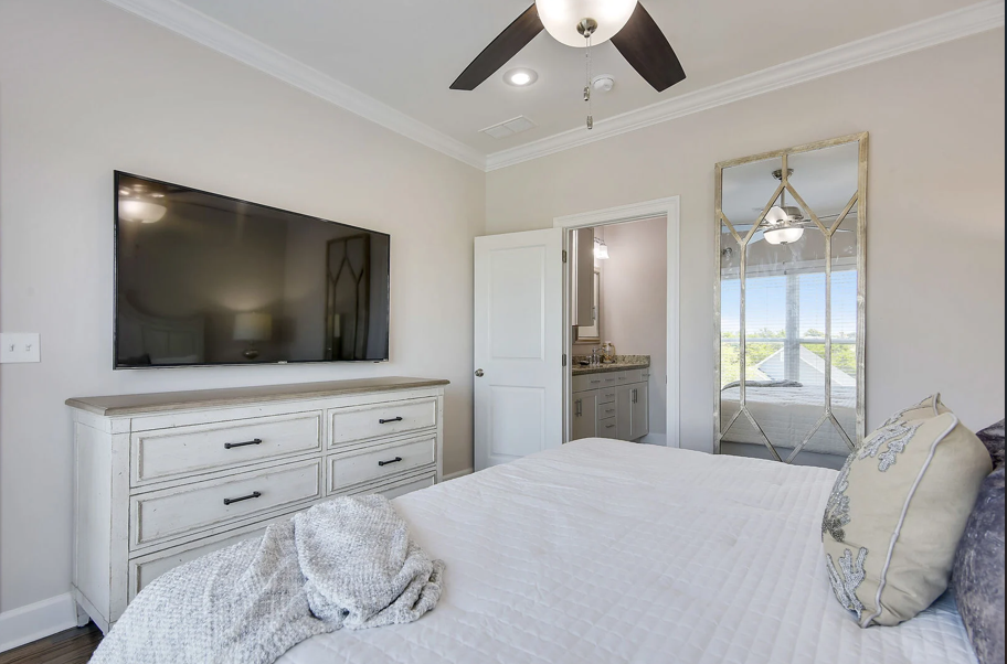 A staircase off the kitchen leads to the crown jewel of the home on the third floor. Here, the luxurious king master suite awaits, complete with a stunning ensuite bathroom featuring a large soaking tub, glass-enclosed walk-in shower, elegant tilework, granite countertops, and Moen fixtures. An additional queen guest bedroom on this level offers a peaceful space to relax and recharge. Driftwood Townhomes #3 is the perfect setting to create timeless beach memories—come experience coastal living at its finest with Liv Salty.
