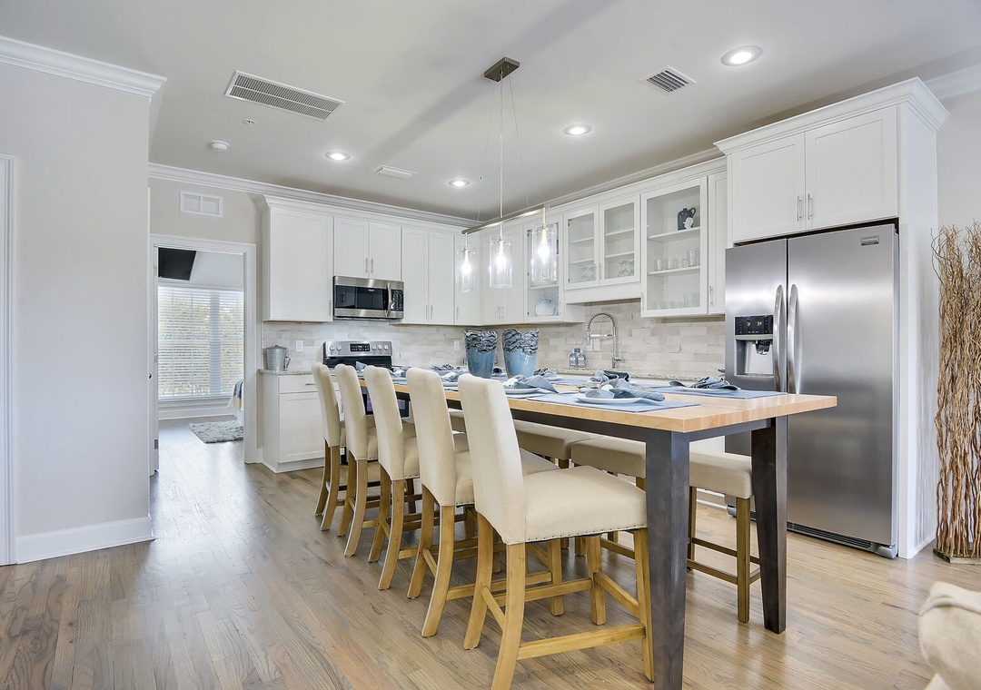 Welcome to Driftwood Townhomes #3, a beautifully appointed four-bedroom, four-bathroom coastal retreat designed to comfortably accommodate up to 12 guests. From the moment you arrive, you’ll feel the excitement of beach living and know you’re in for an unforgettable stay. The first floor features a full bathroom and a spacious bunk room that sleeps up to four—perfect for kids or extra guests. Head upstairs to the second floor, where you’ll find a queen guest bedroom and full bath, along with the main living area. This open-concept space includes a sleeper sofa, a sleek dining area with seating for everyone, and a thoughtfully upgraded kitchen showcasing custom cabinetry, high-end stainless-steel appliances, and modern finishes—ideal for gathering after a day at the beach.