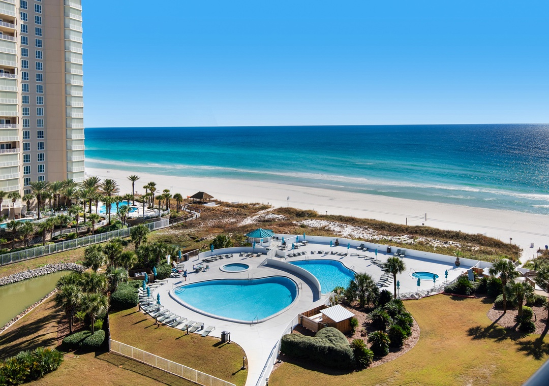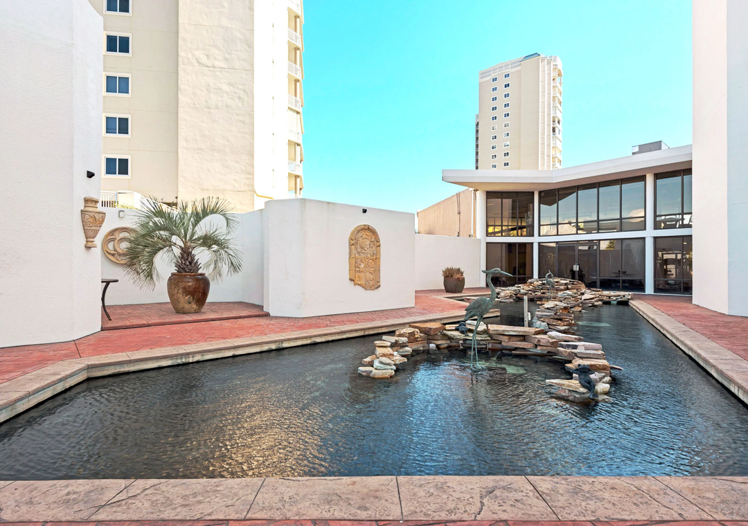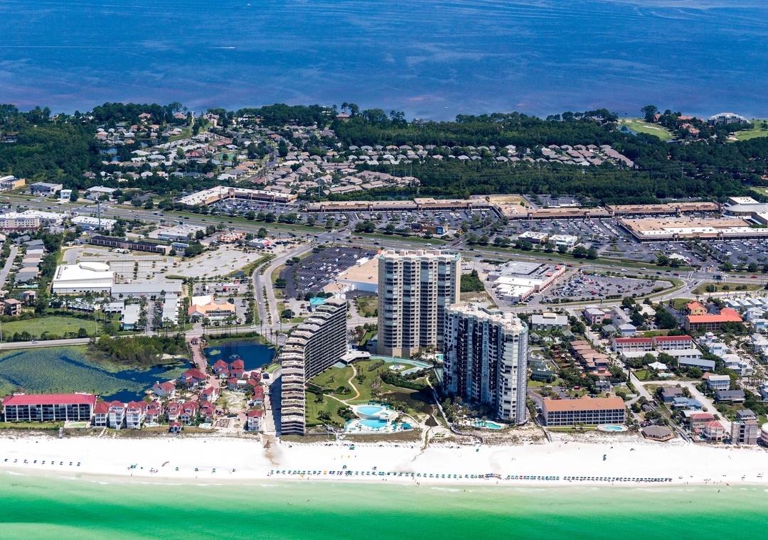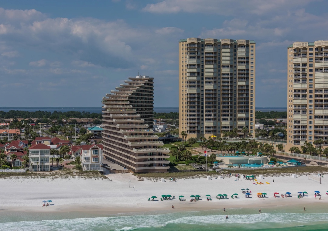 Edgewater on Miramar Beach is an architectural masterpiece that rises up in a step-like fashion to nineteen stories in height with open-ended terraces. The entire crescent-shaped building wraps around lagoon-shaped swimming pools and hot tub that glisten beside the gulf. The Edgewater grounds extend from the building towards the sugar white sands with expansive lush lawns accented with towering palms and other tropical plants. There is also a seasonal Tiki Bar and Grill that is open in the Spring and Summer. Edgewater is also within walking distance to popular local restaurants, grocery stores, and shopping at Silver Sands Premium Outlet and Grand Boulevard.