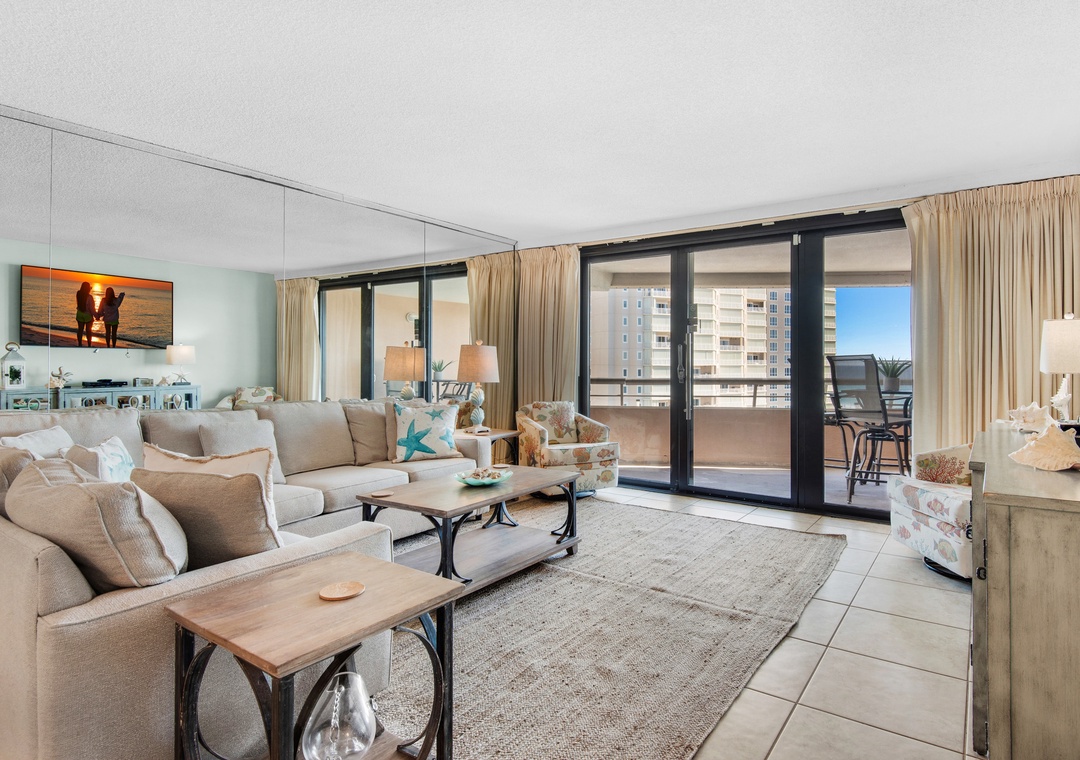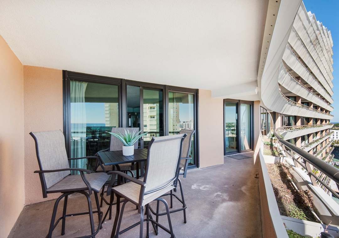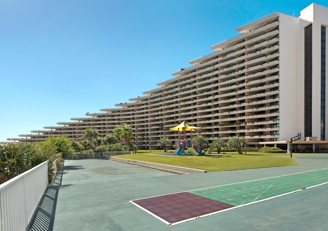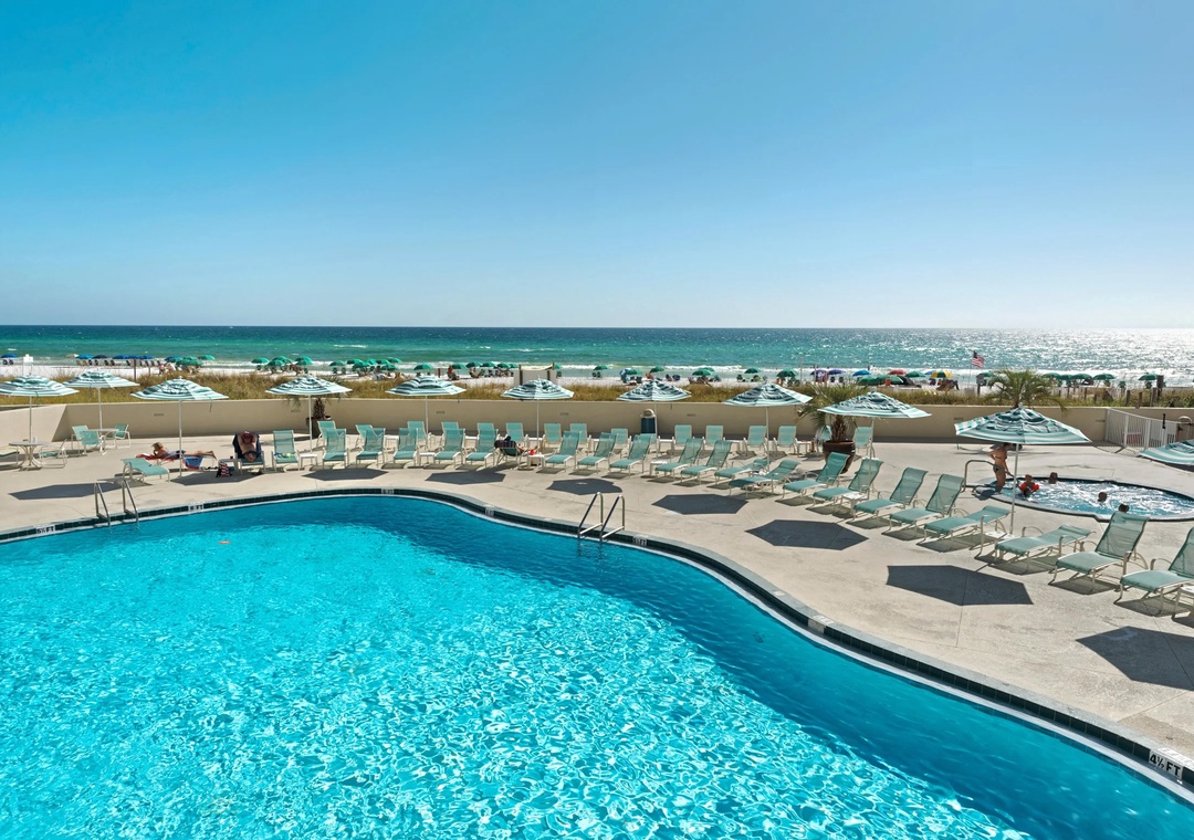 Edgewater on Miramar Beach is an architectural masterpiece that rises up in a step-like fashion to nineteen stories in height with open-ended terraces. The entire crescent-shaped building wraps around lagoon-shaped swimming pools and hot tub that glisten beside the gulf. The Edgewater grounds extend from the building towards the sugar white sands with expansive lush lawns accented with towering palms and other tropical plants. There is also a seasonal Tiki Bar and Grill that is open in the Spring and Summer. Edgewater is also within walking distance to popular local restaurants, grocery stores, and shopping at Silver Sands Premium Outlet and Grand Boulevard.
