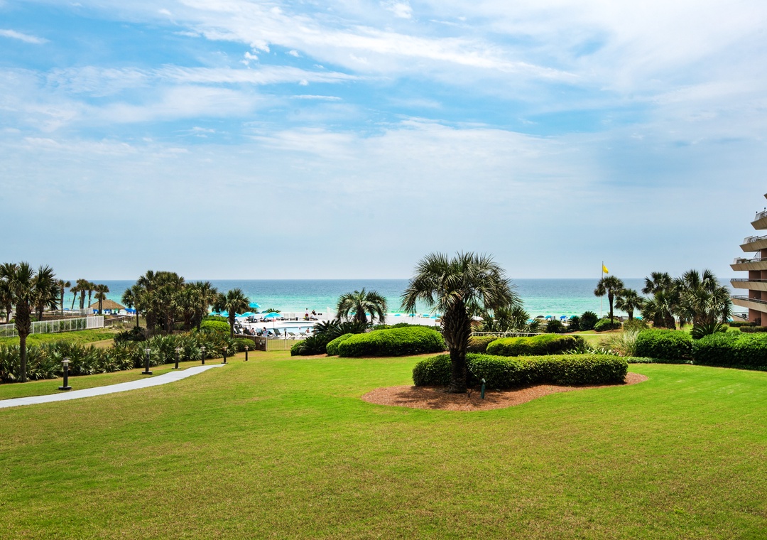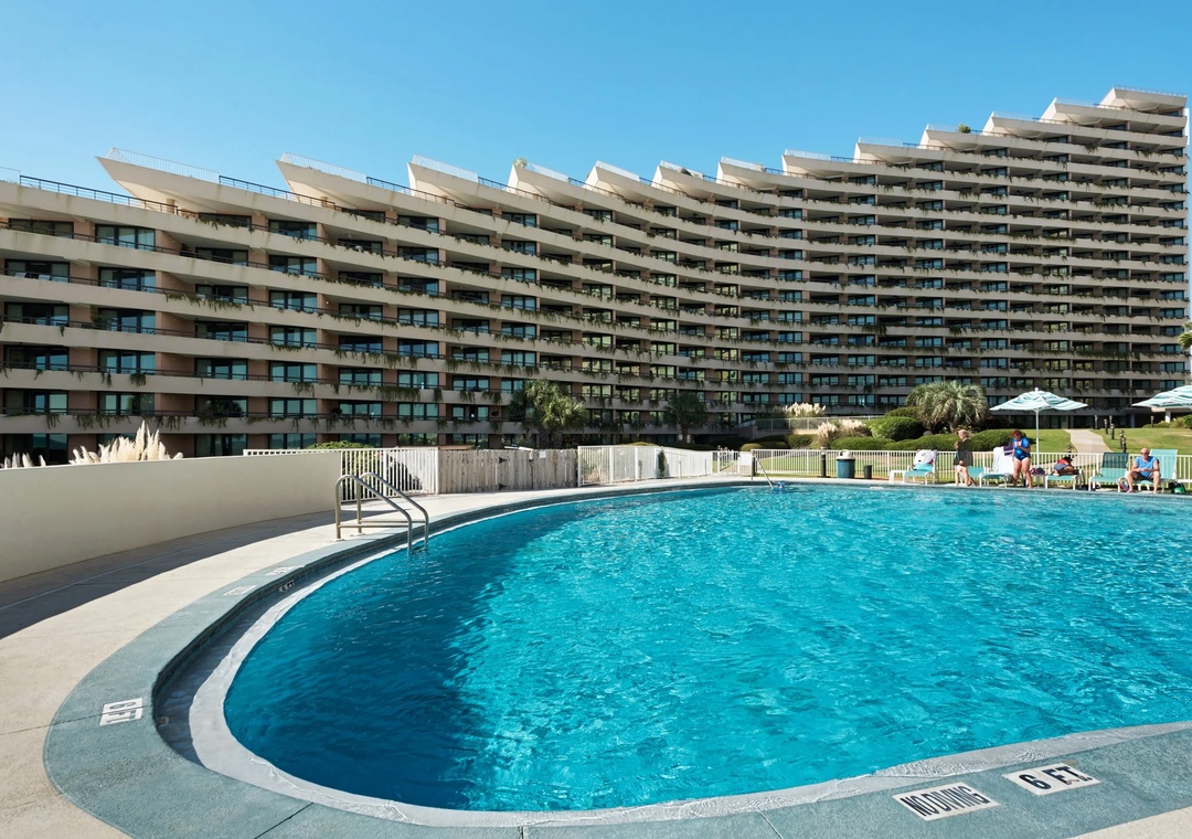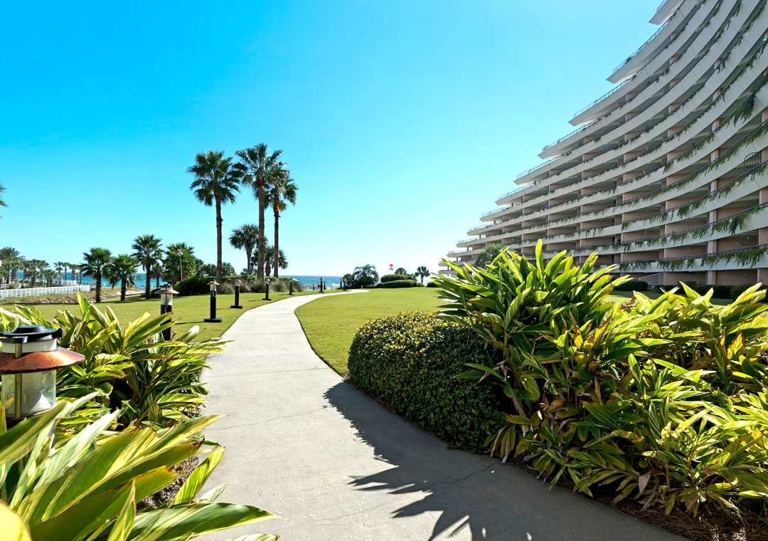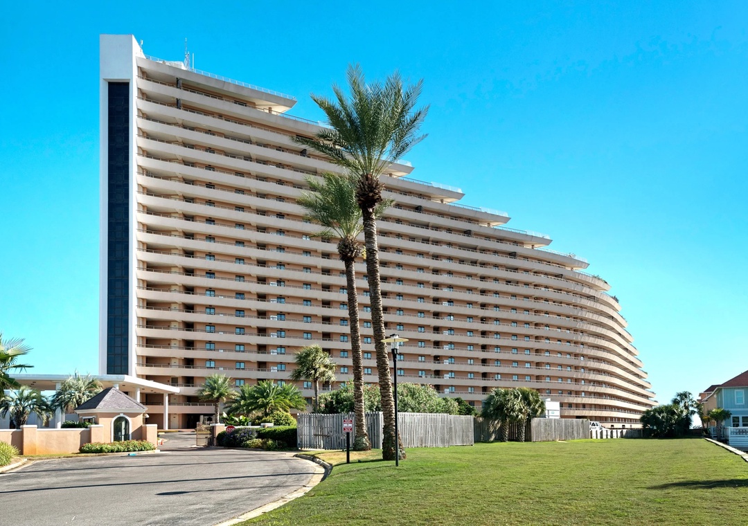 Edgewater on Miramar Beach is an architectural masterpiece that rises up in a step-like fashion to nineteen stories in height with open-ended terraces. The entire crescent-shaped building wraps around lagoon-shaped swimming pools and hot tubs that glisten beside the gulf. The Edgewater grounds extend from the building towards the sugar white sands with expansive lush lawns accented with towering palms and other tropical plants. There is also a seasonal Tiki Bar and Grill that is open in the Spring and Summer. Edgewater is also within walking distance to popular local restaurants, grocery stores, and shopping at Silver Sands Premium Outlet and Grand Boulevard.