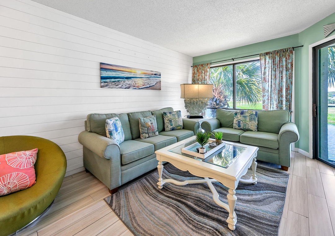 Beautiful beach themed place. Great access to beach and pools. Great location to shopping. Overlook small pond with lots of turtles and huge fish you can see from the balcony. The tram that takes you to the main condos/beach/bigger pools was located right in front of the condo, just steps away, they make there rounds every 15 minutes or so, make sure you tip your driver- Tim was great! This was perfect. You could also walk, not far from the beach either. There is also a small pool just outside the condo we uses quite a bit too.You will be provided bracelets to keep on yourself while using the amenities on the property. Do not lose them, $100 to replace one.. New washer dryer, plenty of appliances, kitchenware to use. The only negatives was that it states sleeps 9 and it does but the pull out couch bed is paper thin. We went to Walmart and picked up an air mattress. Parking is only for 2 cars and you will get only two parking passes, well we had a third car but they give you other parking options, you pay for it but there is one that is like a block from the condo next to Burger King and the condos. So that wasn’t an issue really. We reserved a spot for a week and I think it was $42. Security is great as well, if you don’t have a pass they don’t let you in. Overall would recommend 10/10!- Reviewed On: 7/31/2022