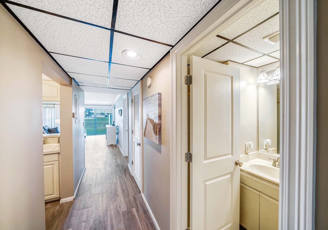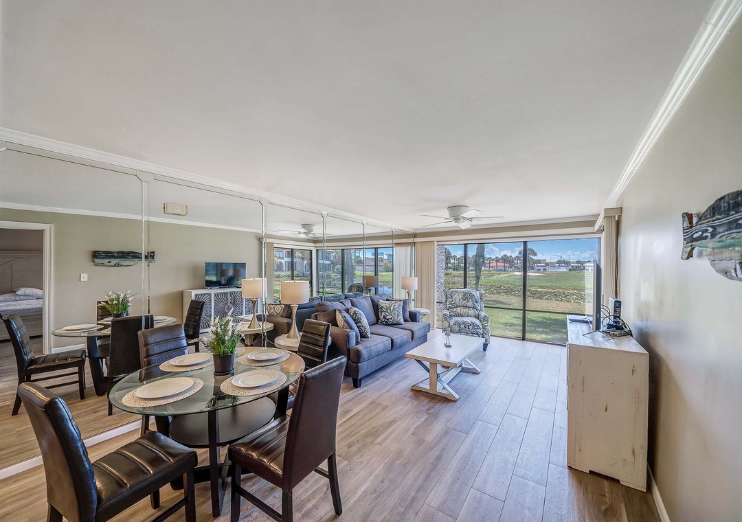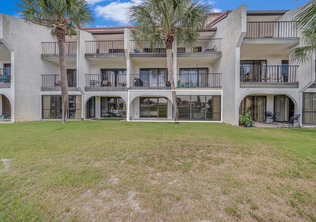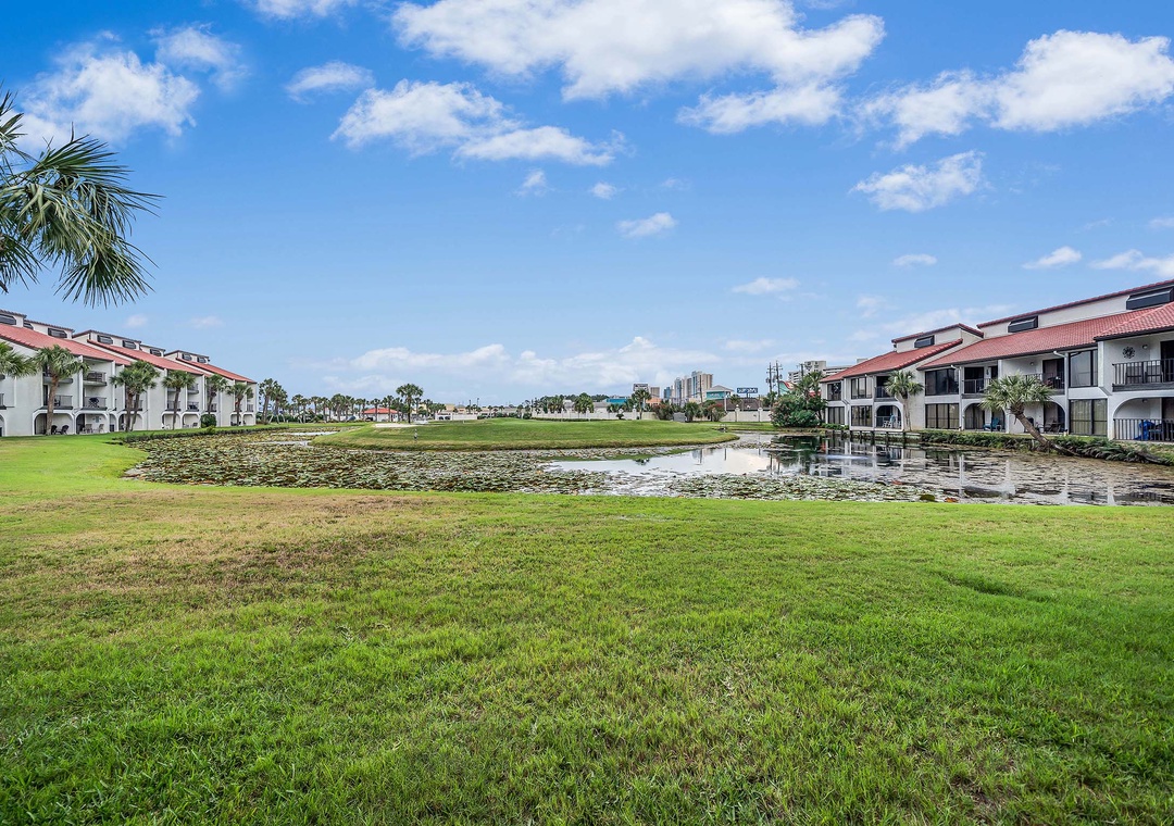 The Salt Life Escape is the perfect place to enjoy the beach, play golf, or just relax! Located on the 1st floor of a 2-story complex, in the Edgewater Beach and Golf Resort, this 1BR/2BA villa offers a spacious living area and fully equipped kitchen. Step through the sliding glass doors to your private, covered patio overlooking the lush greens and pond of the golf course. This is the perfect spot for a fresh cup of coffee with the sunrise, where you may catch sight of turtles and native birds. With two queen beds in the master bedroom, a queen sleeper sofa in the living room, this condo sleeps 6 guests comfortably. Edgewater Golf Villa 303 is set up for a quick getaway with friends or a fun vacation for a small family. You'll also be just steps from one of the onsite community pools! Have the vacation of a lifetime at Edgewater Golf Villa 303 - The Salt Life Escape!