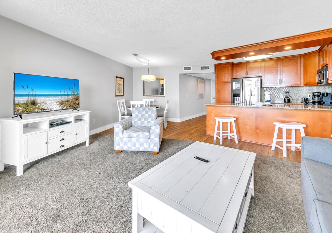 Edgewater 1-305 is a stunning 2BR/2BA beachfront condo located in the renowned Edgewater Beach and Golf Resort. Situated on the third floor, this unit features a spacious balcony with breathtaking views of the Gulf and lagoon pool. The living room is adorned with floor-to-ceiling windows, flooding the space with natural light and showcasing the gorgeous surroundings. Inside, you’ll find cozy furnishings, a well-equipped kitchen with granite countertops, and a peninsula bar with seating. Accommodations include a king bed in the master bedroom, a queen bed in the guest bedroom, and a queen sleeper sofa in the living room, comfortably sleeping up to six guests. Relax with panoramic Gulf views, swim in the lagoon pool, and enjoy the array of activities that Edgewater Beach and Golf Resort has to offer—your perfect getaway awaits at Edgewater 1-305!