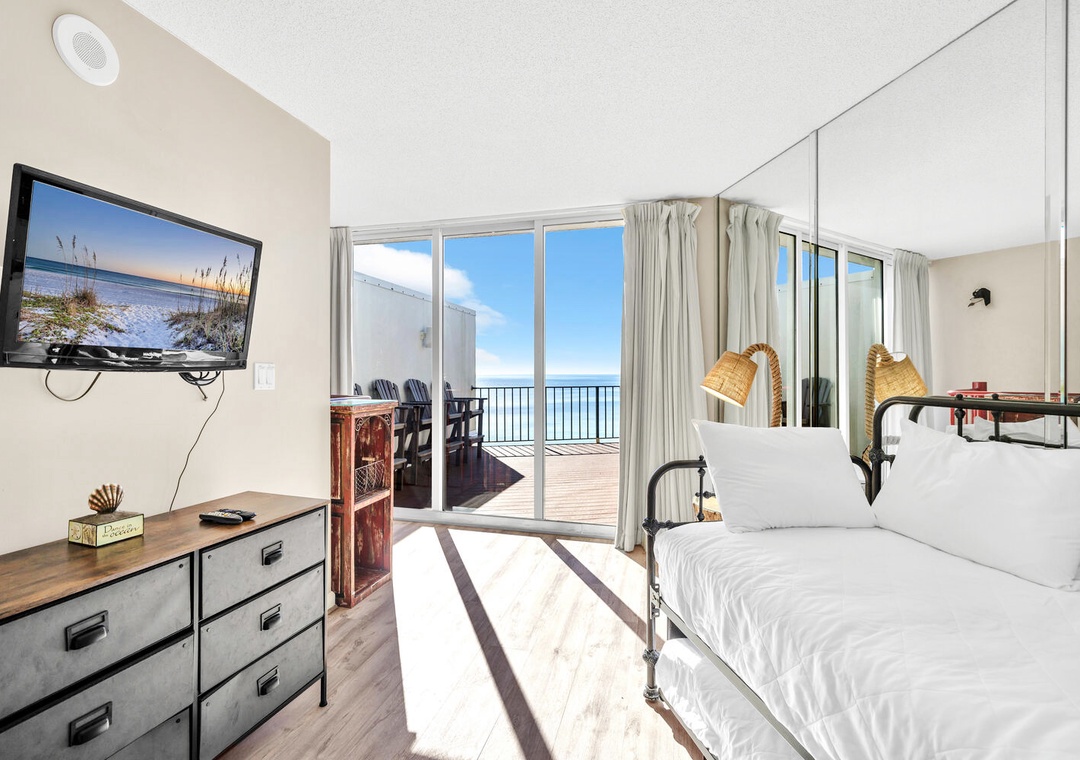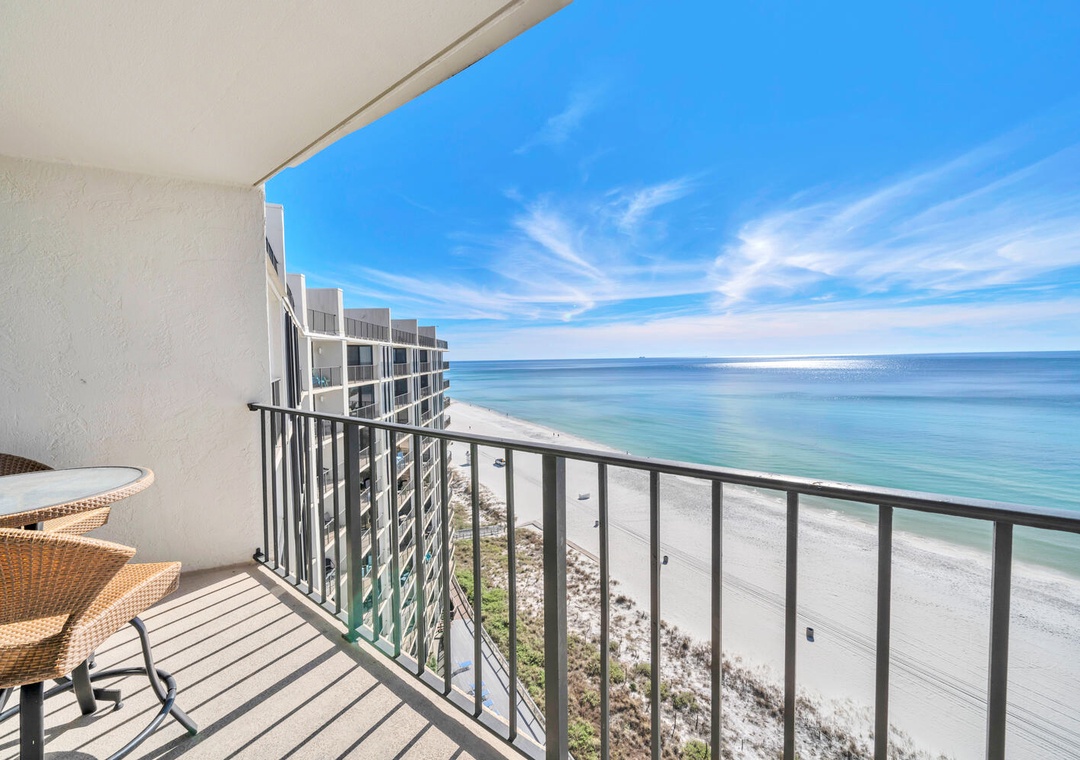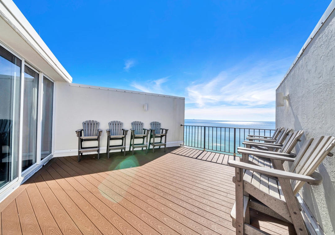 Welcome to Edgewater 2-1208, a beautiful penthouse unit with 3 Bedrooms and 3 bathrooms. Enjoy incredible gulf views and sunsets from this 2 story condo located in tower #2 in the spectacular Edgewater Beach and Golf Resort in Panama City Beach! Walk in and be WOW'd by the floor to ceiling glass doors with unparalleled Gulf views! On the main level you will find the fully equipped kitchen, master suite, guest bedroom, and living room with balcony access. The beautiful master suite includes a king bed and ensuite bathroom while the guest bedroom has a queen bed and ensuite bathroom. For extra sleeping room, there is a comfy queen sized sofa sleeper in the living room. The charming spiral staircase leads up to the loft bedroom with a day bed + trundle, wet bar, 3rd bathroom, and the spacious rooftop deck for more incredible views! This spacious condo sleeps 8 comfortably. This unit also has a full sized washer and dryer for you convenience. Come see why families vacation year after year at Edgewater 2-1208!!!