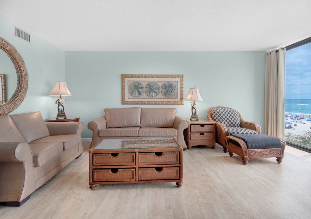 Edgewater 2-307 is a beachfront 2BR/2BA condo in Edgewater Beach and Golf Resort. This unit has a spacious balcony overlooking the Gulf and boasts stunning floor-to-ceiling windows in the living room! You’ll find comfortable furnishings throughout and a well-appointed kitchen with granite counters and stainless-steel appliances. With a king bed in the master bedroom, a queen bed in the guest bedroom, and a sleeper sofa in the living room, this condo sleeps up to 6 guests. Enjoy panoramic Gulf Front Views, take a dip in the beachfront lagoon pool, and explore the endless activities at Edgewater Beach and Golf Resort!