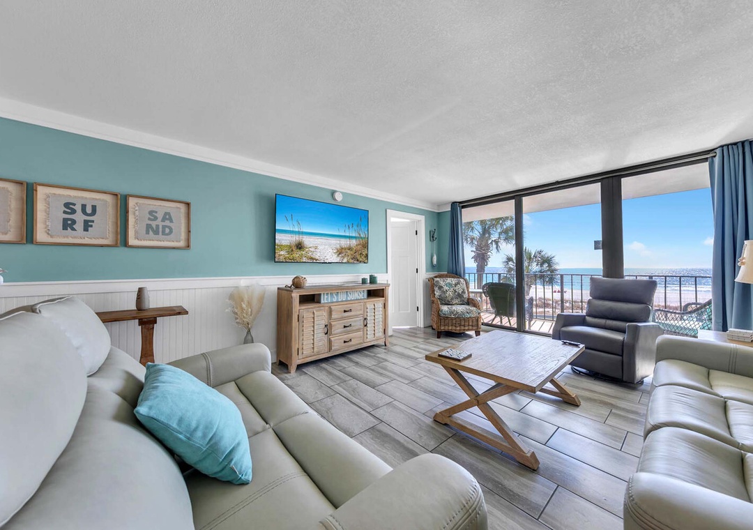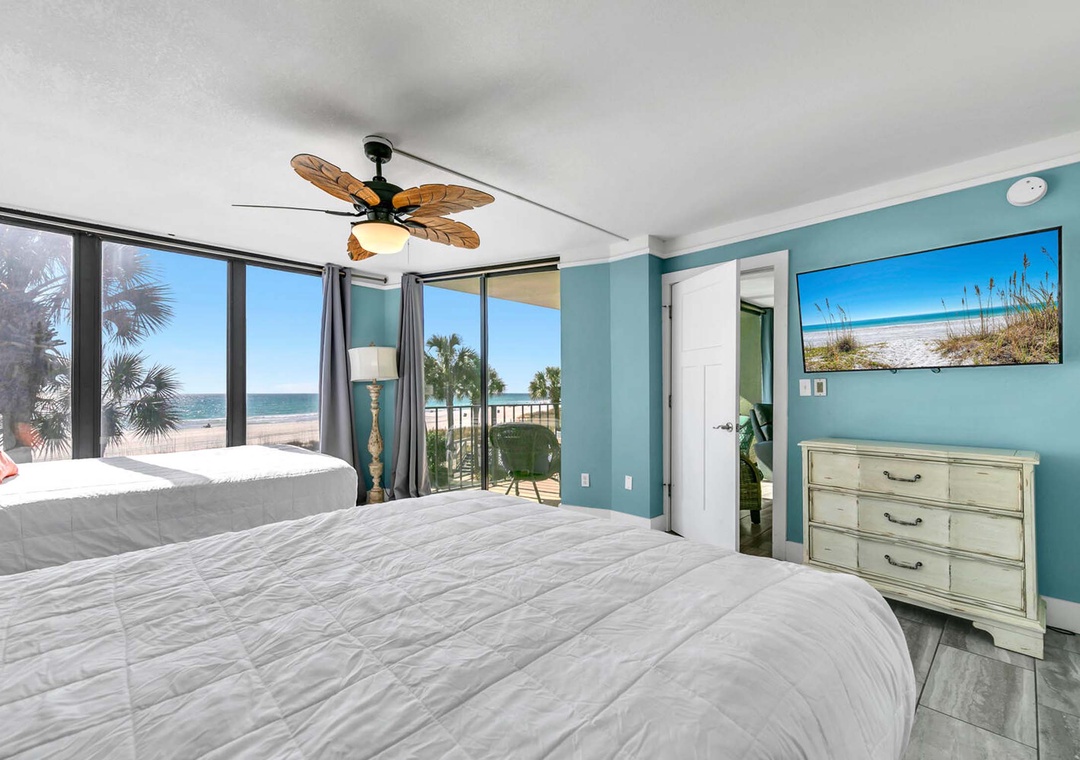 Overall, a great spot to spend some time in Panama City Beach. The room on the first floor was very convenient for access to the pool, hot tub, beach, and parking lot. Great view of the ocean and sunrise/sunsets. One small pool was just below the room so there was some activity and kids playing there at times. The room was very clean, nicely decorated, newer furniture, and the beds were comfortable. Also two nice large screen TVs. There was gated access and on site staff monitoring the grounds.