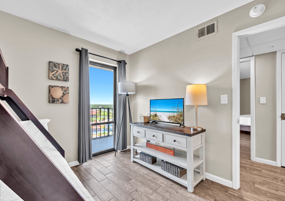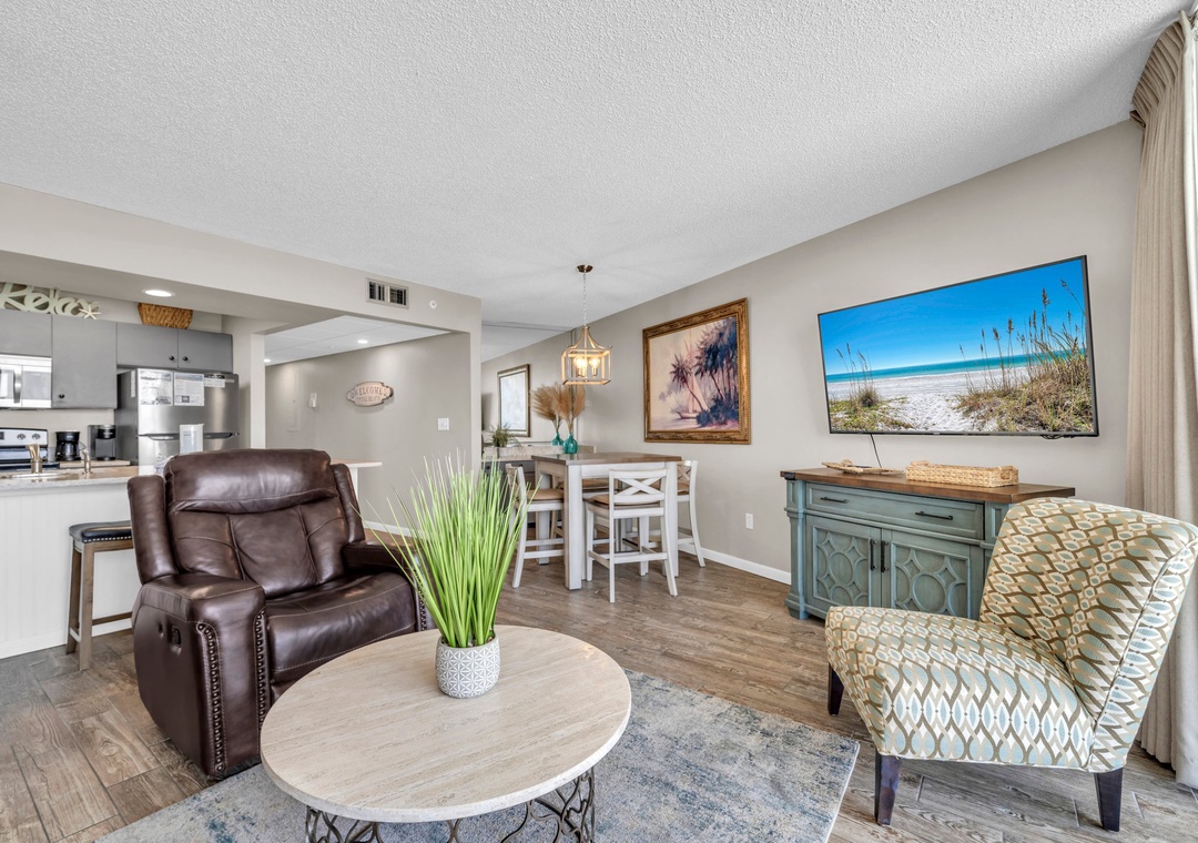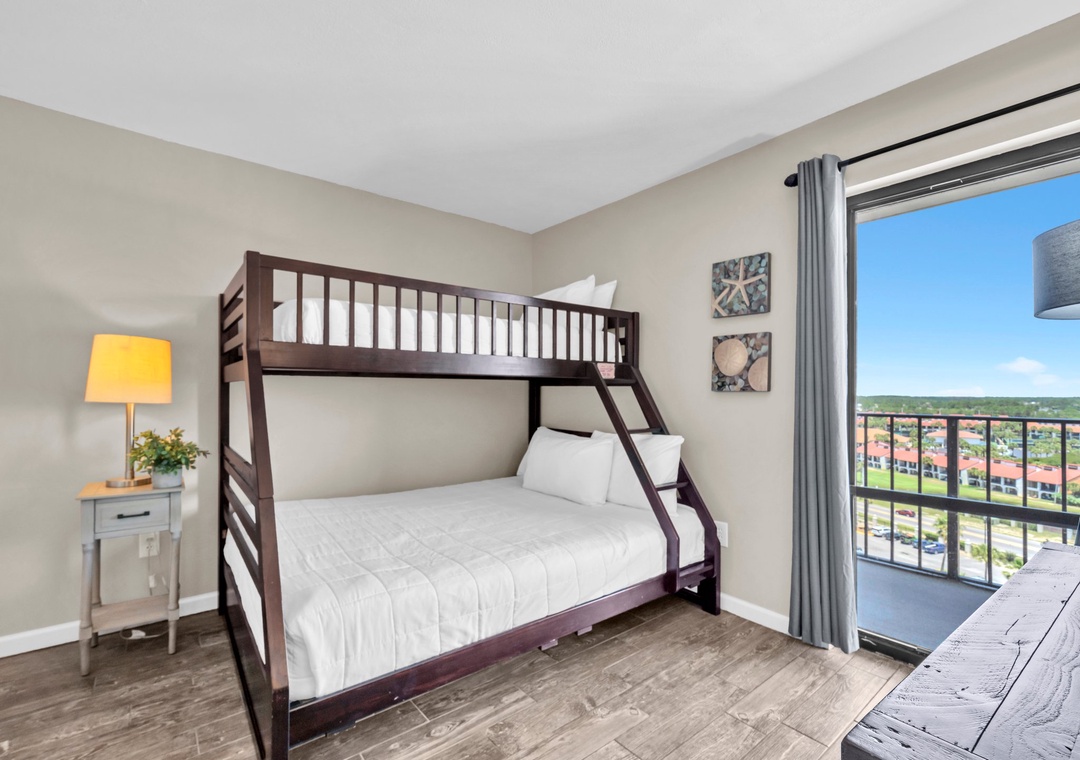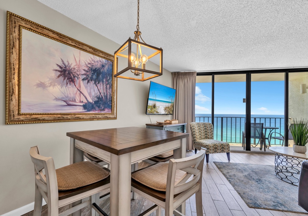 Experience coastal luxury in our oceanfront two-bedroom, two-bath condo boasting an open floor plan and coastal-inspired décor. Relax in the spacious living room with a 55” Smart TV and amazing panoramic gulf views or savor morning coffee on the balcony as you breathe in the salty air, emerald green waters, and white sandy beaches. The fully equipped kitchen features stainless steel appliances, all the utensils needed, and beautiful Corian countertops with bar seating adjacent to a bright dining area. The Master Bedroom is spacious, offering a king bed, Smart TV, and an en suite bathroom with a glass door walk-in shower. The guest bedroom sleeps three on a twin over queen bunk and has its own Smart TV with a shared bath and tub shower combo. South of Heaven comfortably accommodates up to five guests.