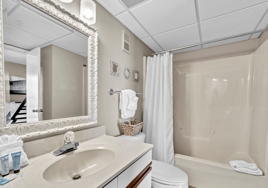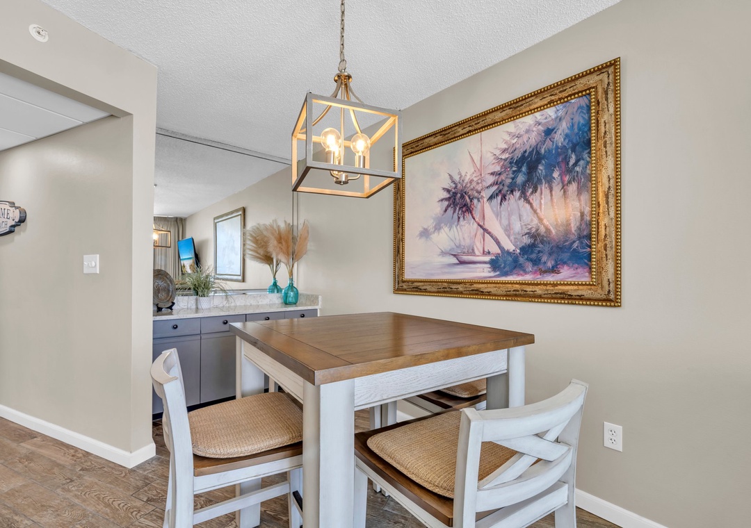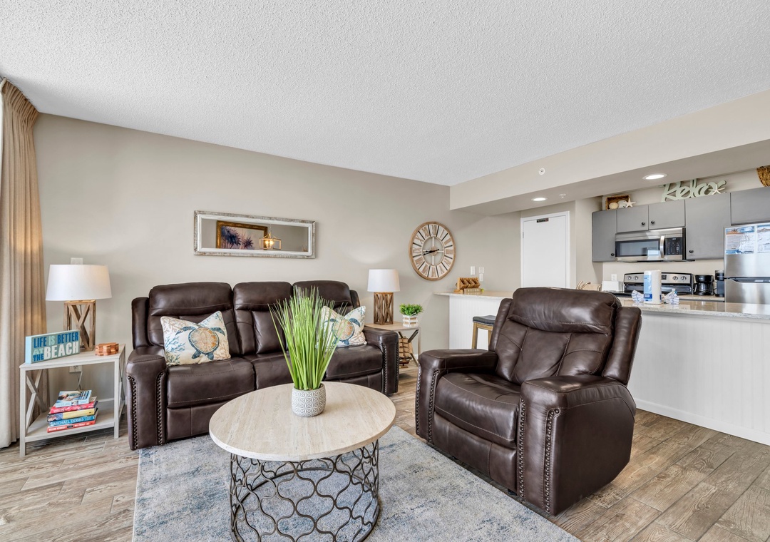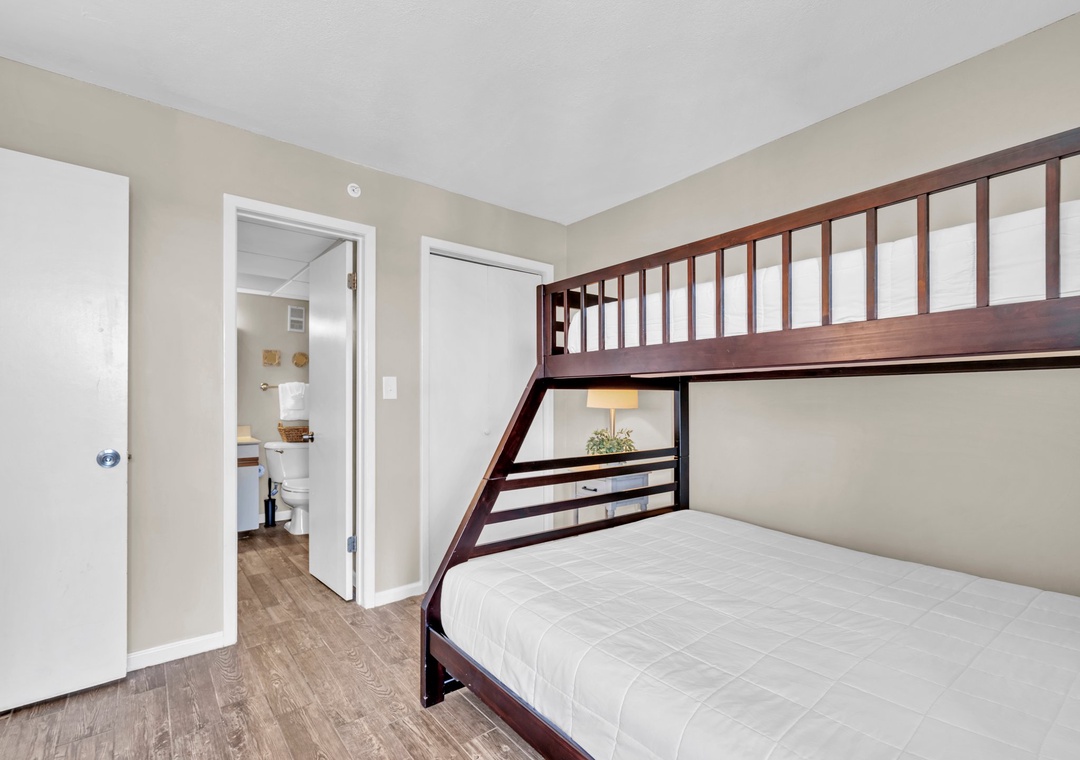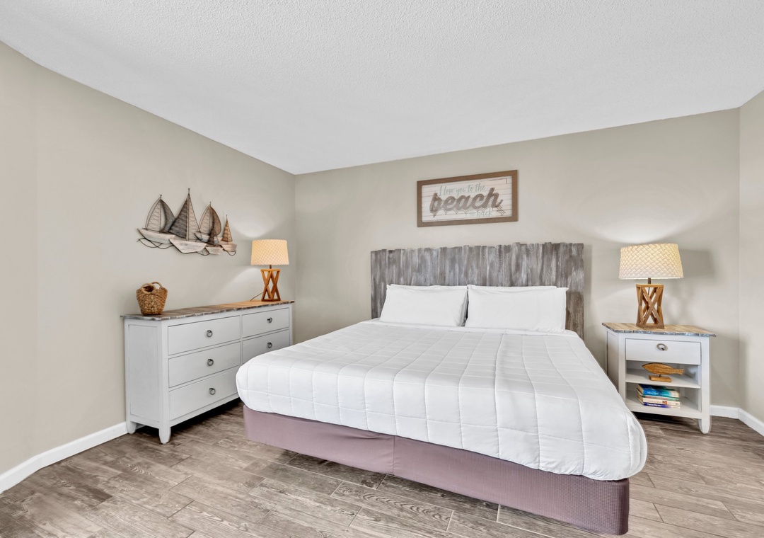 Experience coastal luxury in our oceanfront two-bedroom, two-bath condo boasting an open floor plan and coastal-inspired décor. Relax in the spacious living room with a 55” Smart TV and amazing panoramic gulf views or savor morning coffee on the balcony as you breathe in the salty air, emerald green waters, and white sandy beaches. The fully equipped kitchen features stainless steel appliances, all the utensils needed, and beautiful Corian countertops with bar seating adjacent to a bright dining area. The Master Bedroom is spacious, offering a king bed, Smart TV, and an en suite bathroom with a glass door walk-in shower. The guest bedroom sleeps three on a twin over queen bunk and has its own Smart TV with a shared bath and tub shower combo. South of Heaven comfortably accommodates up to five guests.