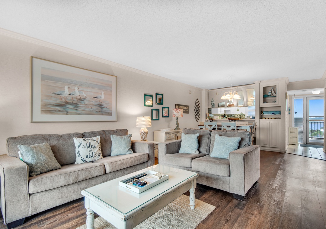 Come relax at Emerald Isle 708. This gorgeous 2BR/2BA Gulf-front condo offers a spacious king master suite with en-suite bath and balcony access and a guest bedroom with a queen bed w/ twin bunk beds. Including the fold out sofa in the living room, you can comfortably sleep up to 8 guests. The unit has comfortable seating for up to 8 when you enjoy a homecooked meal from the fully stocked kitchen. Water views can be found in every room and are sure to make you want to stay longer especially the direct ocean view from the penthouse patio. The unit includes a premier parking spot close to the elevators and it’s the first unit you come to off the elevator. Also, the laundry is very close by. Convenience is the name of the game in Emerald Isle 708.