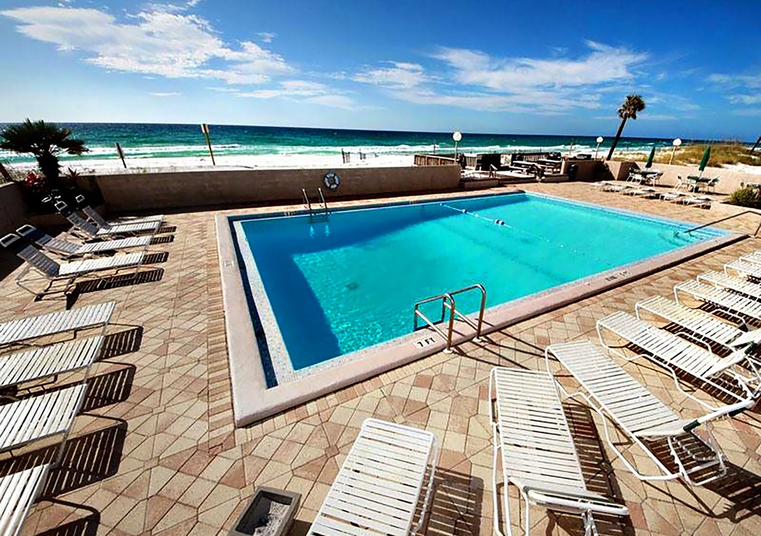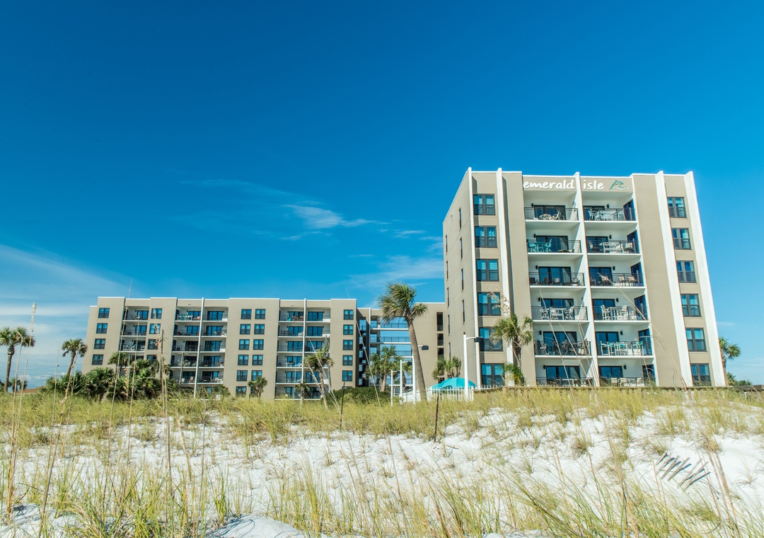 The Emerald Isle complex is situated right on the beach on gorgeous Okaloosa Island! Western view is of the Destin Sound- part of the Intercoastal Waterway, overlooking yachts, fishing craft, and beach homes. The beachside pool is spectacular with a handy ramp down to the beach for easy access. The pool area has plenty of lounge chairs and a picnic area complete with grills for a juicy steak on a balmy night.