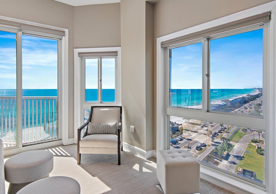 Sea Forever is located in the exclusive complex of Empress on the shores of Miramar Beach and offers spectacular views of the Gulf of Mexico and Lake Stewart! This immaculate 3 bedroom, 3 bath, beachfront condo features 10ft ceilings and two spacious living rooms with balcony access showcasing views of the Gulf and the Bay! Located directly across the street from the beach, enjoy endless blue coastline views from one side of the condo and views of the lake from the other! Both living areas have ample seating and are centered around a large flat-screen TV. The bright white kitchen is upgraded with custom cabinetry, marble countertops, and stainless steel appliances. There is also a wet bar off the kitchen, so you can whip up your favorite beverage to enjoy on one of the balconies. This corner unit allows you to be surrounded by ocean views from the king master bedroom which also features a jetted tub, separate shower, dual vanities, and walk-in closets. The second master bedroom has a king bed, ensuite bathroom, and balcony access facing the beach! The guest bedroom has a king beds and panoramic windows of the bay. There's also a queen size sofa sleeper in one of the living areas, allowing for sleep accommodations at a maximum of 8 guests! You will also find a washer and dryer in the unit for additional convenience. Come find your perfect vacation spot at Sea Forever!