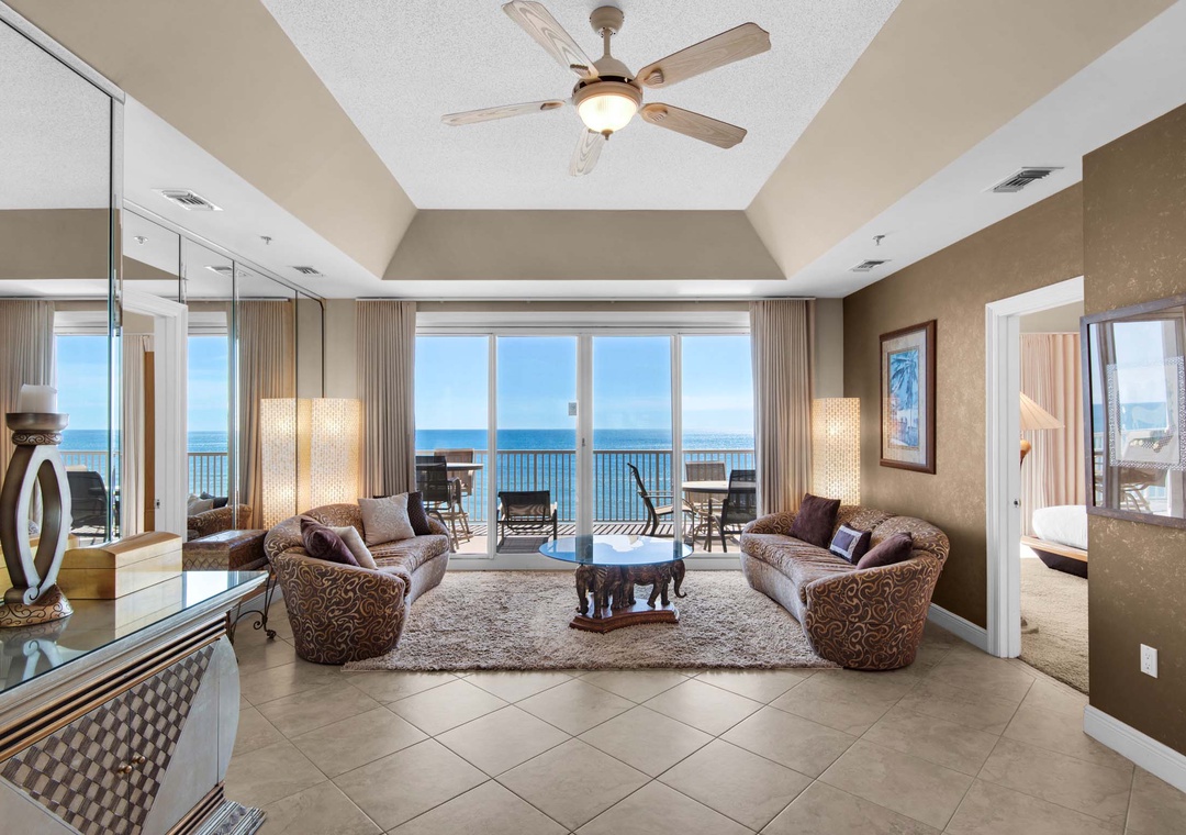 Welcome to Empress 803, a stunning vacation retreat in the exclusive Empress complex on the shores of Miramar Beach. This immaculate 3-bedroom, 3-bath condo offers breathtaking views of both the Gulf of Mexico and the Bay. With 10-foot ceilings and two spacious living areas, you’ll have plenty of room to relax and take in the scenery. Step onto the balcony with your morning coffee and watch for dolphins gliding through the waves. Both living areas provide ample seating and a large flat-screen TV, creating a comfortable space to unwind after a day at the beach.