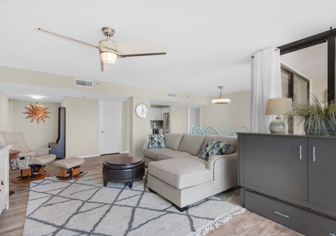 If you're looking for a family-friendly place to call your next home away from home look no further than Enclave 302B a 2BR, 2BA condo located right across the street from Crystal Beach! This beautifully furnished condo has an open floor plan that is great for entertaining. With a king bed in the master, and a guest bedroom with a king bed, and a Murphy bed in the living room, this unit can accommodate up to 6 guests comfortably. Prepare anything from your morning coffee to a full-course dinner in the well-equipped kitchen. Walk less than 200 yards to private beach access, swim in the pool, grill outdoors, or play a friendly game of tennis. Start making memories that will last a lifetime at Enclave 302B!