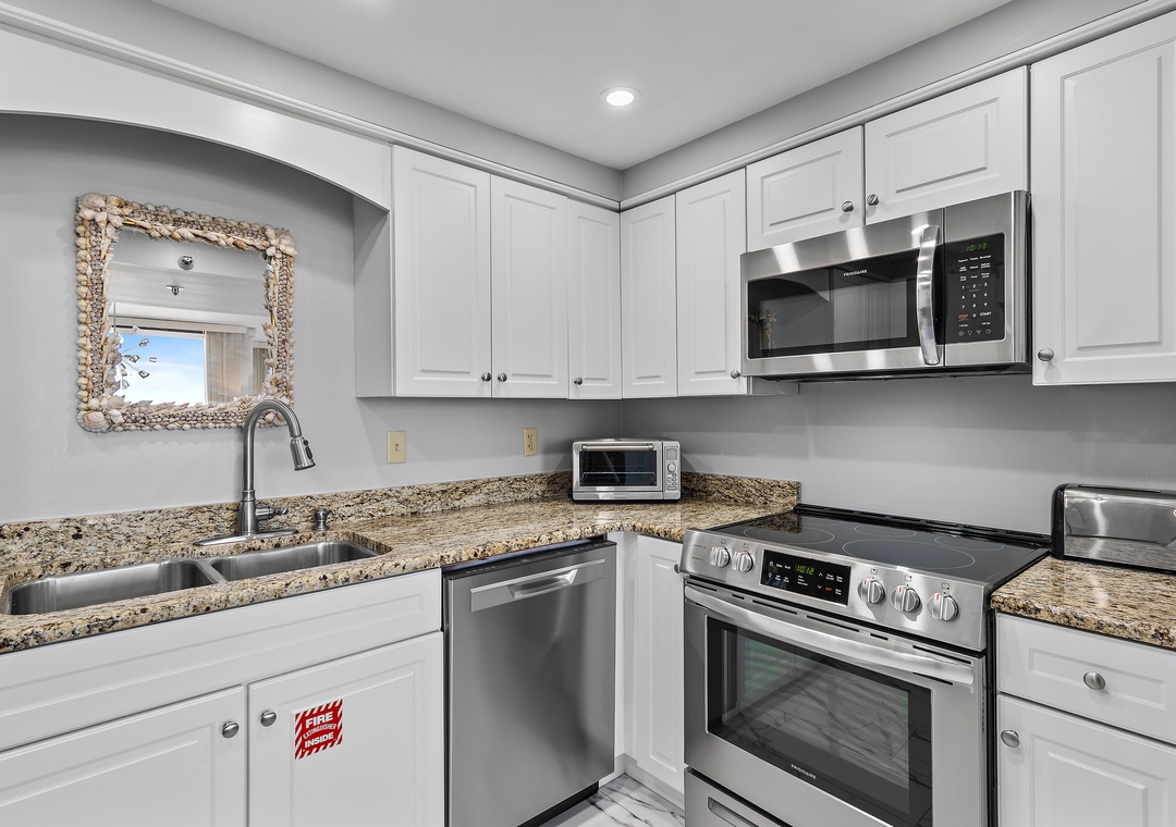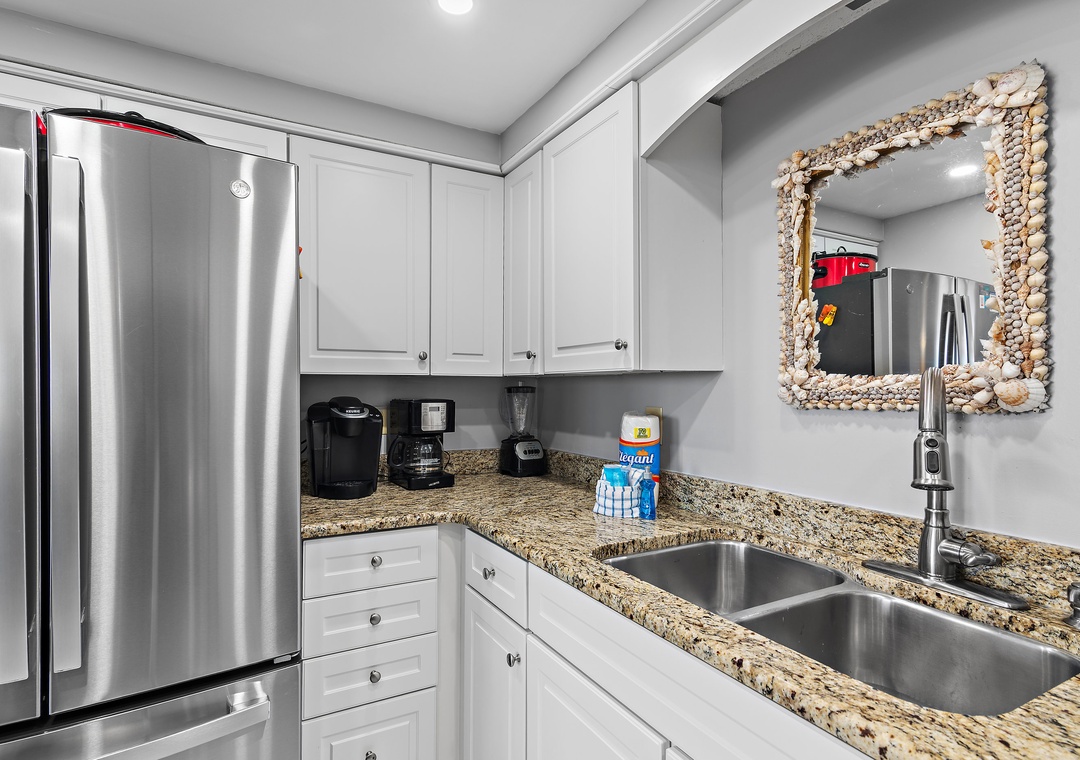 Thank you for your review, Melissa! We're happy you enjoyed the beautiful views, comfortable beds, and convenient beach and pool access. We appreciate your feedback about the kitchen and look forward to hosting you again.Real Joy staff