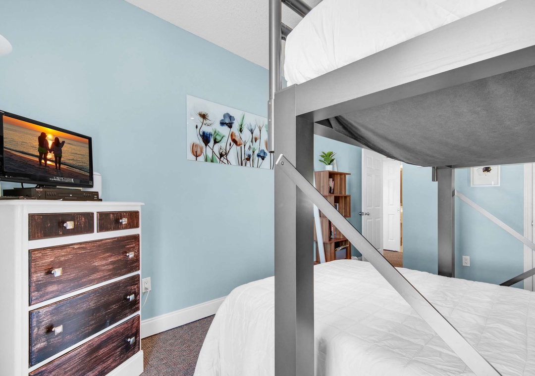 The master suite offers a king bed and private bathroom for restful nights. The guest bedroom features a double-over-queen bunk bed, making this home perfect for families or small groups. Comfortably sleeping up to 6 guests, there’s space for everyone to relax.