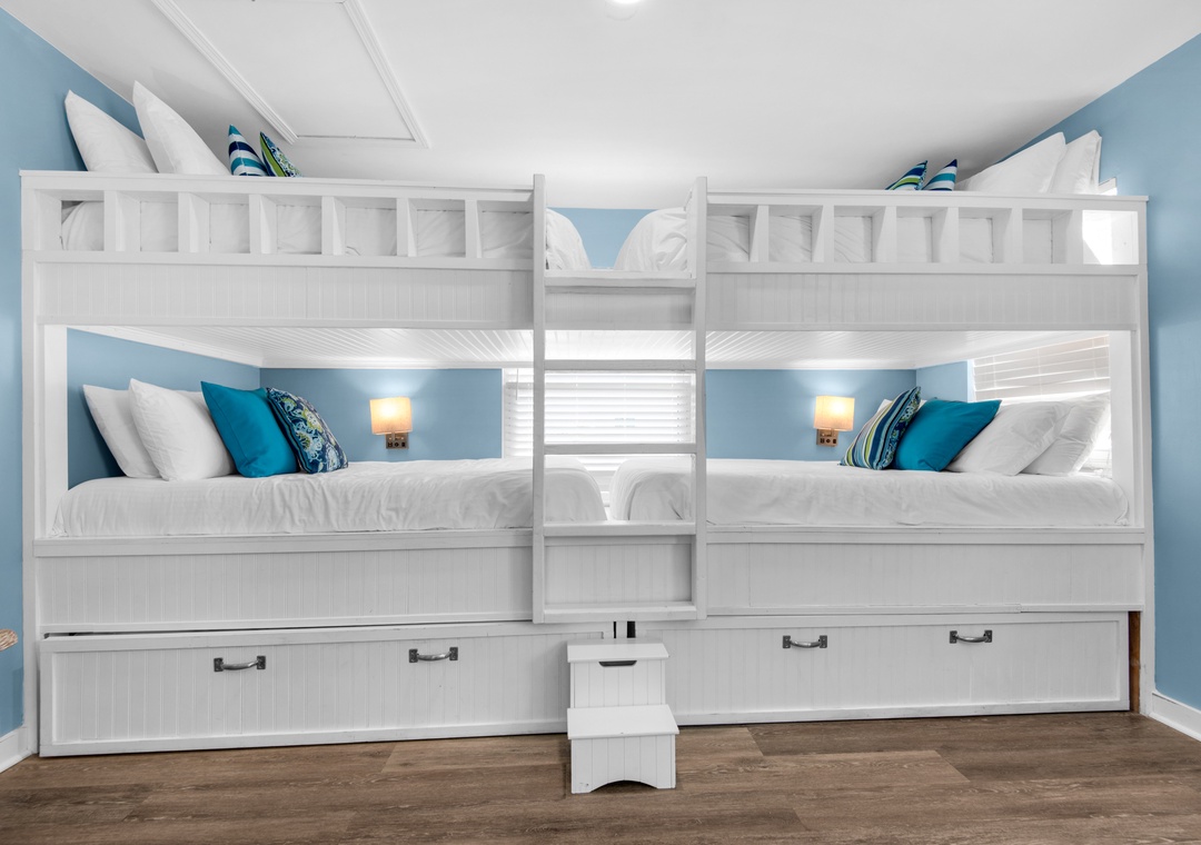 Open Loft Bedroom: 2 Full over Full Bunk Beds with Full Trundles, 1 Full Bed with Full Trundle underneath