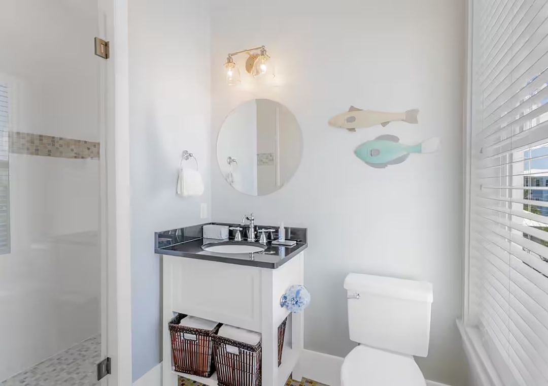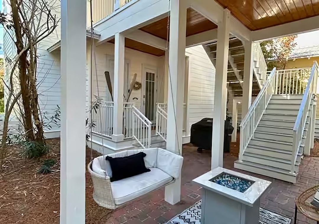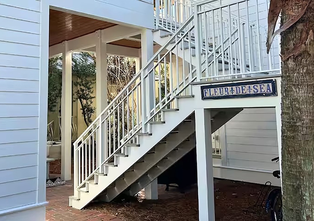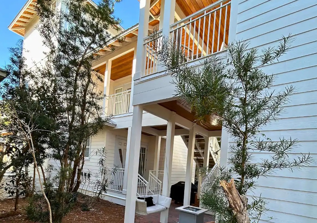Welcome to Fleur de Sea, a light-filled beach retreat with a private carriage house, tucked along a peaceful nature trail between Rosemary and Alys. This updated three-story main home plus carriage house offers five bedrooms — each with a private en-suite bath — plus a half bath on the first floor. Maximum occupancy is 12 guests. The third-floor bunk room is an open space and best suited for children. Enjoy five private balconies and porches, a cobblestone patio with rattan swing, gas grill, and fire pit, and a garage game room with ping pong, darts, and beach storage. Inside features wood floors, crisp white interiors, abundant natural light, and French doors throughout. The open living area features coastal accents and a 70” Smart TV. The dining table comfortably seats eight, and the kitchen features stainless steel appliances, bar seating, and a convenient countertop ice maker. Wonderful family memories in the making at Fleur de Sea!