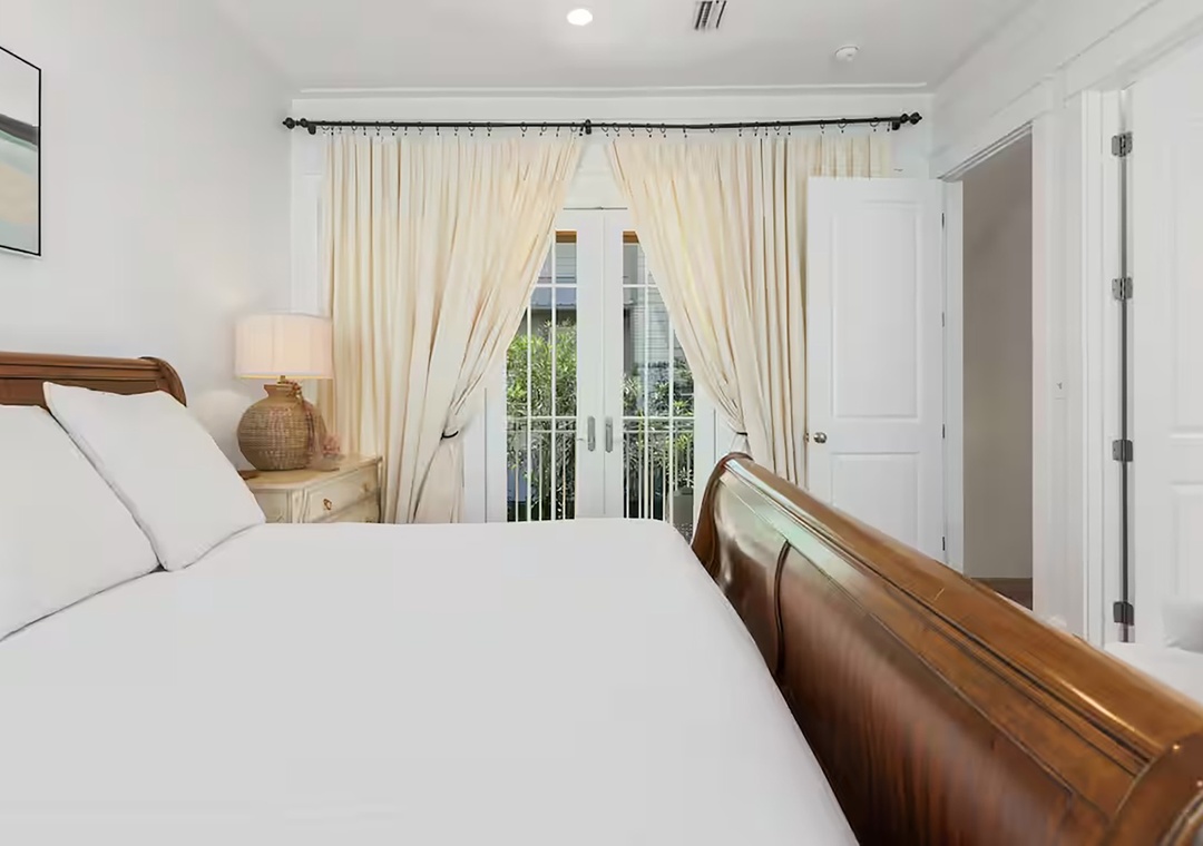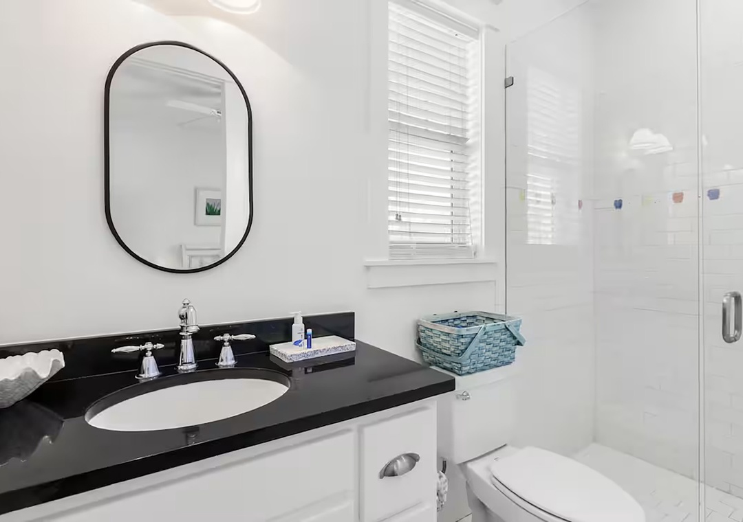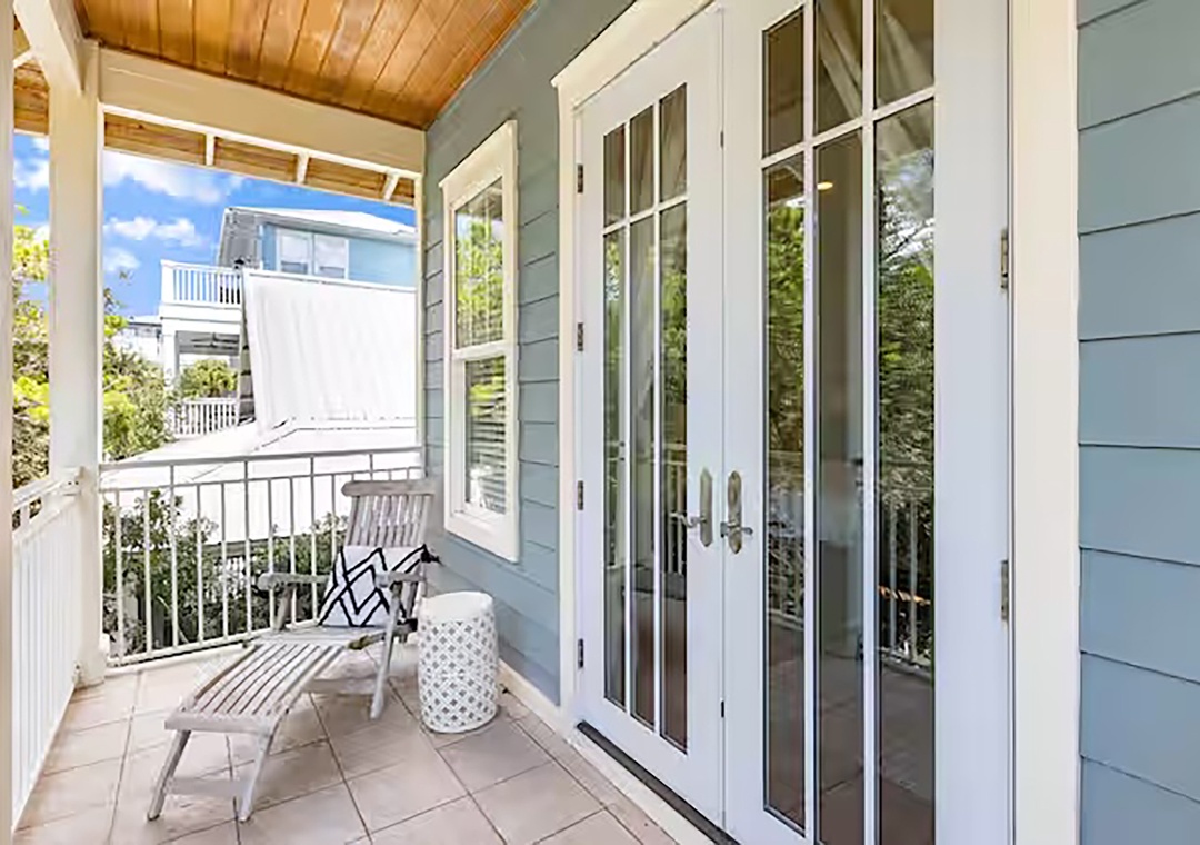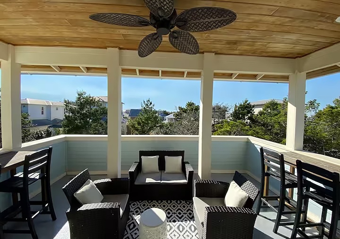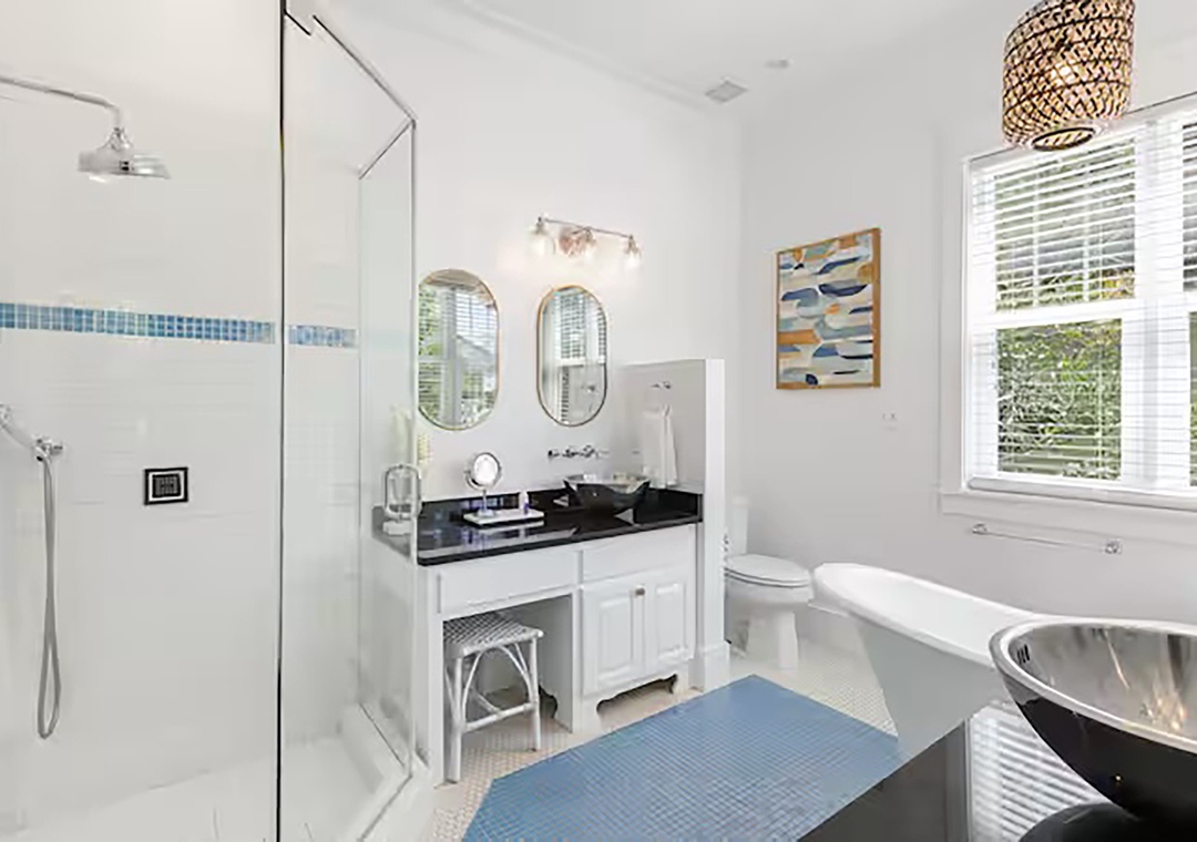 Welcome to Fleur de Sea, a light-filled beach retreat with a private carriage house, tucked along a peaceful nature trail between Rosemary and Alys. This updated three-story main home plus carriage house offers five bedrooms — each with a private en-suite bath — plus a half bath on the first floor. Maximum occupancy is 12 guests. The third-floor bunk room is an open space and best suited for children. Enjoy five private balconies and porches, a cobblestone patio with rattan swing, gas grill, and fire pit, and a garage game room with ping pong, darts, and beach storage. Inside features wood floors, crisp white interiors, abundant natural light, and French doors throughout. The open living area features coastal accents and a 70” Smart TV. The dining table comfortably seats eight, and the kitchen features stainless steel appliances, bar seating, and a convenient countertop ice maker. Wonderful family memories in the making at Fleur de Sea!