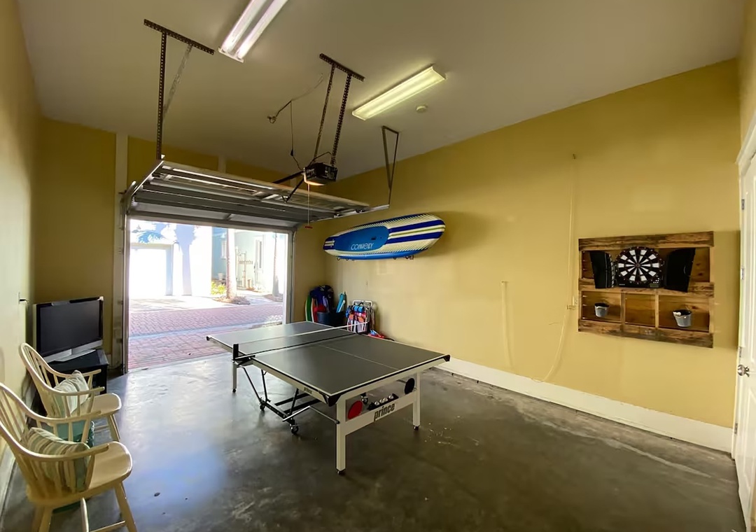 * Garage game room with ping pong, darts, beach gear, gas grill and fire pit