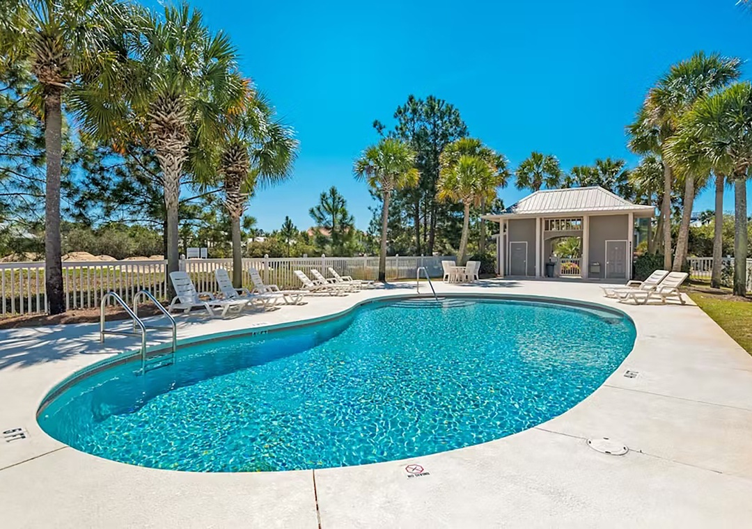 Sugar Beach is a South Walton neighborhood that resembles a tropical paradise, featuring lush landscaping throughout the community. All homes are just a short walk from a beautiful lagoon-shaped pool. The pool area is accessed through a gated, covered pergola, offering an elegant entrance with restroom facilities and showers for convenience. The sun-soaked pool patio is surrounded by tropical palm trees, providing a relaxing atmosphere for lounging. In addition to the community pool, the stunning crystalline white beach is just a short distance away. A public access point on Scenic 30A leads you to the shimmering shoreline and the emerald-toned waters of the Gulf, offering a perfect coastal retreat.