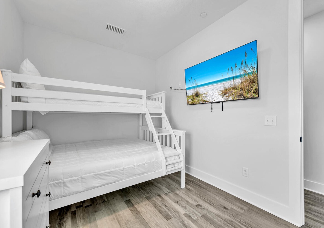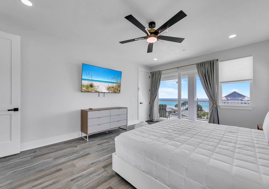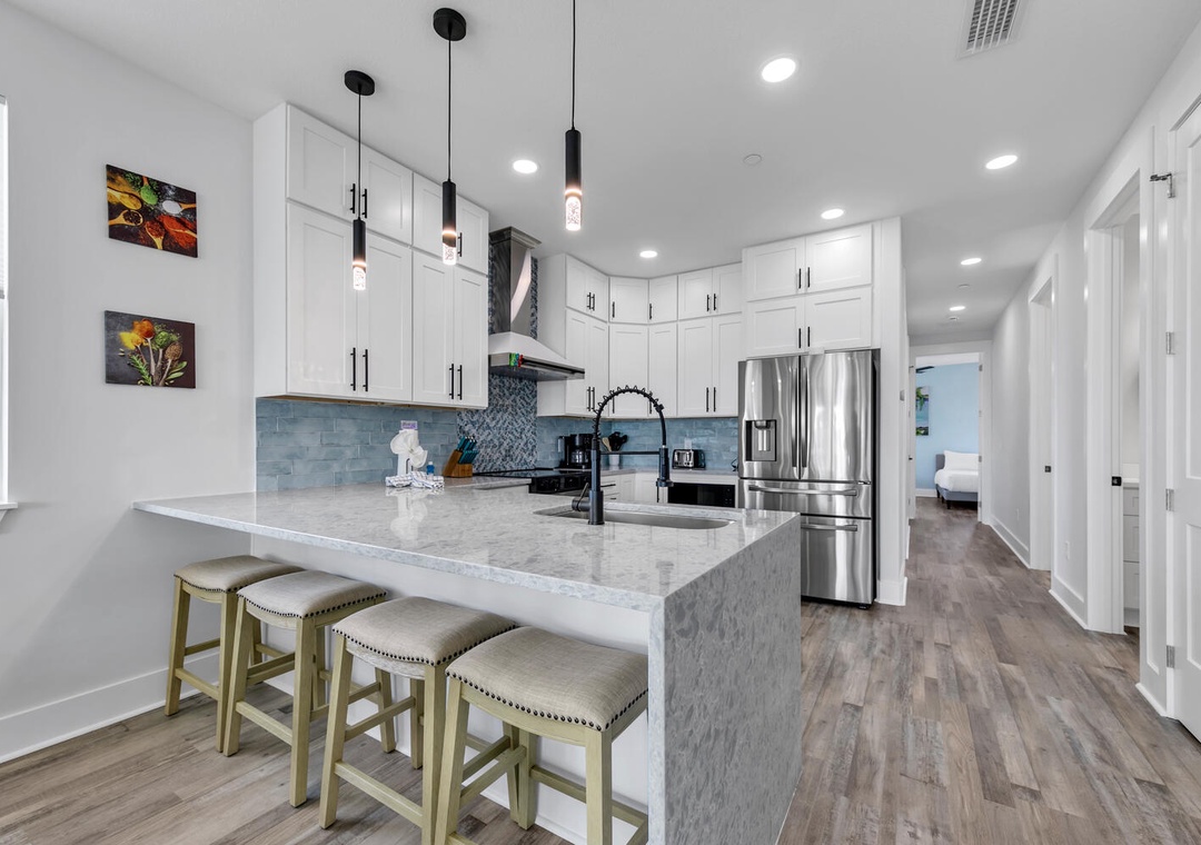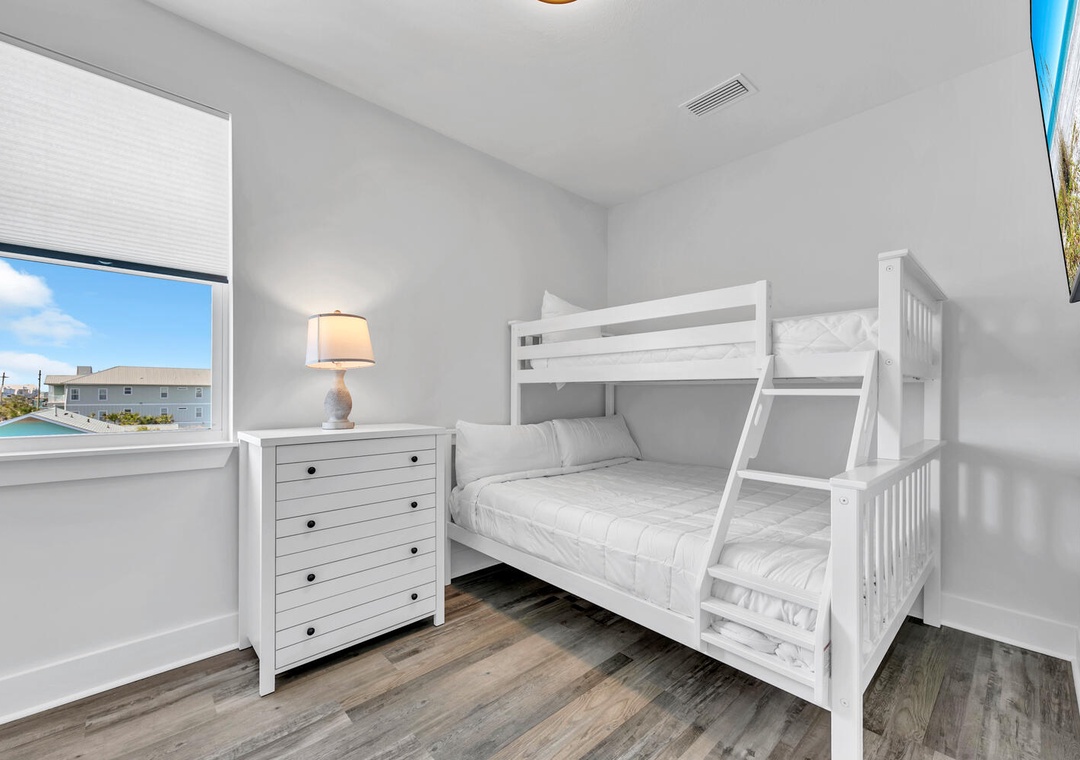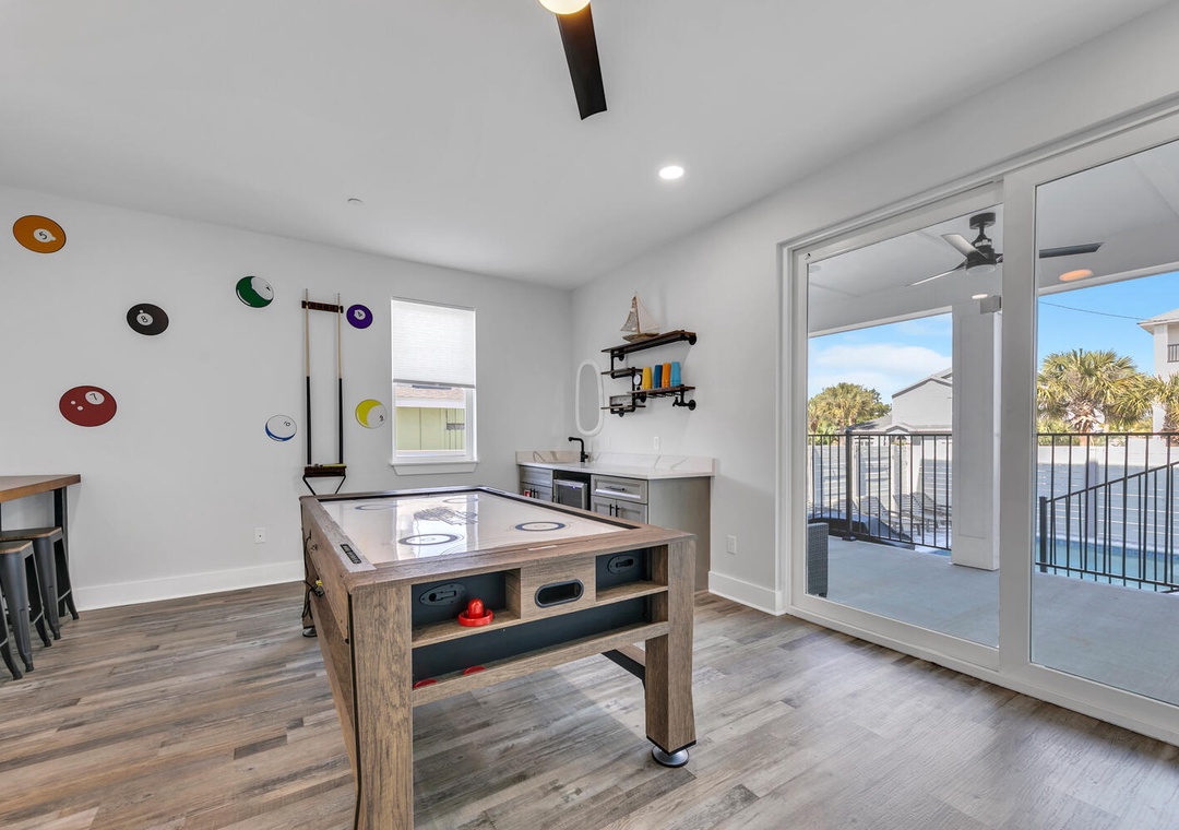 The first floor offers a large gathering space with a Game table that includes pool, ping pong, and air hockey and a Foosball table for hours of fun that also conveniently allows access to the back patio and the private pool. The first floor also includes a queen bedroom and en suite, another full bathroom, an office workspace and the first of two laundry rooms. The second floor offers the large open kitchen, living and dining area for family dinners, balcony to enjoy morning coffee or evening sunset watching. There is also a guest bedroom with a queen bed and another guest bedroom with two queen beds, as well as one full bath and one-half bath. The third floor brings you to the beautiful cozy King master with a private ensuite with exquisite high-end finishes and a private balcony overlooking the emerald green water of the Gulf! Further down the hall on this floor is a Wet Bar area with a wine cooler, a second laundry room and two more bedrooms - One bedroom with a Twin over king bunk and one with two more queen beds, and another full bathroom. In total, this unit can comfortably sleep up to 17 guests.